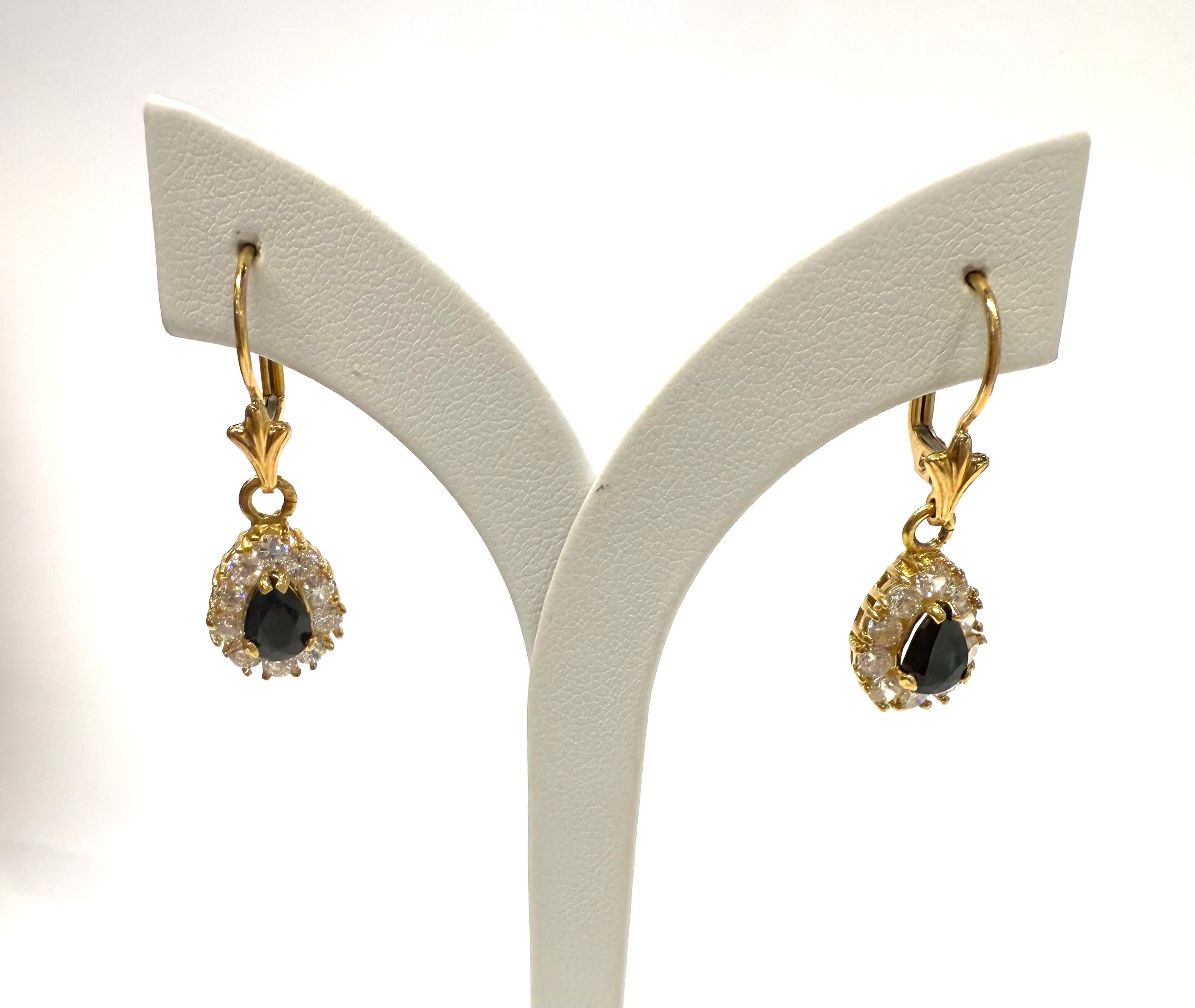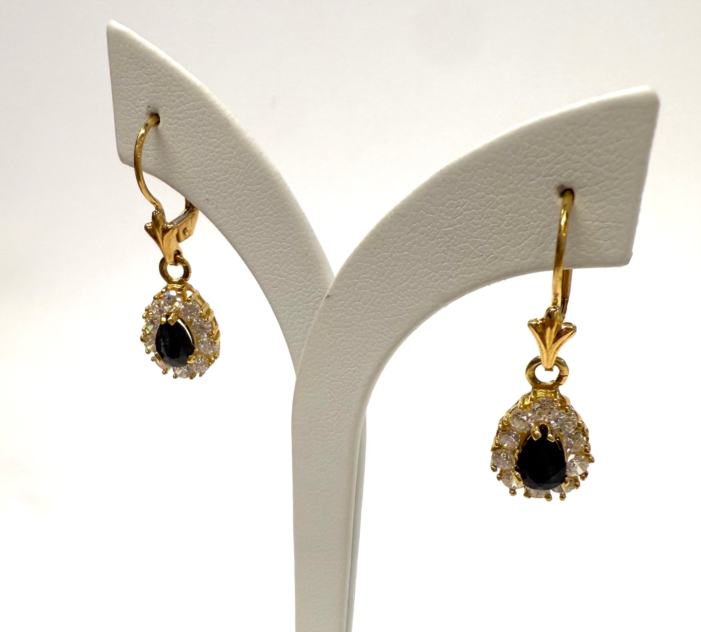 Boucles dormeuses en or jaune 18 carats (750/1000), poinçonnées 750, d’un poids total de 5,50 g. Chaque boucle mesure 3,2 cm de hauteur, 1 cm de largeur et 0,5 cm d’épaisseur. Elles sont serties d’un saphir et de 10 zirconiums par boucle. En très bon état.