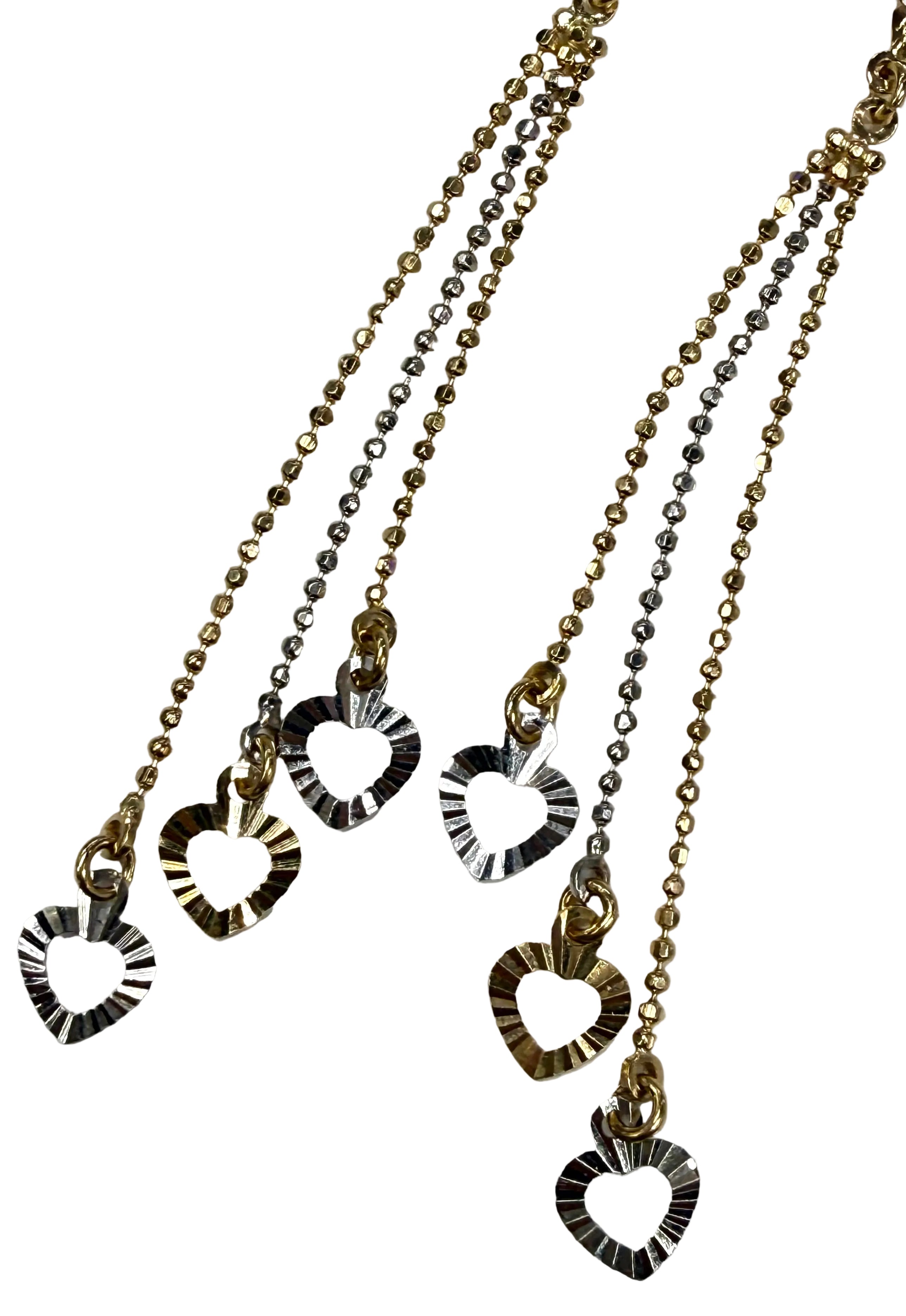 Boucles pendantes en or jaune et blanc 18 carats (poinçon 18K), fermoirs dormeuses. Dimensions 7,5 cm × 2 mm, poids 3,49 g. Très bon état, élégantes et raffinées.