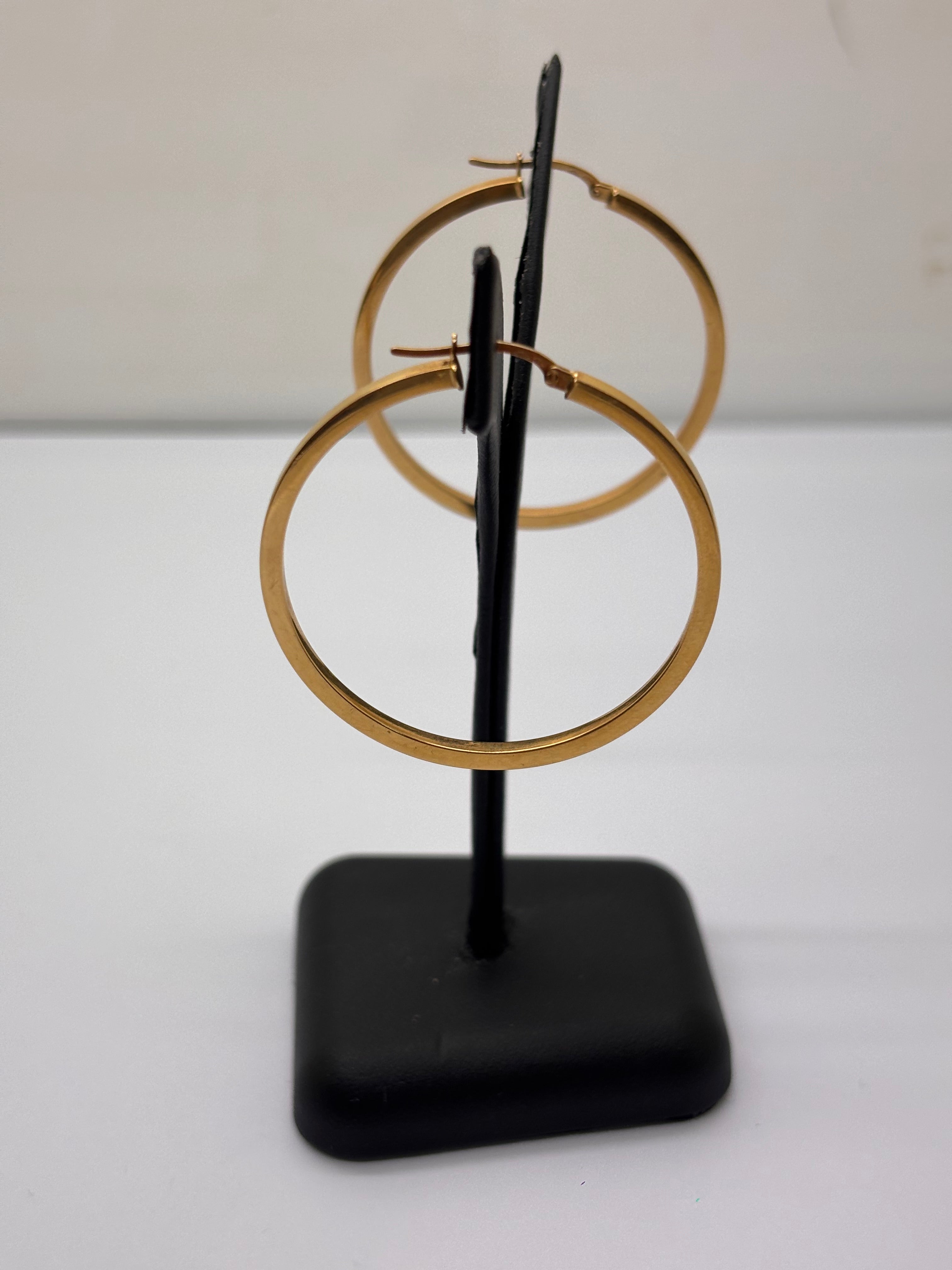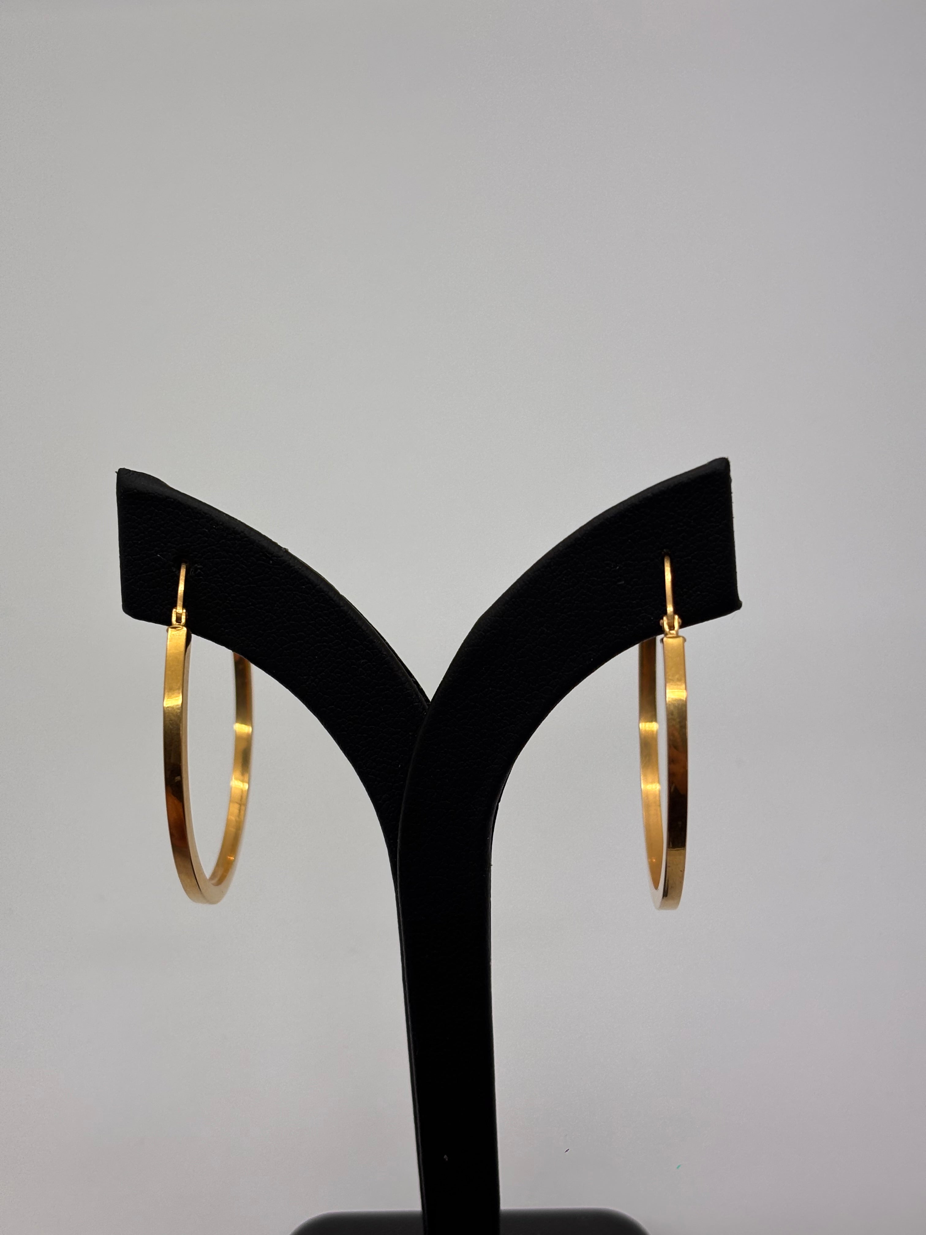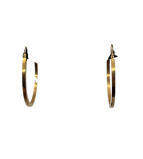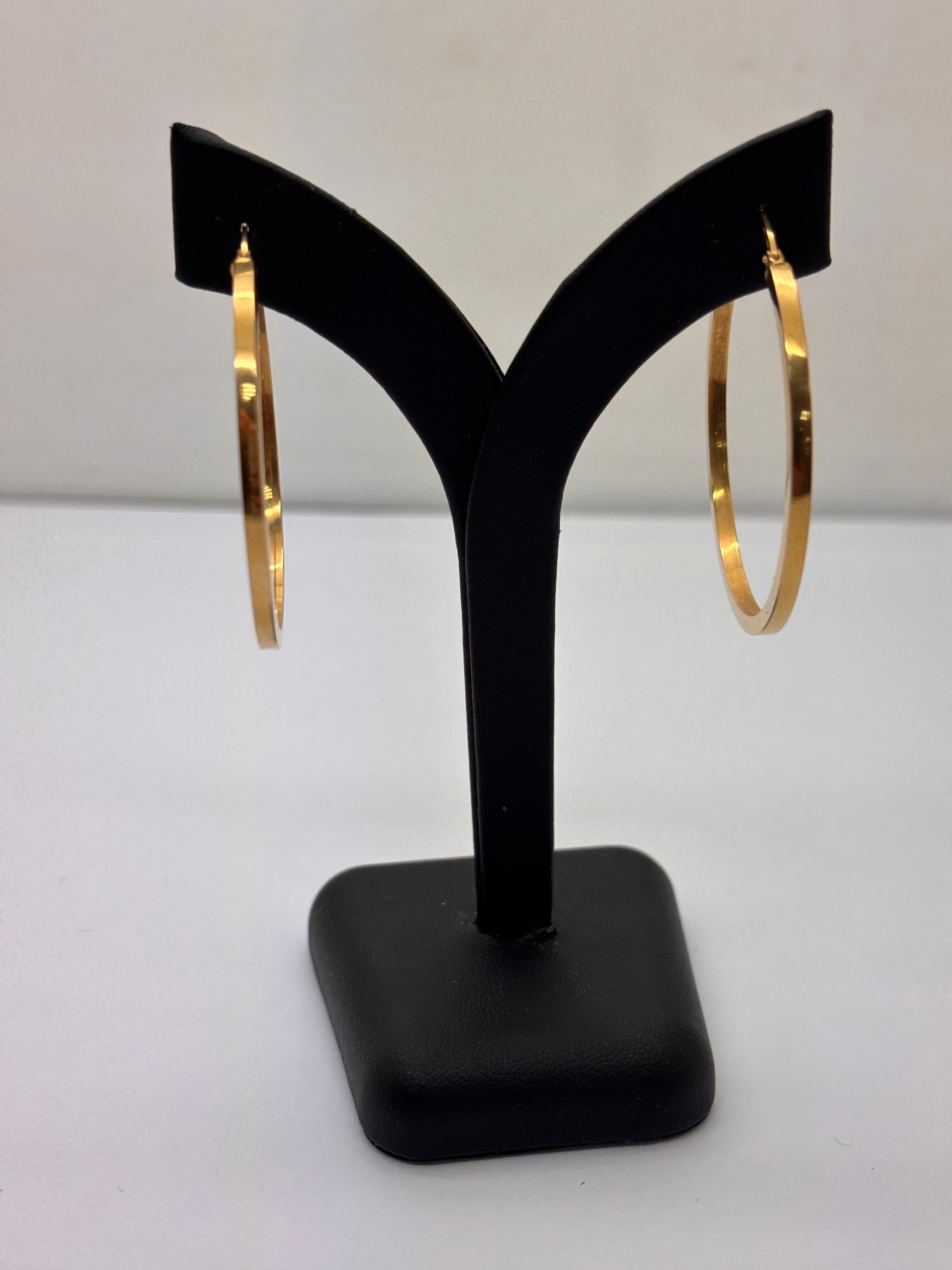 Paire de créoles en or jaune 18 carats (750/1000), poinçonnées 750, avec fermoirs à cliquets. Elles mesurent 4 cm de hauteur et de largeur, pour une épaisseur de 2 mm. Poids total : 4 grammes. État général : bon.