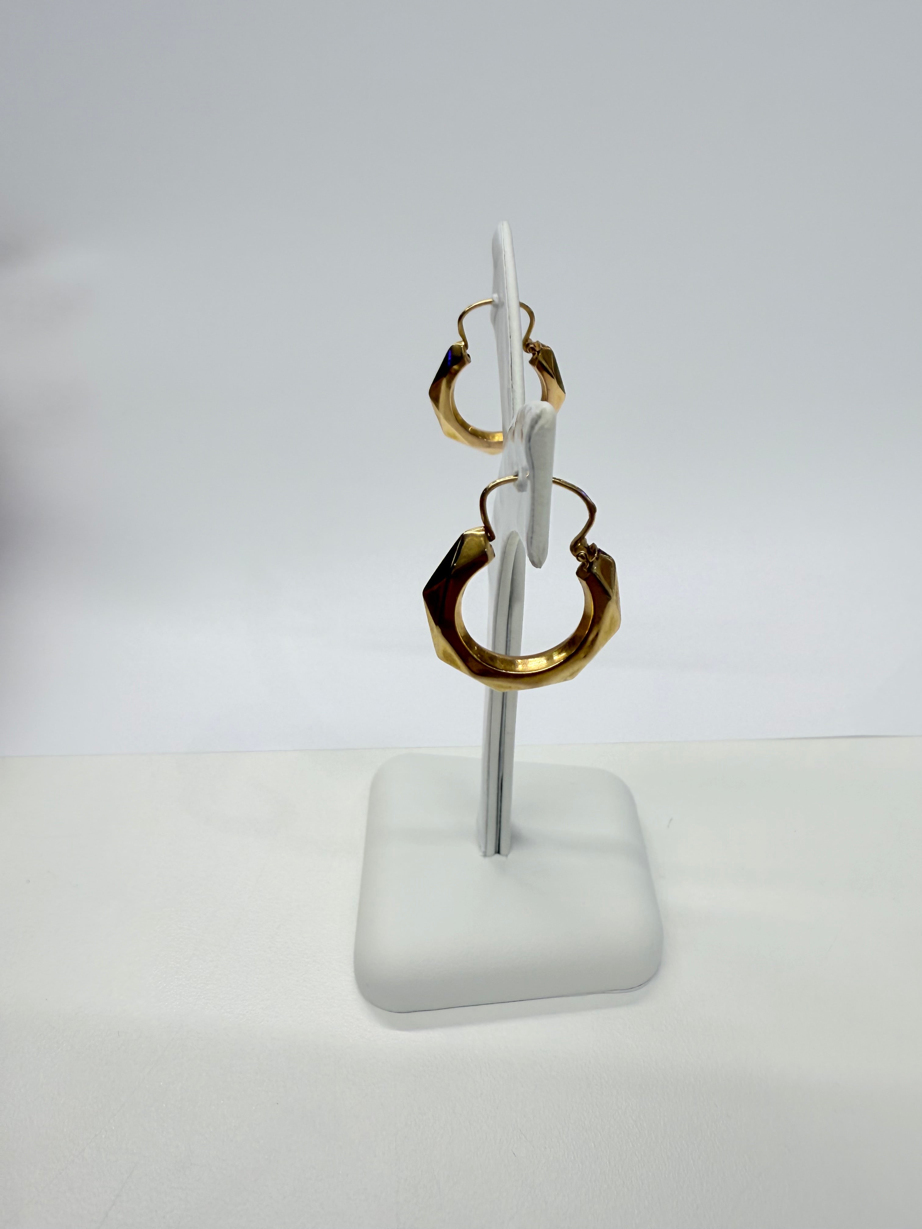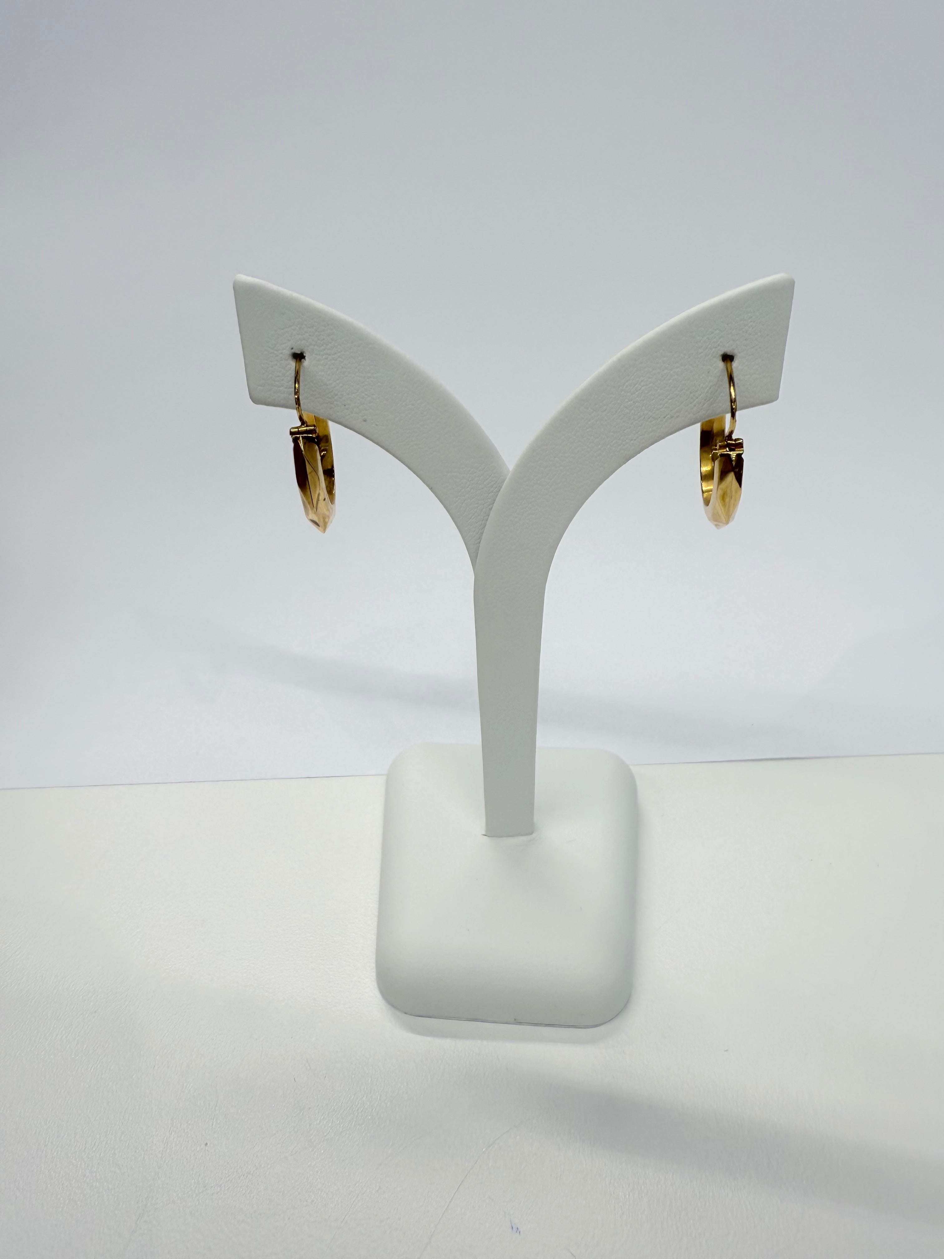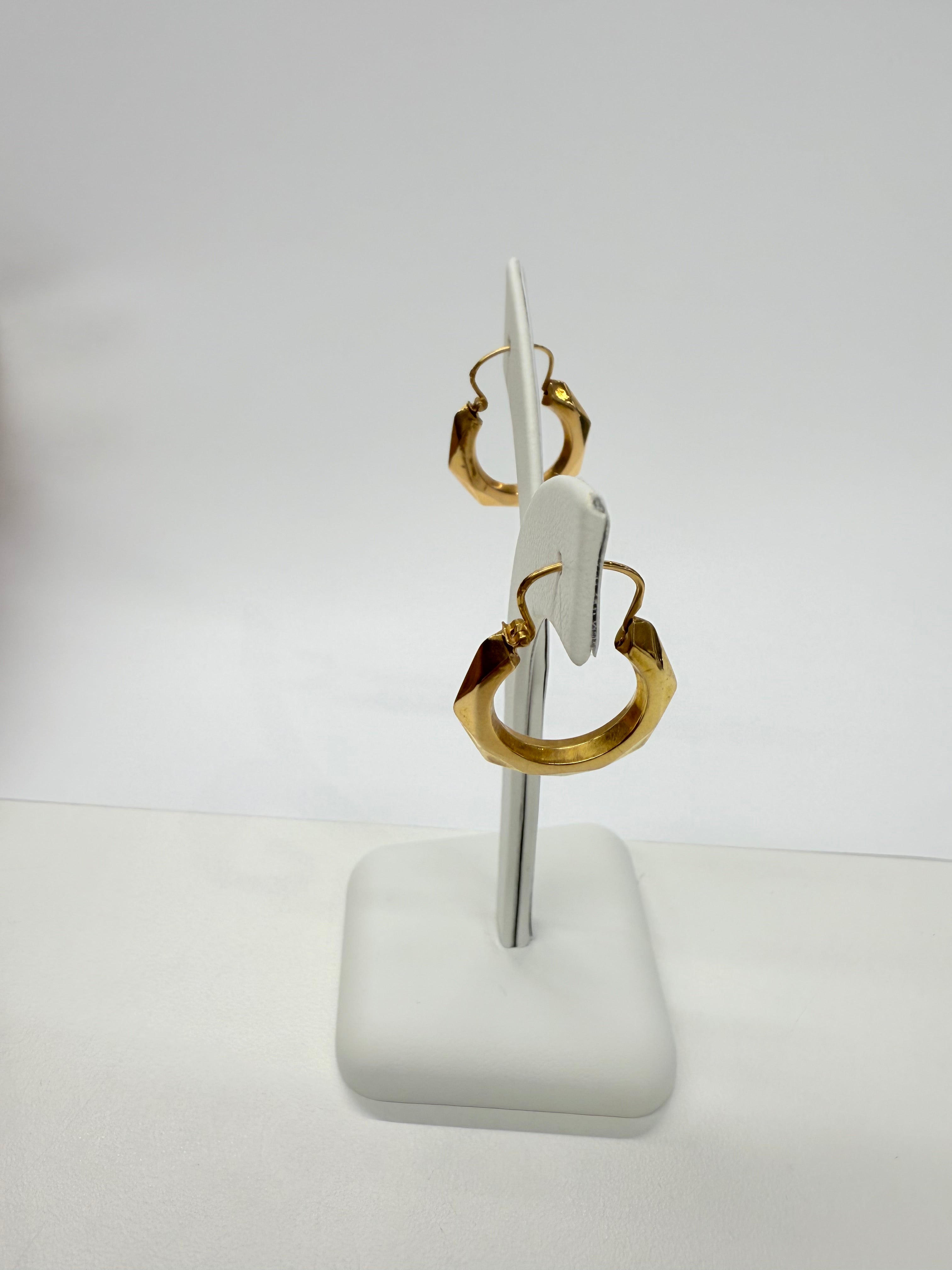 Créoles facettées en or jaune 18 carats (750/1000), poinçonnées Tête d’Aigle. Pesant 1,32 gramme, elles mesurent 2,5 cm de hauteur, 2 cm de largeur et ont une épaisseur de 0,3 cm, offrant une présence élégante et discrète. Leur fermoir à cliquets garantit un port confortable et sécurisé.