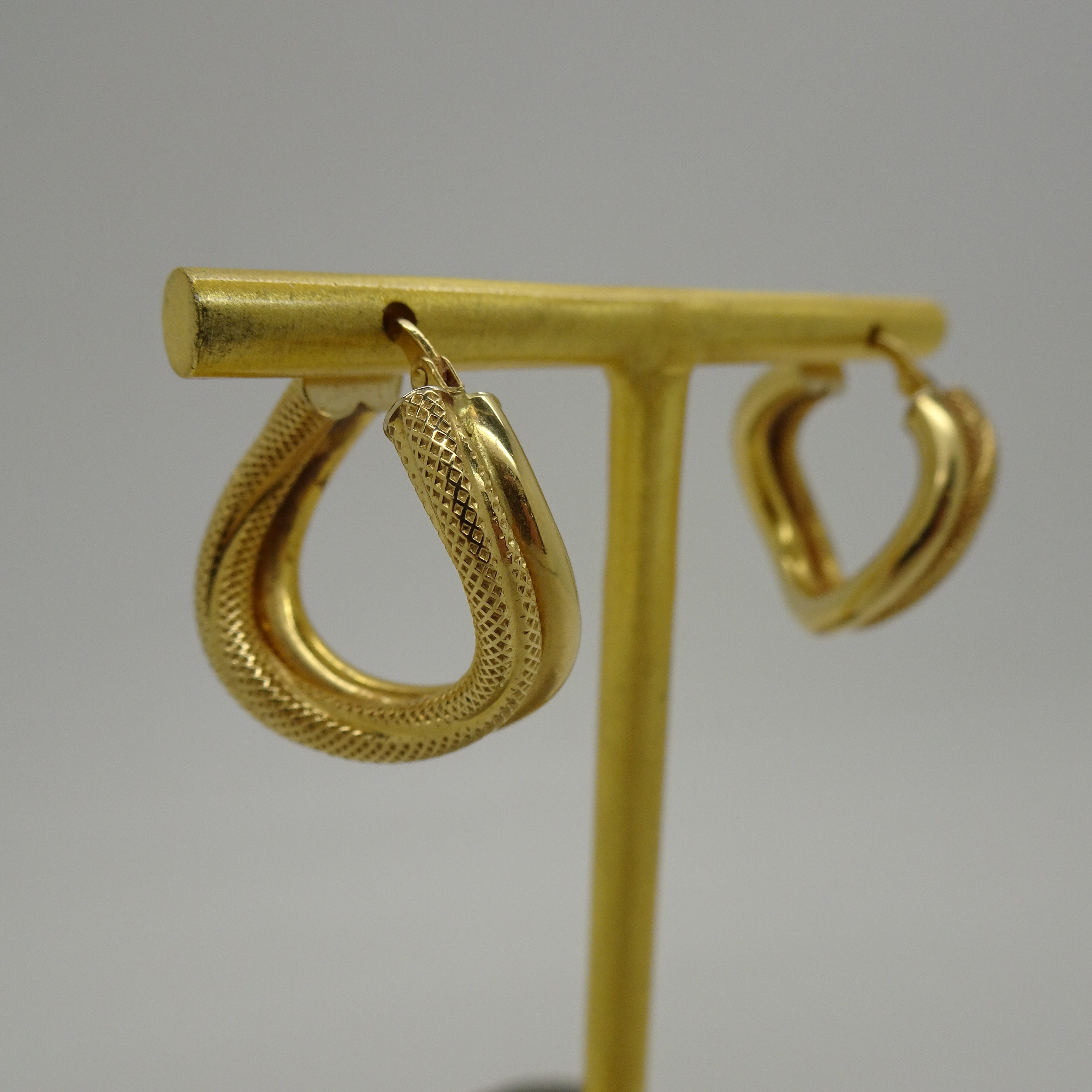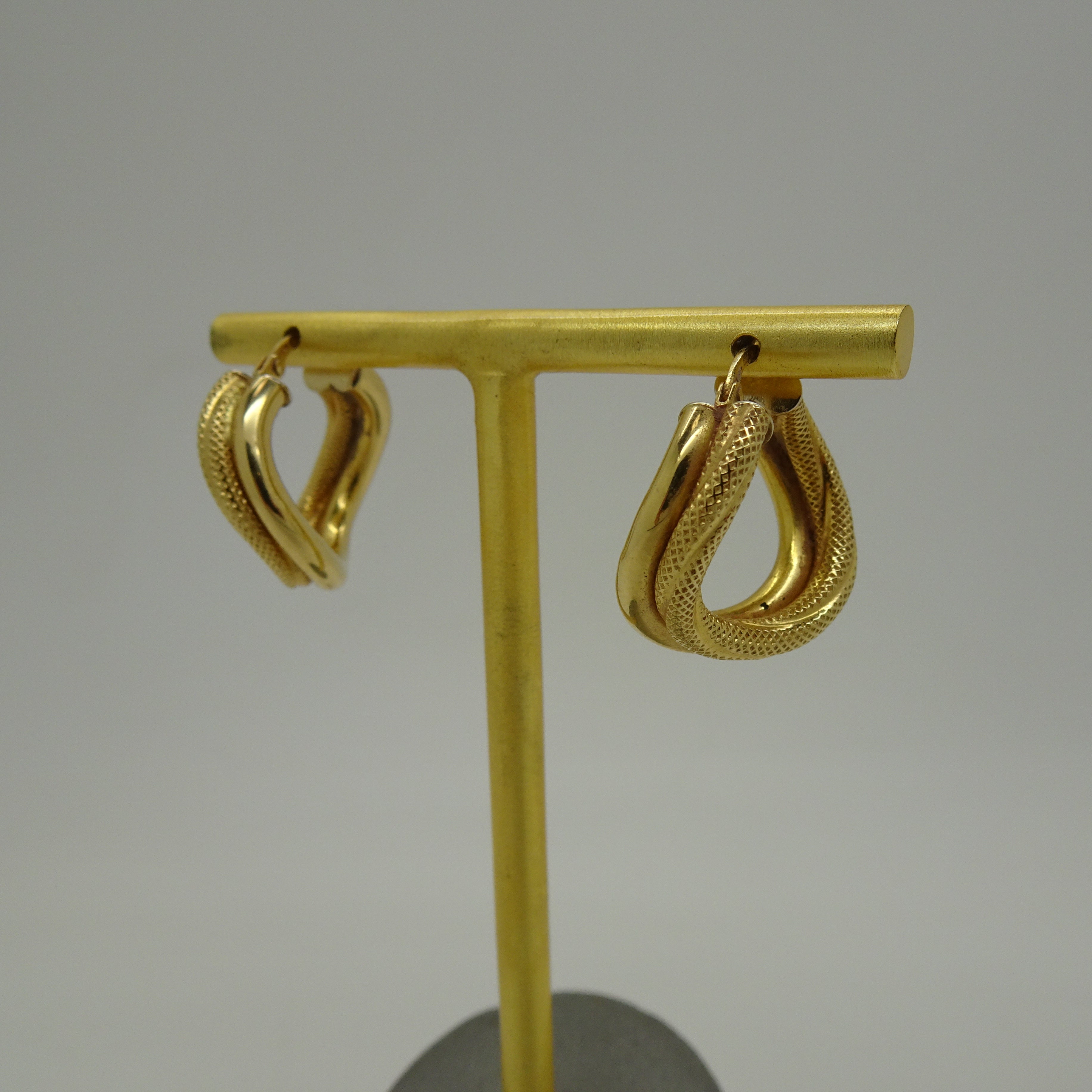 Boucles de type créoles ou demi créoles sont en or jaune 18 carats (750/1000) et portent le poinçon tête d’aigle. Elles mesurent 2,20 cm de hauteur, 2,12 cm de largeur et 3,01 mm d’épaisseur, pour un poids total de 4,05 grammes. Équipées de fermoirs à cliquets, elles sont en très bon état.