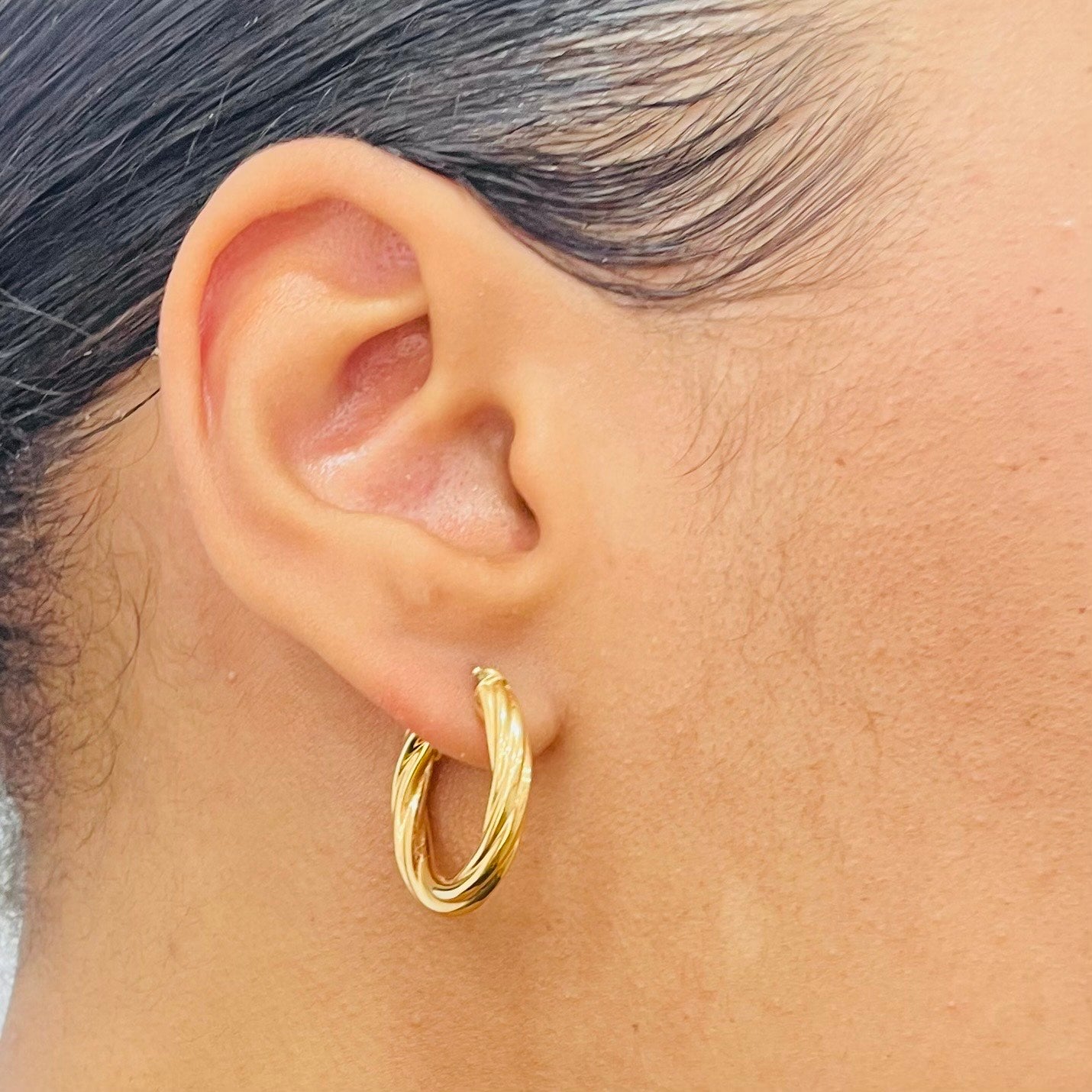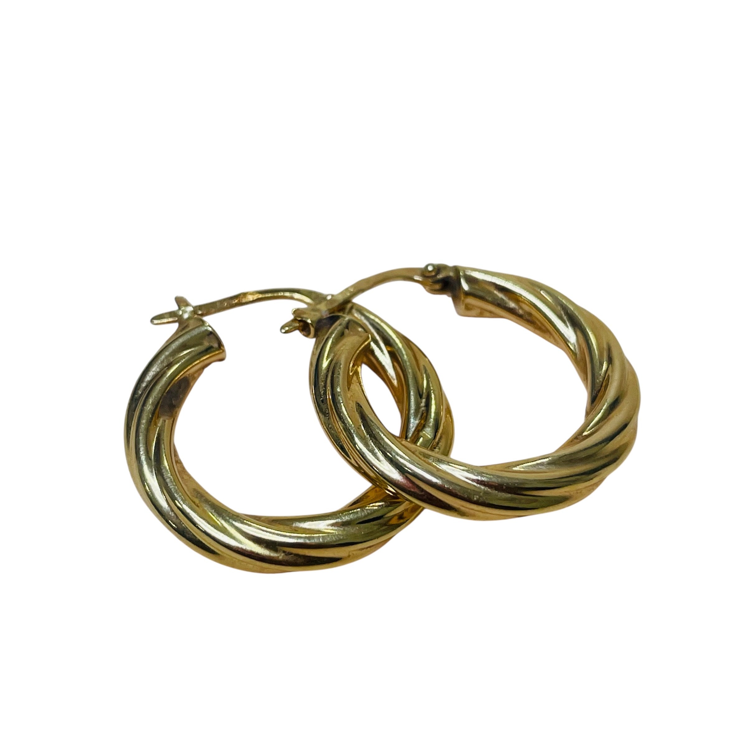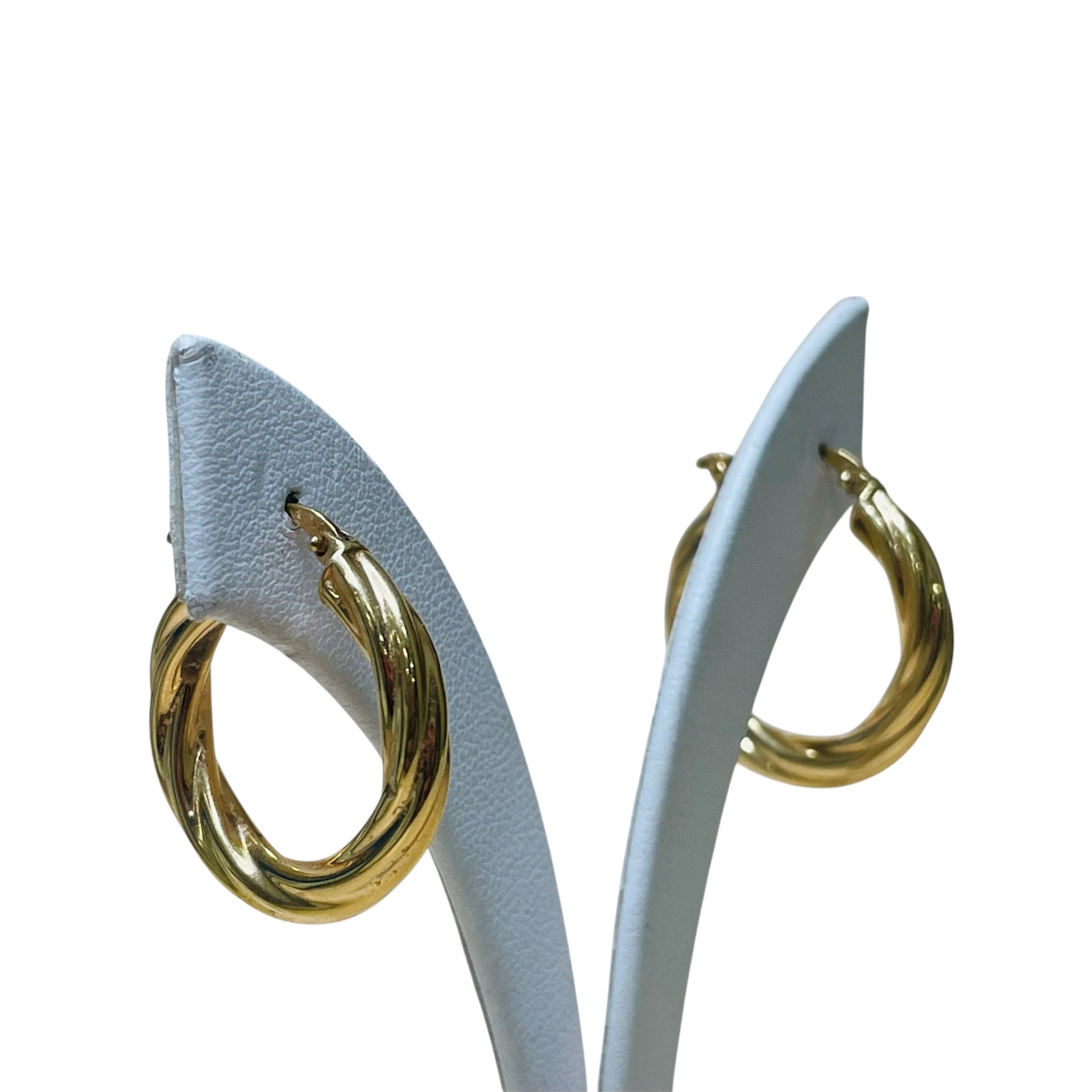 Boucles d'oreilles créoles en or jaune 18 carats (750/1000), sans poinçon. Elles sont dotées de fermoirs à cliquet et pèsent 2,45 grammes. Mesurant 2,03 cm de hauteur et de largeur, avec une épaisseur de 0,04 mm, ces créoles sont en bon état.