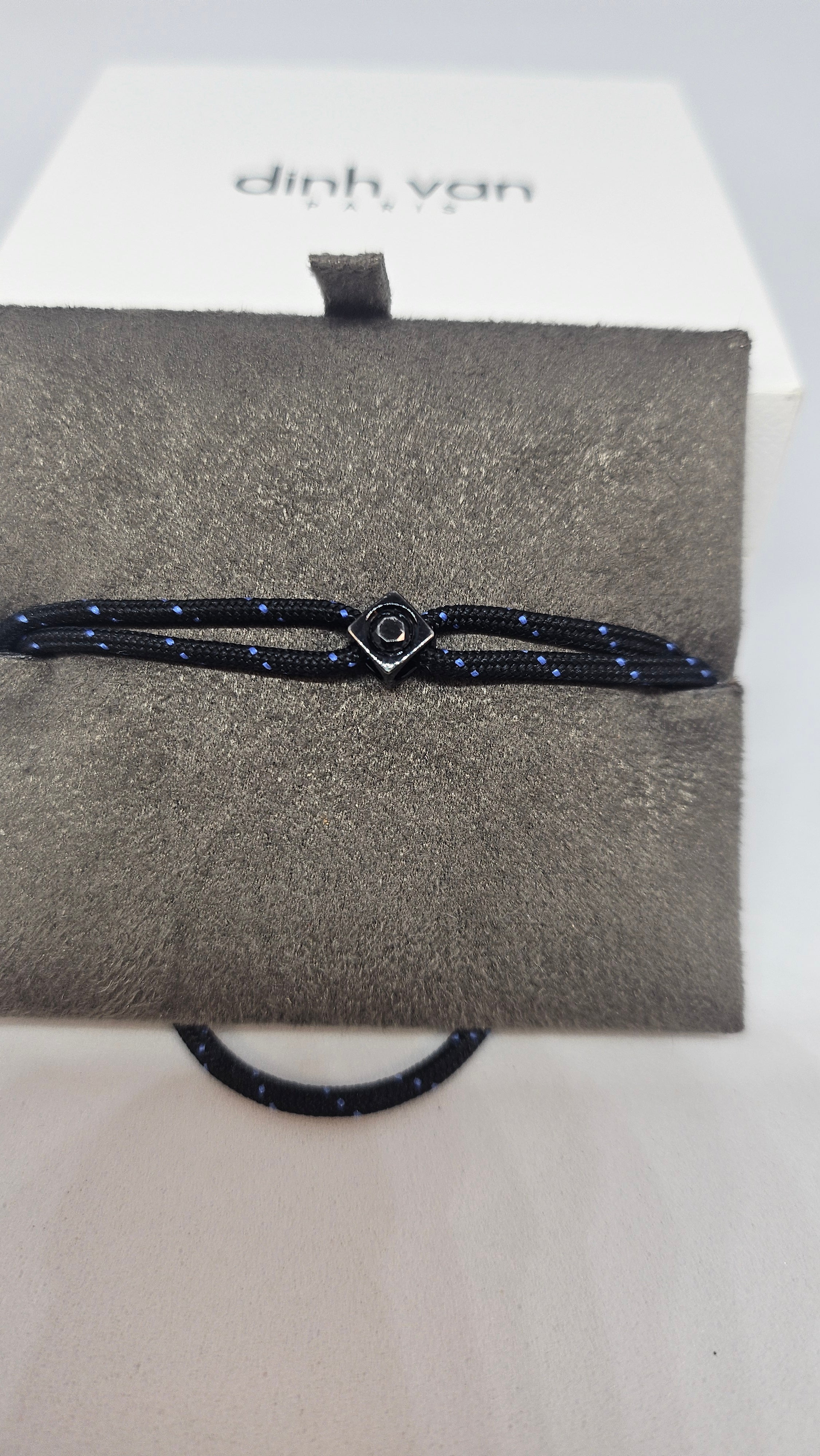 Bracelet Dinh Van en titane noir sur cordon, orné d’un diamant noir de 0,10 ct. Fermeture par lien coulissant. Poinçon Dinh Van. Traces d’usure visibles.