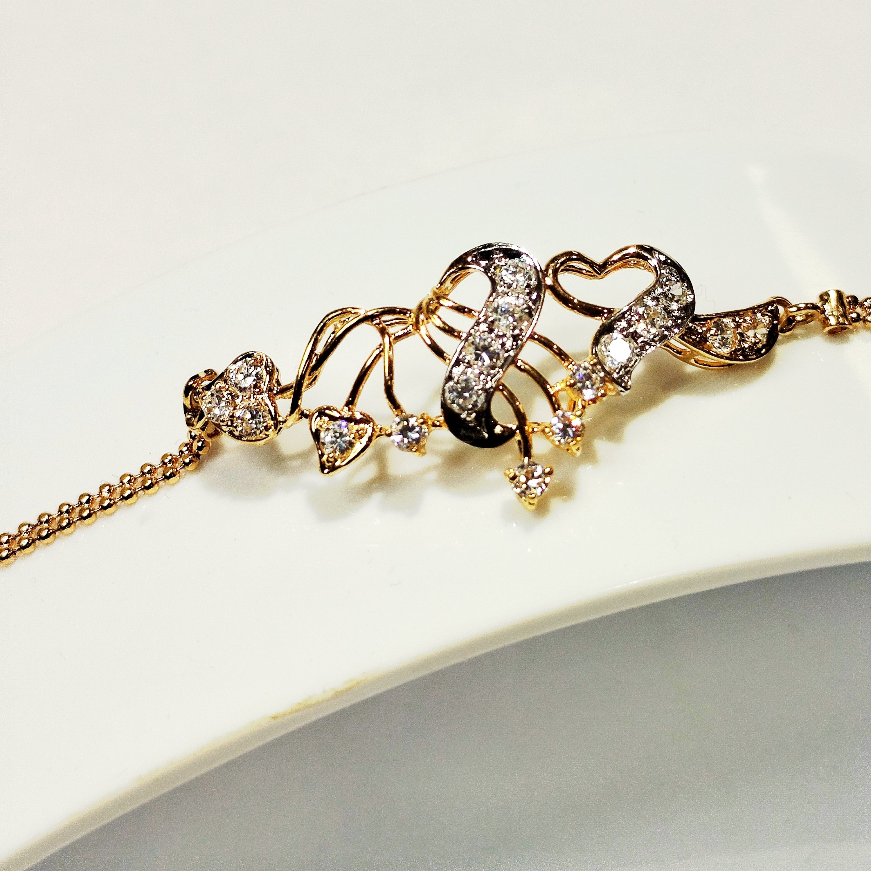 Bracelet fantaisie en or jaune et or blanc 22 carats (916/1000), orné de pierres en oxyde de zirconium. Il présente une maille originale avec un fermoir mousqueton sécurisé. Longueur de 18,5 cm, largeur de 2 cm et épaisseur de 4 cm, pour un poids de 6,06 g. Poinçonné 21k, en très bon état.