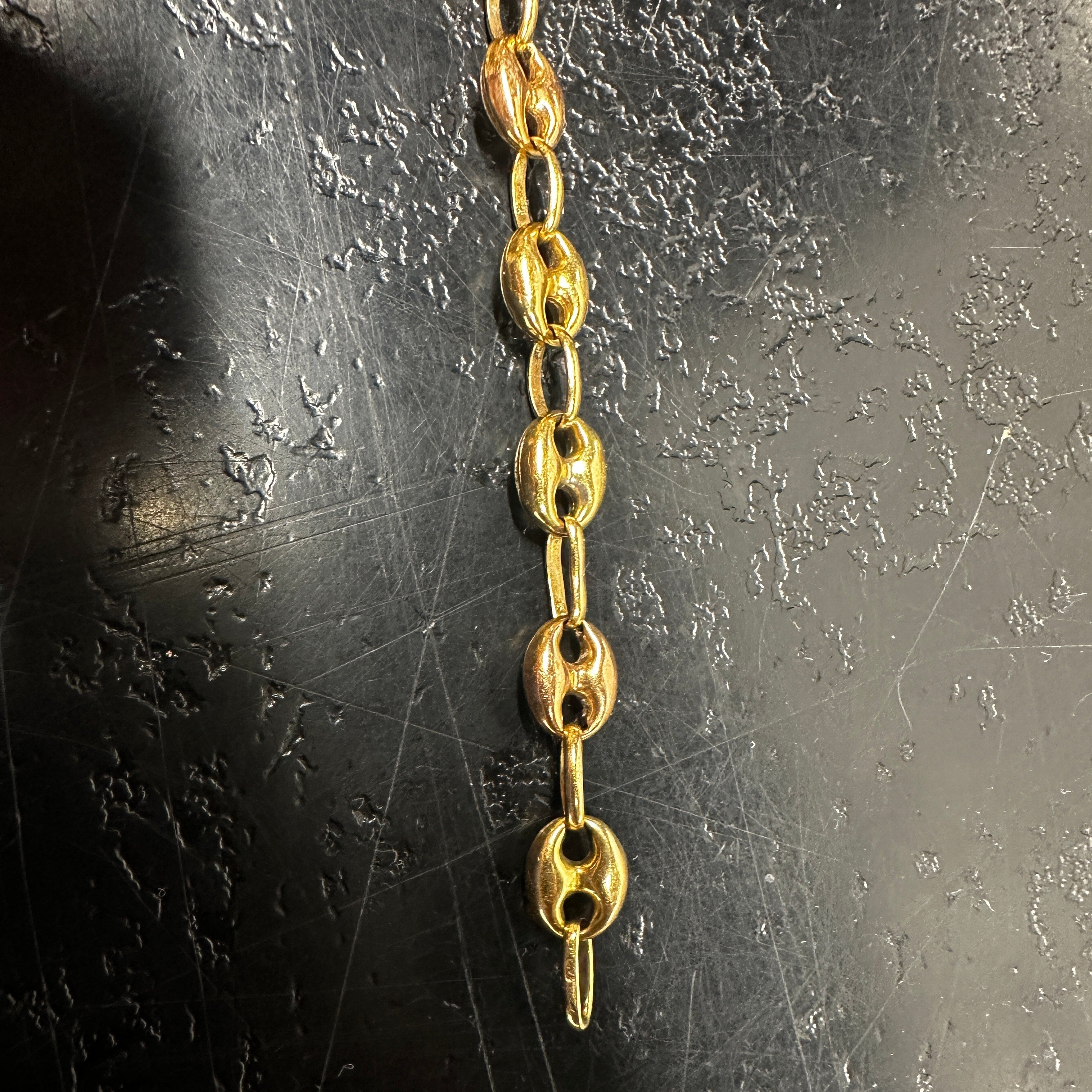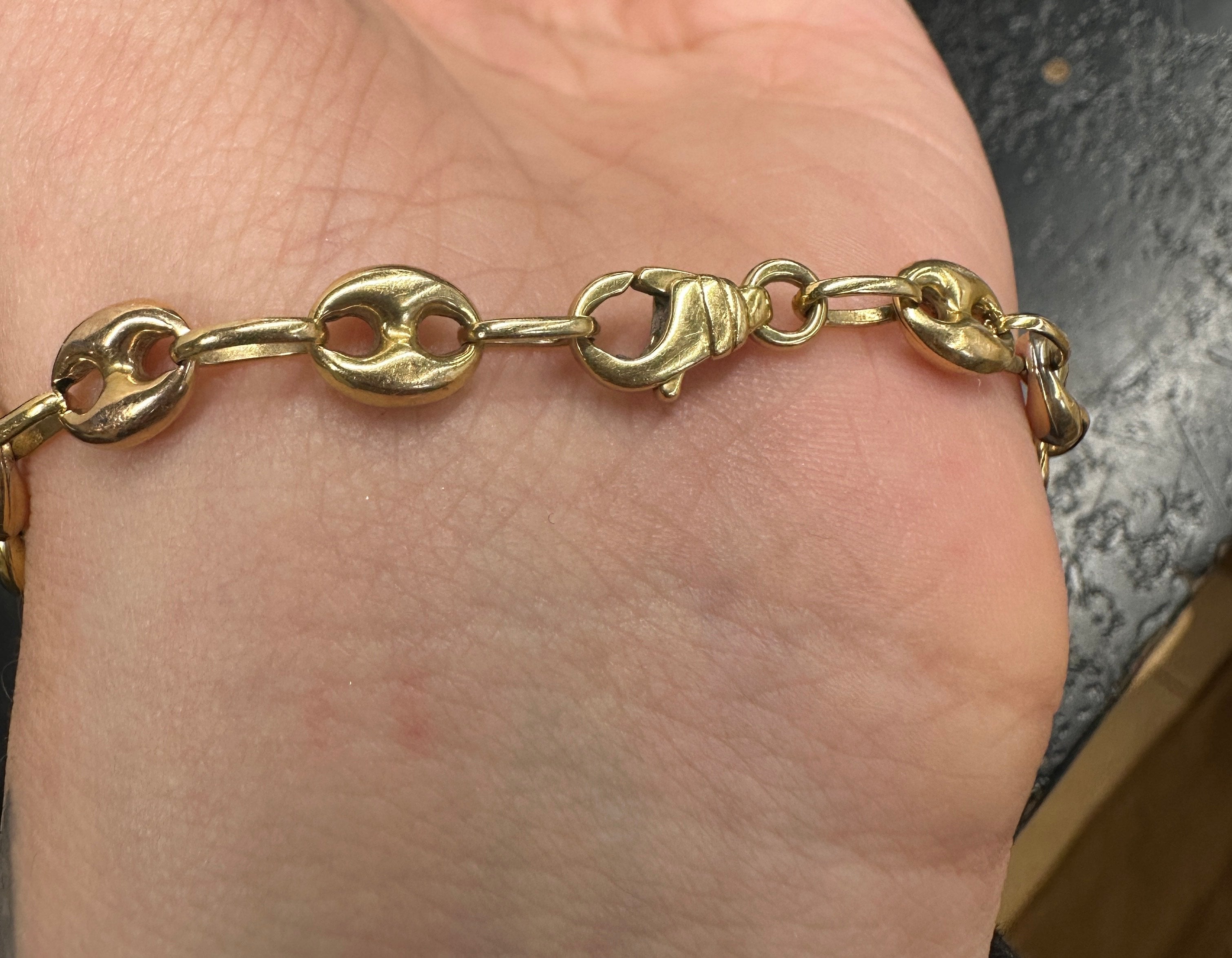 Bracelet Grain de Café en or 18 carats (750/1000), en or jaune et or blanc, au design intemporel et élégant. Sa maille emblématique de 1 cm de largeur et son poids de 7,88 g offrent une belle présence tout en restant confortable. Équipé d’un fermoir anneau ressort sécurisé et marqué du poinçon 750, ce bracelet en bon état est un bijou en or durable, idéal pour un porté quotidien ou comme valeur sûre.