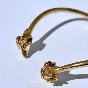 Ce jonc ouvert en or, finement malléable, s’orne de têtes de béliers majestueuses, symbole de puissance et de protection, fusionnant élégance et caractère dans un bijou d’exception.