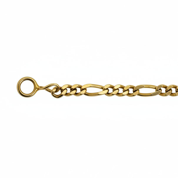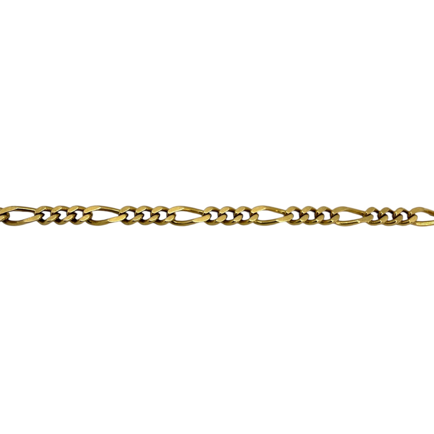 Bracelet en or jaune 18 carats (750/1000) à maille Figaro, doté d’un fermoir anneau ressort. Avec un poids de 4,08 g, une longueur de 21 cm et une largeur de 3 mm, il offre un style classique et équilibré. Proposé en très bon état.