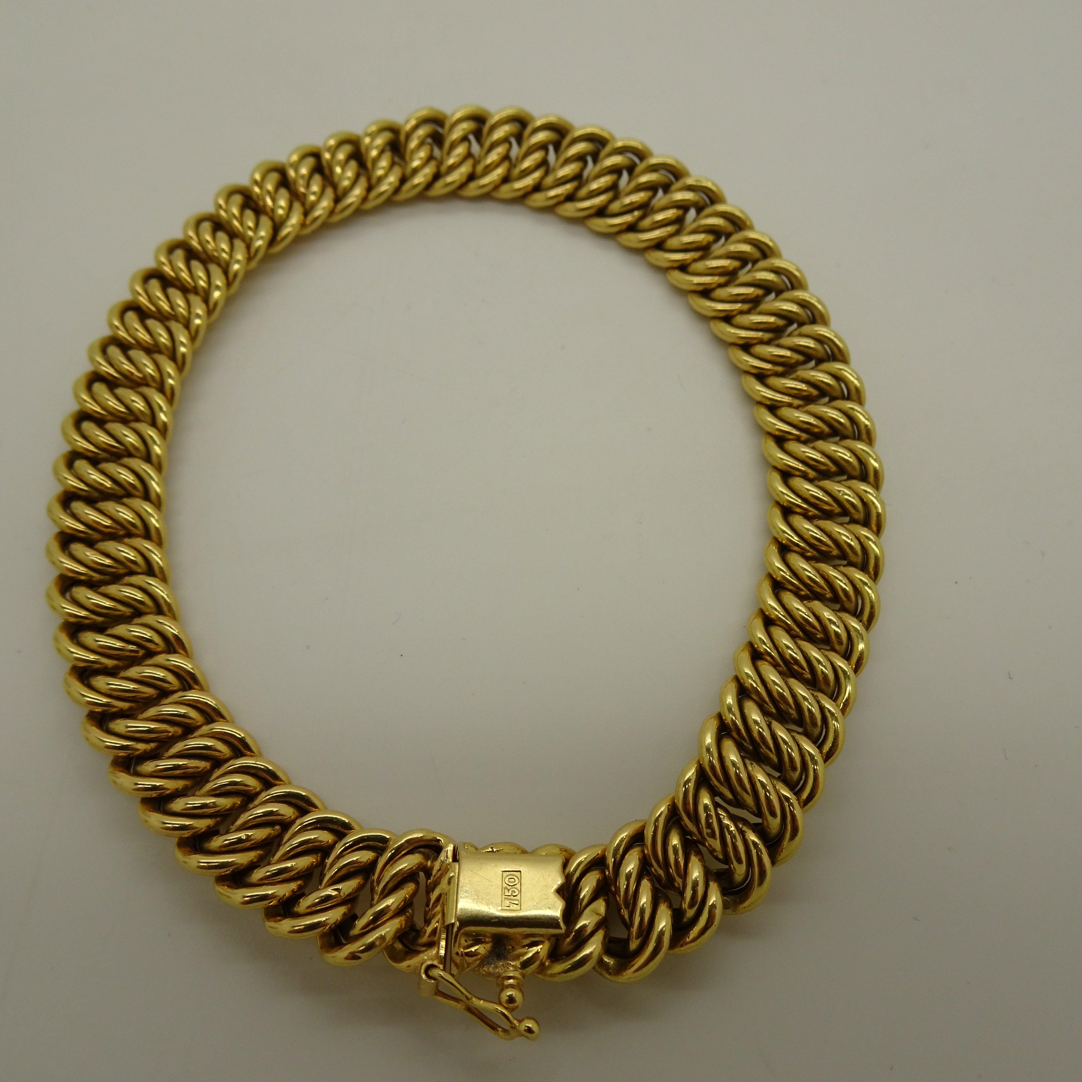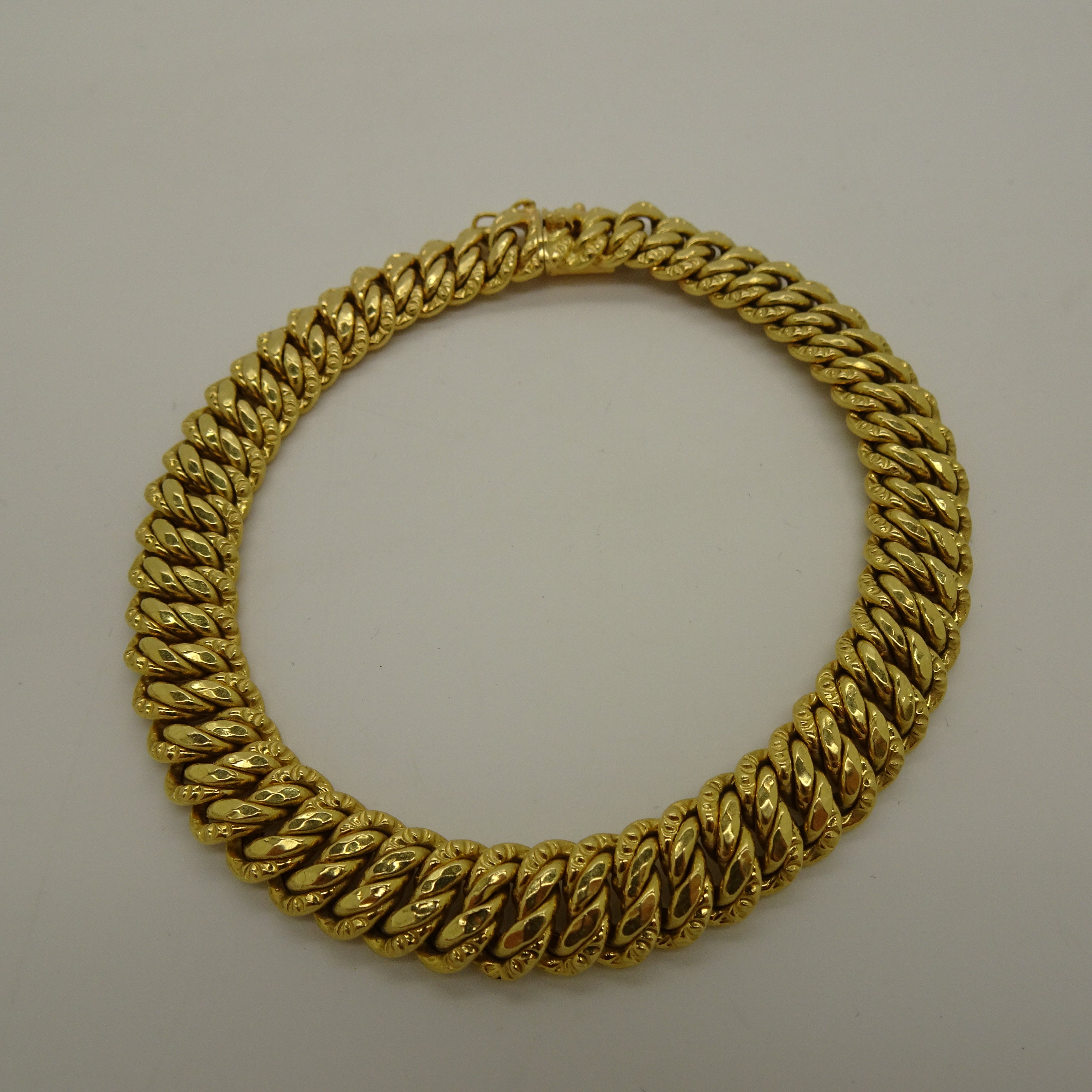 Bracelet à maillons en or jaune 18 carats (750/1000), maille américaine avec fermoir à cliquet. Longueur 23 cm, poids 16,93 g. Poinçonné tête d’aigle, sans pierres. En très bon état, massif et raffiné.