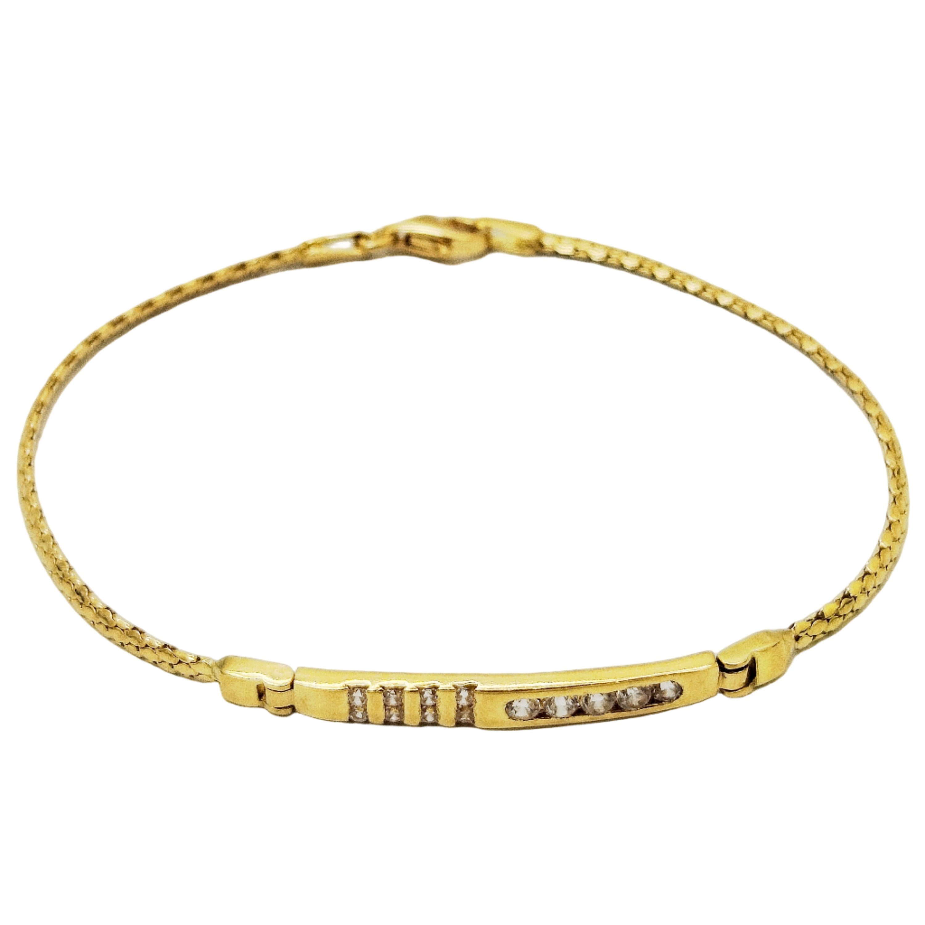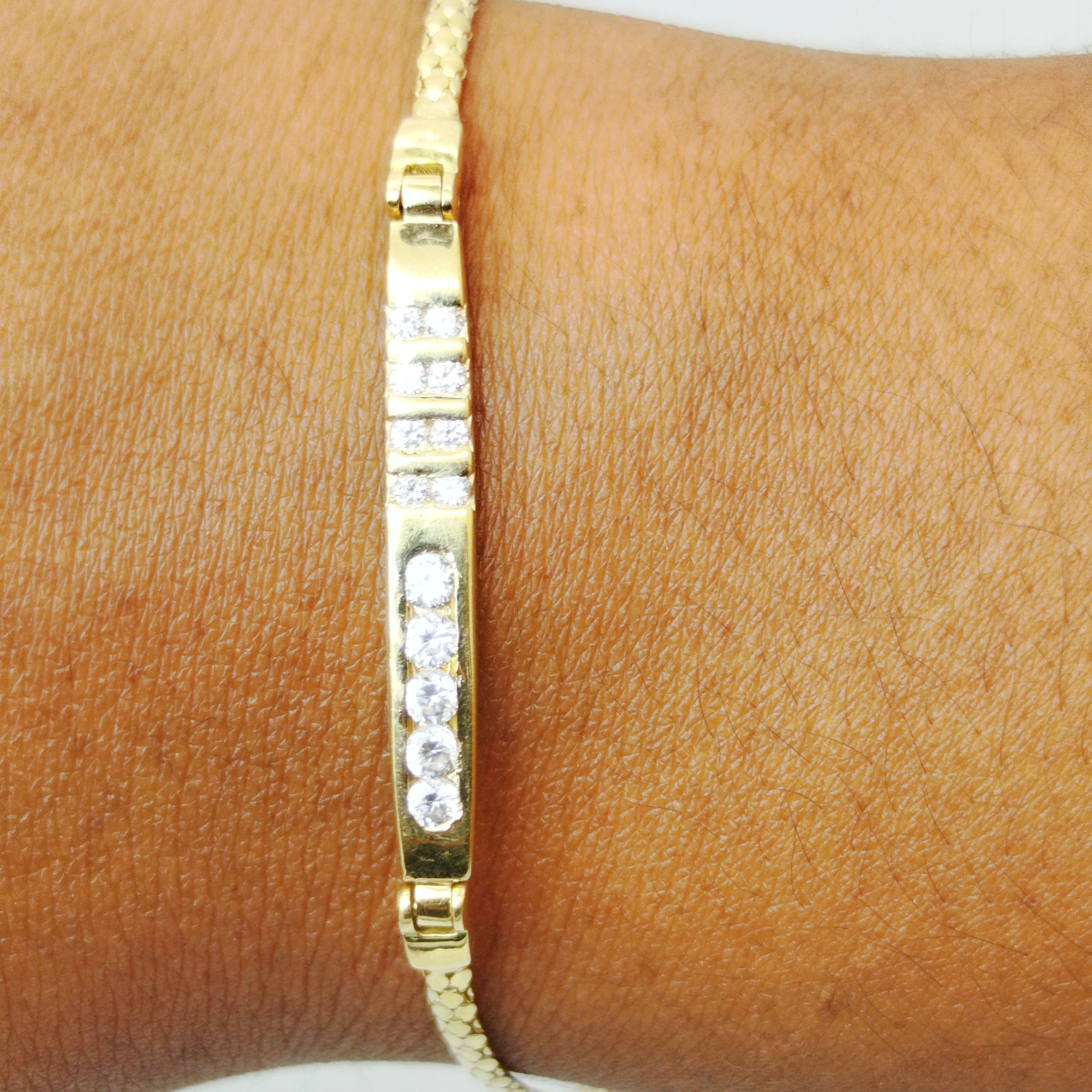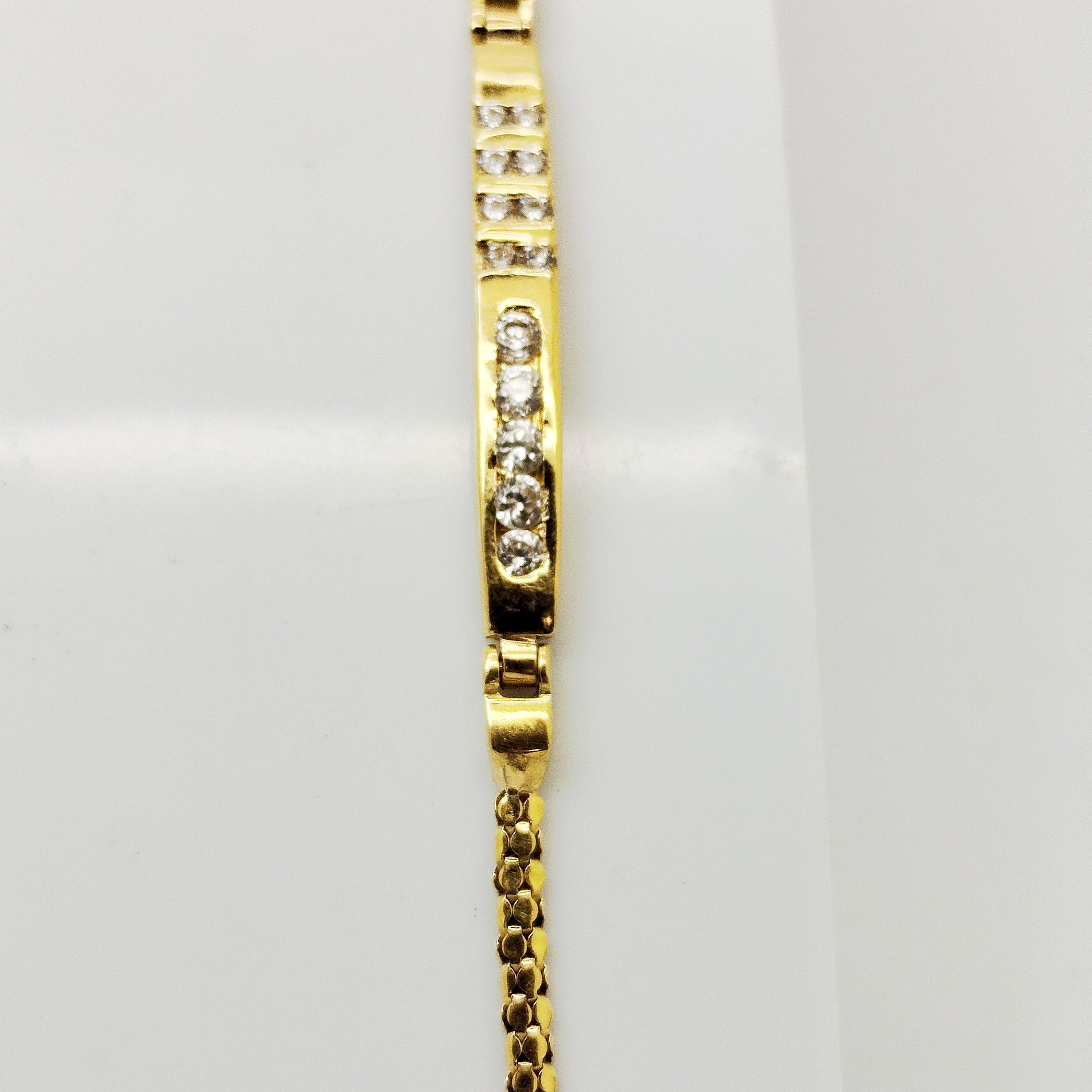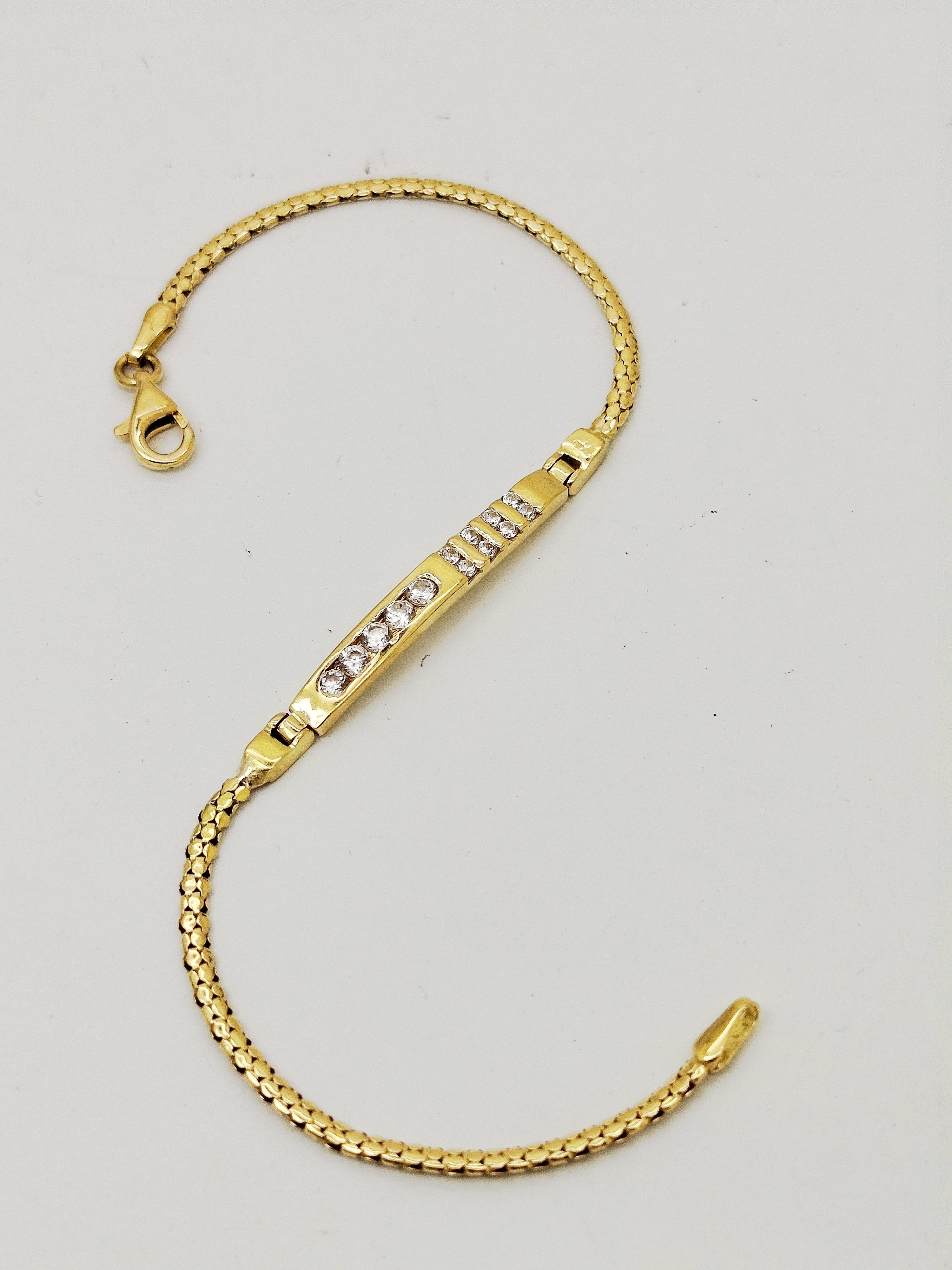 Bracelet maillon fantaisie en or jaune 750/1000, poinçon 750, longueur 18 cm, largeur 1 mm, poids 4,93 g, fermoir mousqueton. Serré d’oxydes de zirconium. Modèle en bon état.