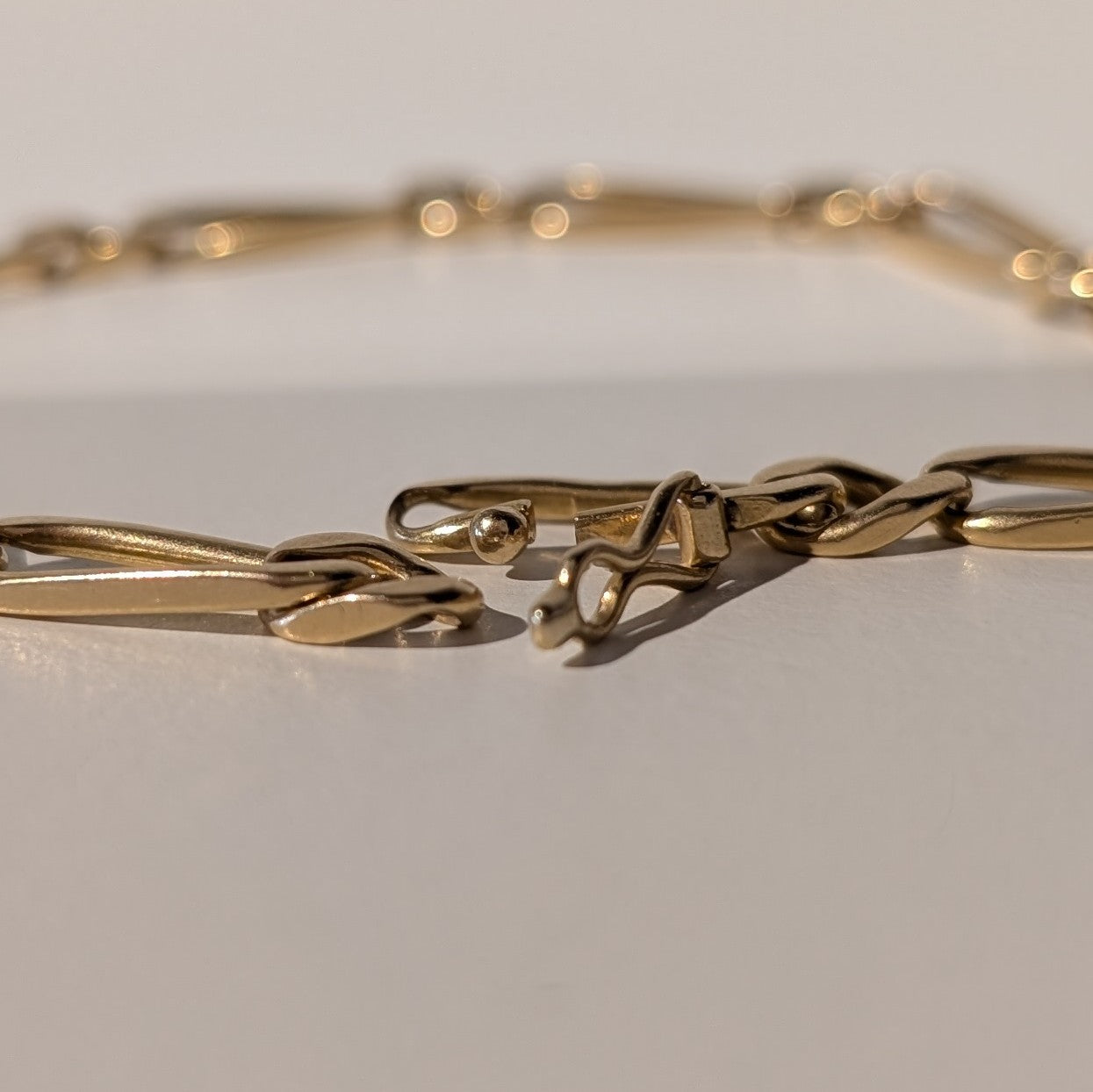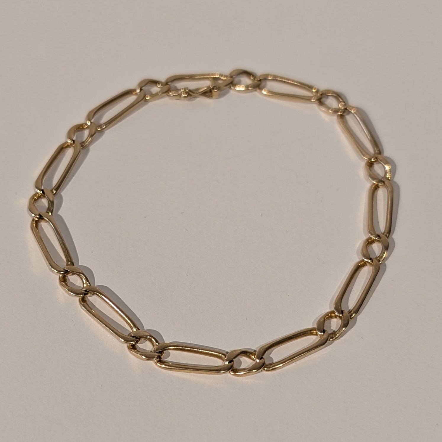 Bracelet à maillons en or jaune 18 carats (750/1000), maille Figaro avec fermoir à huit. Longueur 22 cm, poids 12,45 g. Sans pierres ni poinçon. En bon état, classique et robuste.