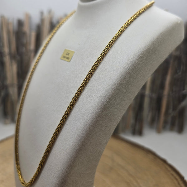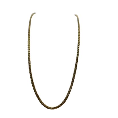 Collier matinée en or jaune 18 carats (titrage 750/1000), sans poinçon, présente une maille anglaise. Il mesure 40 cm de long, 2 mm de large et 1 mm d’épaisseur, avec un poids de 7,01 grammes. Il est équipé d’un fermoir mousqueton. Le collier est en très bon état.