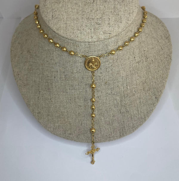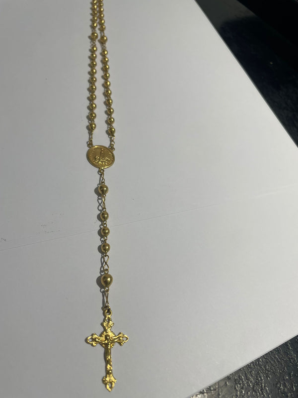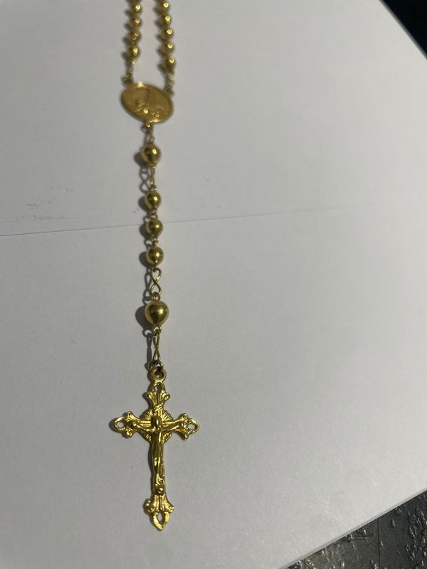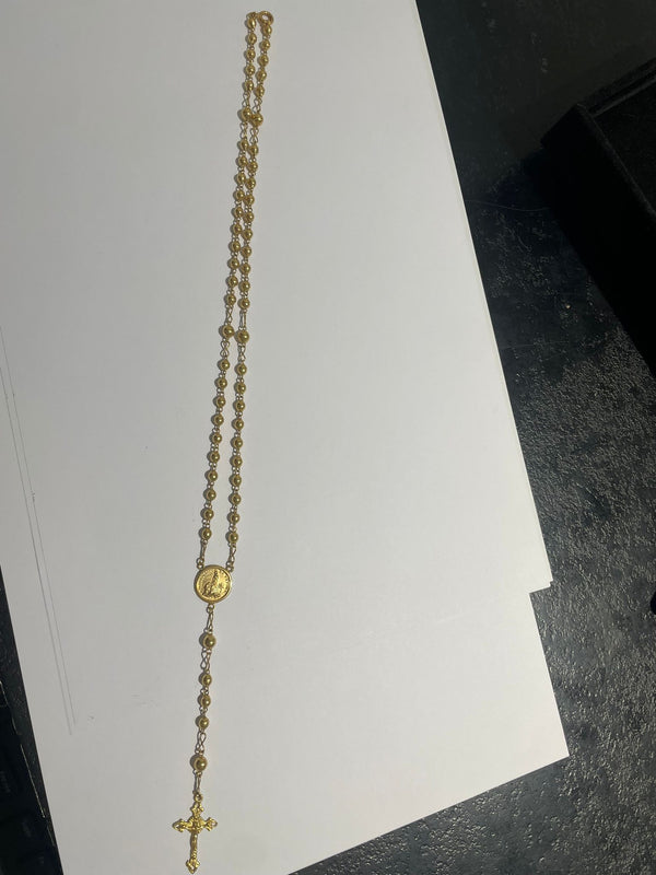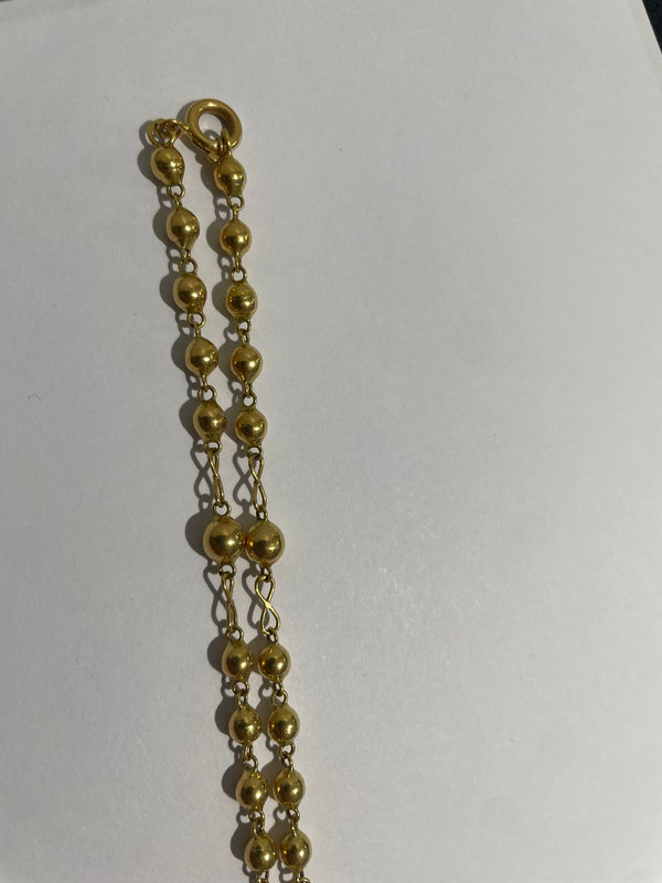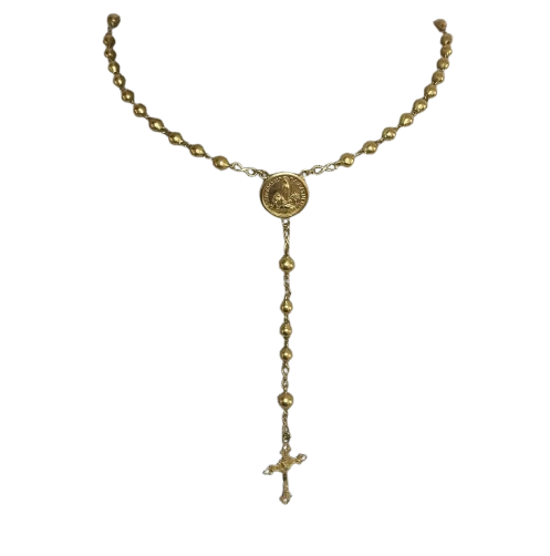 Collier chapelet en or jaune 18 carats (750/1000) est réalisé avec une maille marseillaise, offrant un style traditionnel et raffiné. Il pèse 15,61 g, mesure 35,5 cm de long, 2,3 cm de large et 0,3 cm d'épaisseur. Sans pierres et sans poinçon, il est équipé d’un fermoir à anneau ressort et se trouve en très bon état.