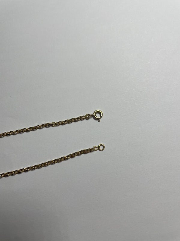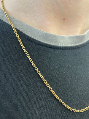 Collier de type Matinée en or jaune 750/1000 (18 carats), avec maille forçat et fermoir à anneau ressort. Il est poinçonné Tête d’Aigle, gage de qualité. Sans pierre, il mesure 55 cm de long, pour un poids de 12,01 g et une épaisseur de 4 mm. Il est en très bon état.
