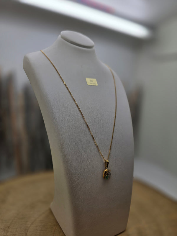 Collier matinée en or jaune 18 carats (titrage 750, poinçon 750) possède une maille anglaise. Il mesure 19 cm de long, avec une largeur et une épaisseur très fines de 0,01 mm, pour un poids de 2,31 grammes. Le fermoir est de type anneau ressort. Il est orné d’un petit oxyde de zirconium vert et se trouve en très bon état.
