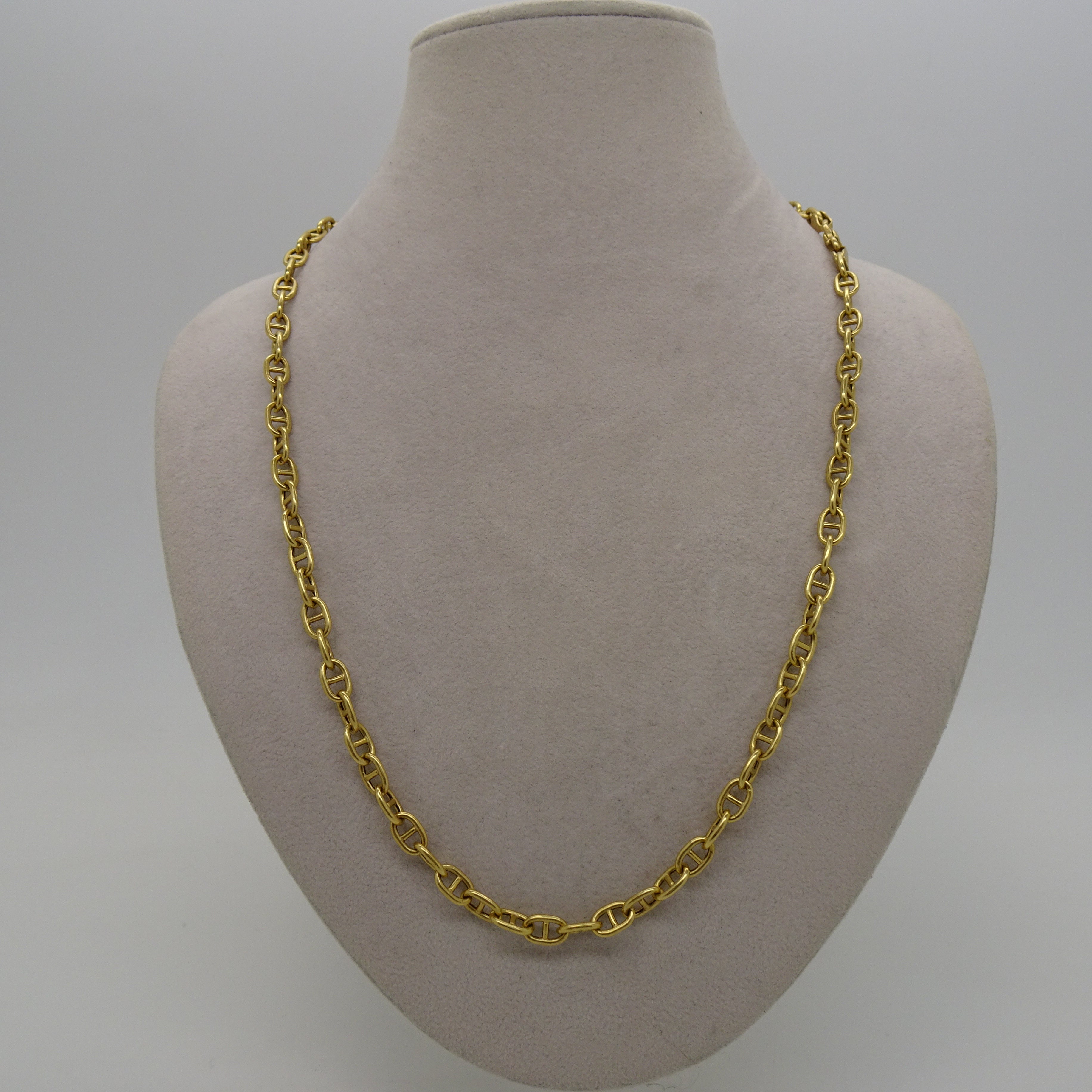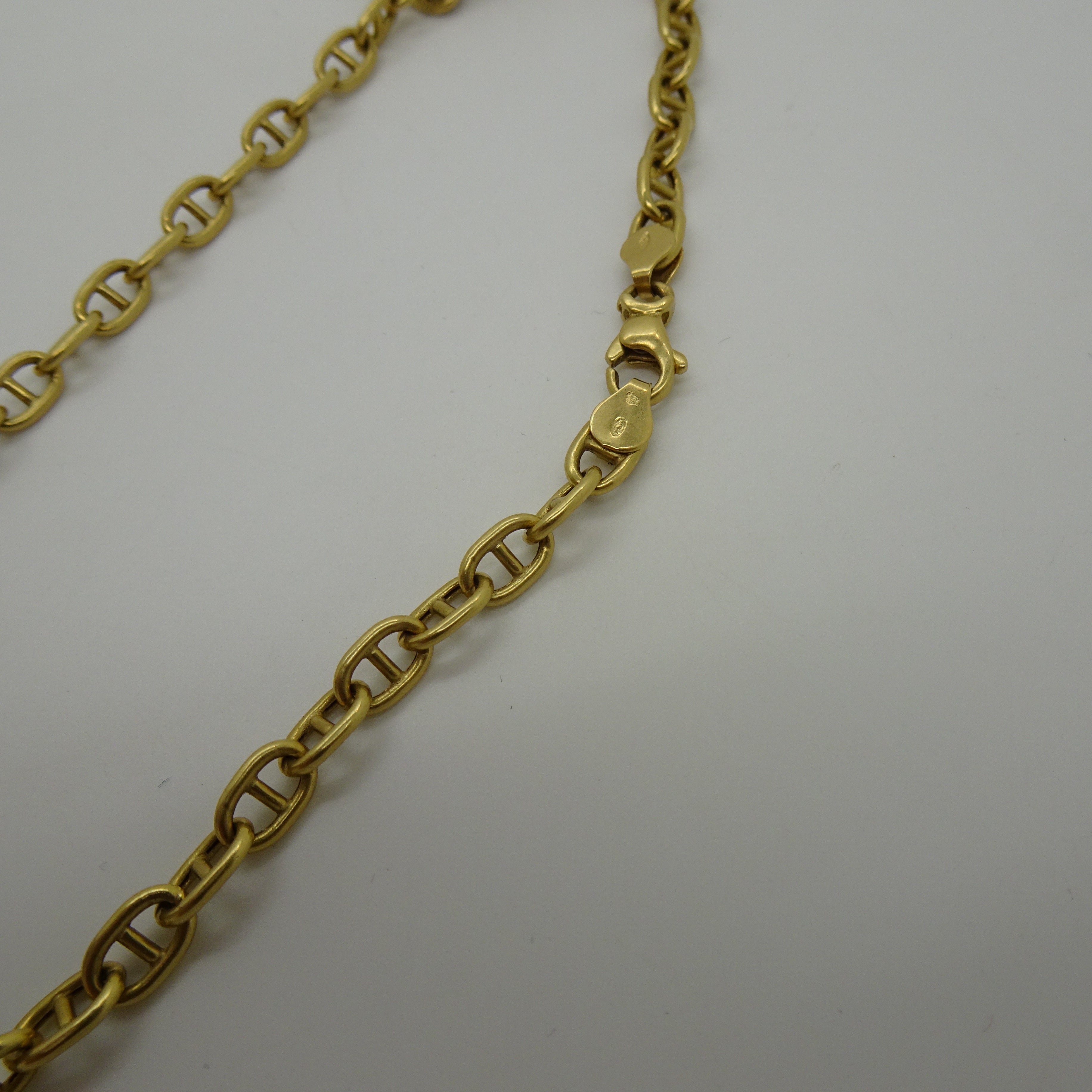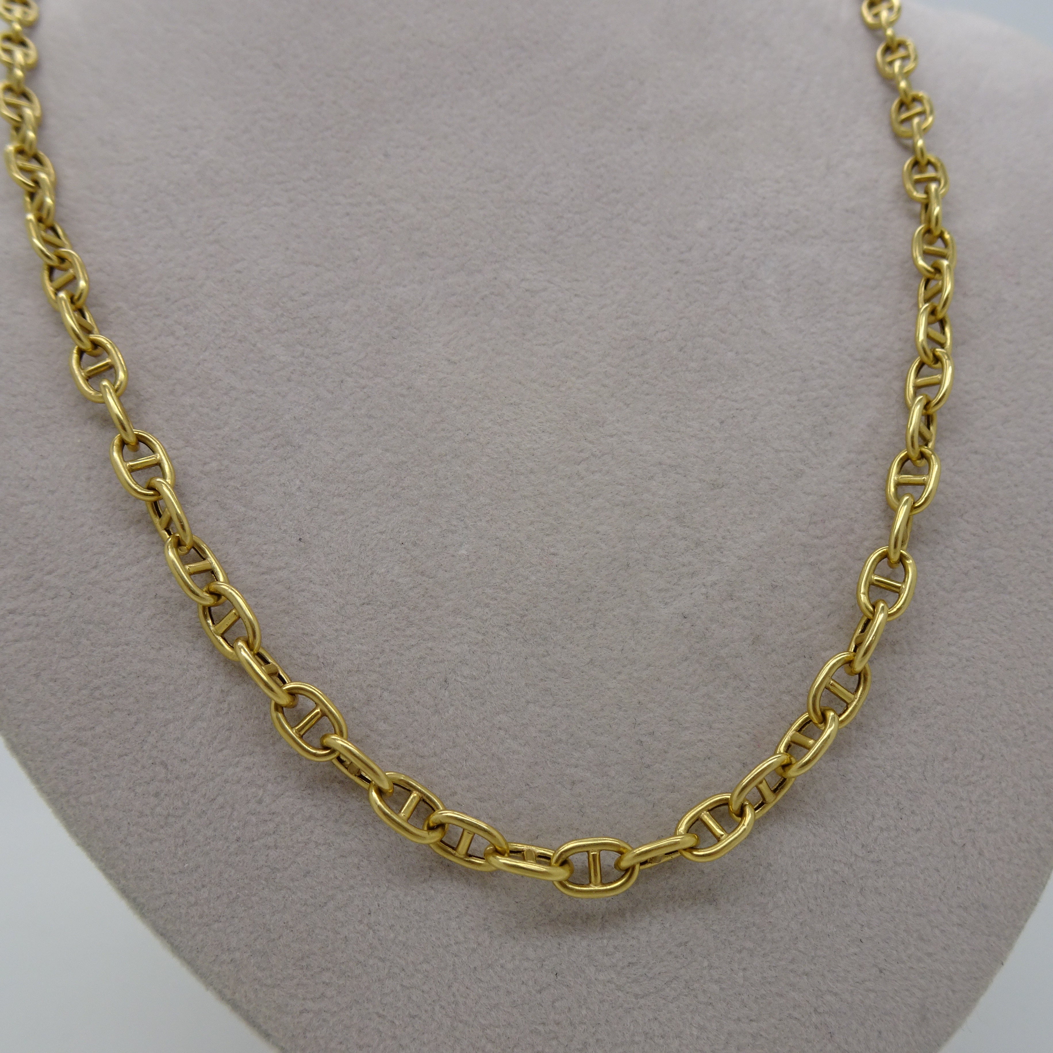 Collier matinée en or jaune 18 carats (750), maille marine, avec fermoir mousqueton. Longueur 51 cm, largeur 4,4 mm. Poids : 13,63 g. Poinçon Tête d’Aigle. Un classique chic en très bon état.