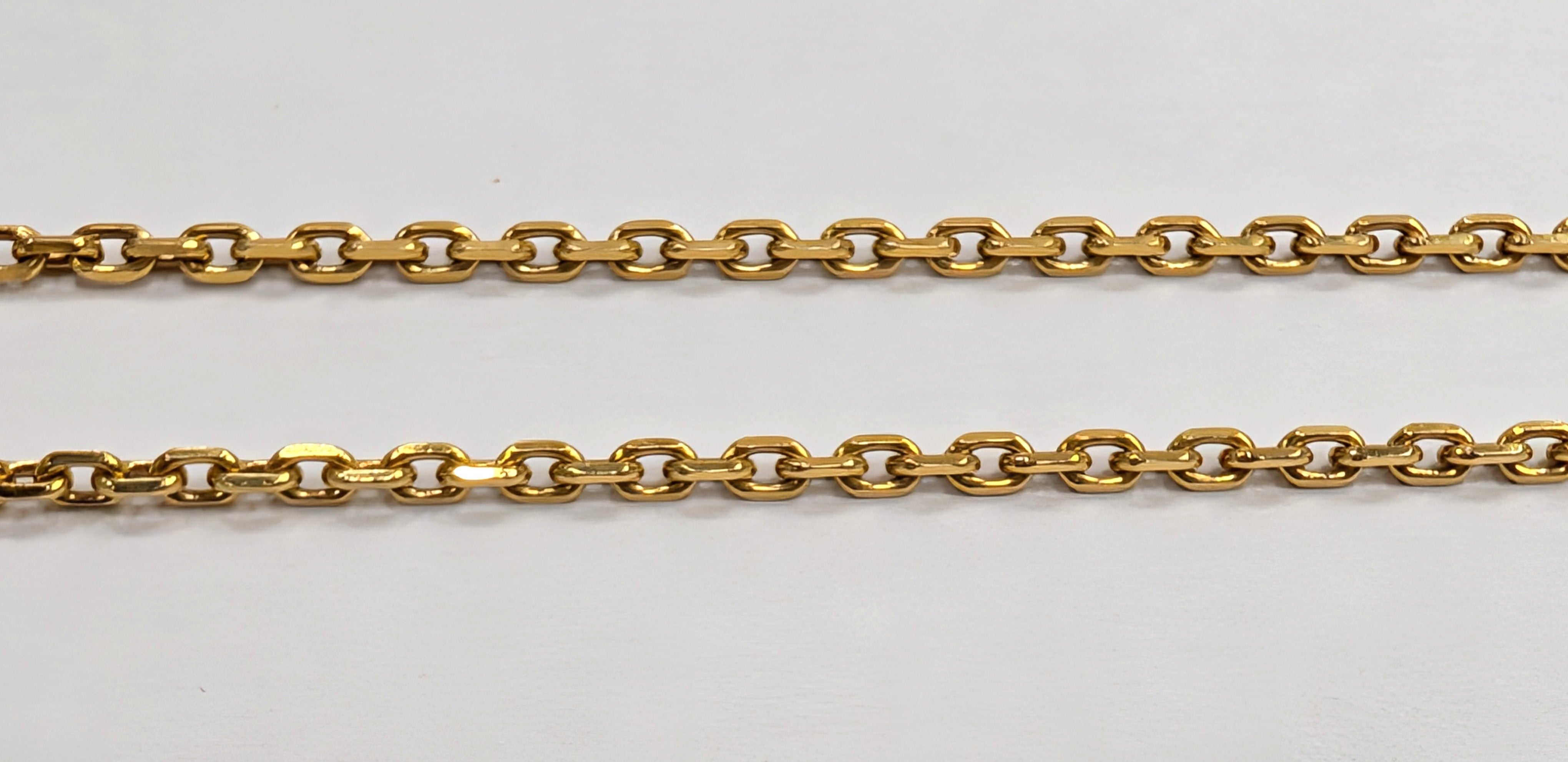 Collier matinée en or jaune 18 carats (750/1000), maille forçat, fermoir anneau ressort, poinçonné 750. Poids : 7,07 g, longueur : 51 cm, largeur/épaisseur : 1,5 mm. Sans pierres. Très bon état.