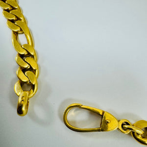 Collier de type matinée en or jaune 18 carats (750/1000), poinçonné 750. Il présente une maille Figaro avec un fermoir mousqueton, pour un poids de 113,06 grammes. Ses dimensions sont de 55 cm de longueur, 8 mm de largeur et 5 mm d’épaisseur. Sans pierres, ce collier est en état comme neuf.