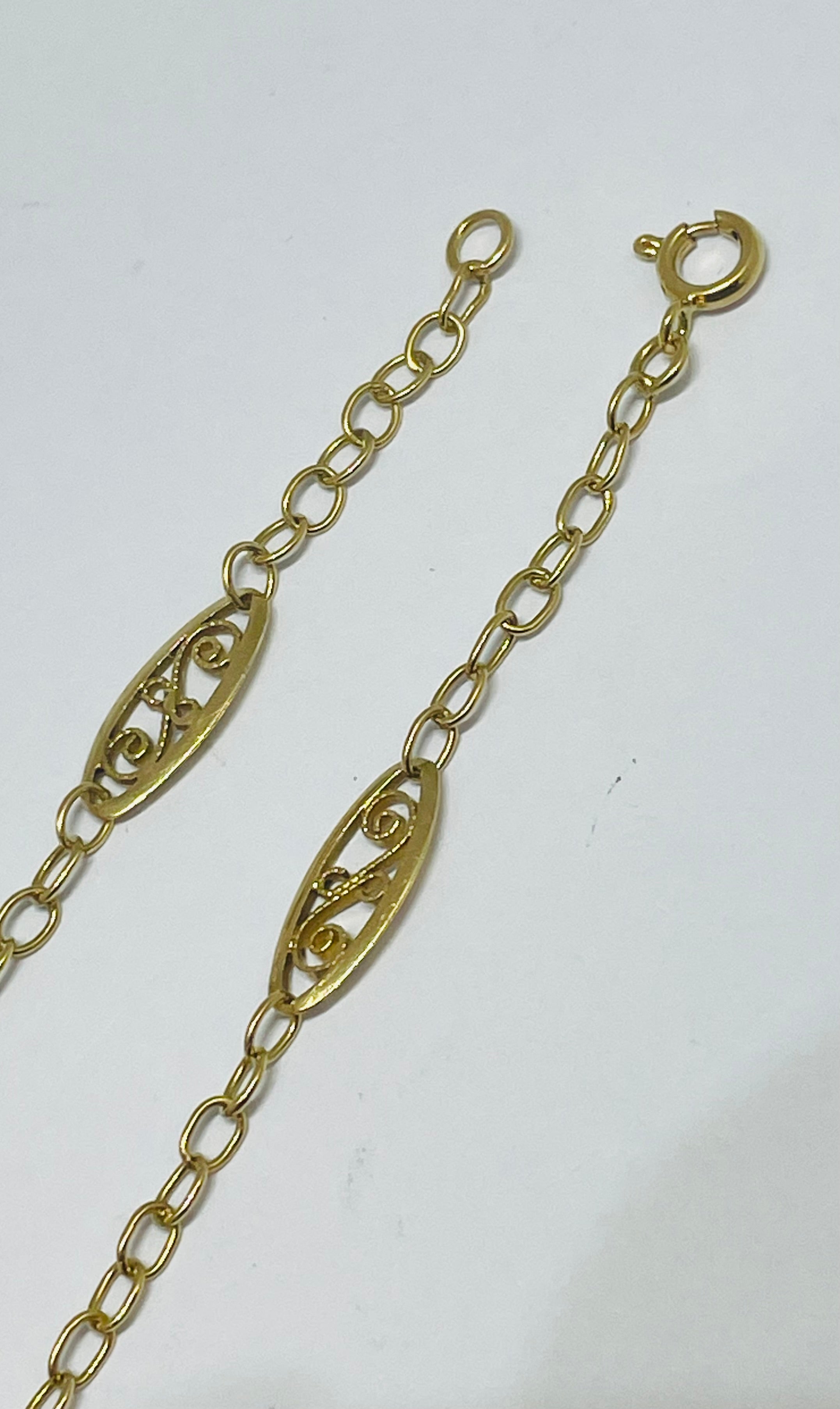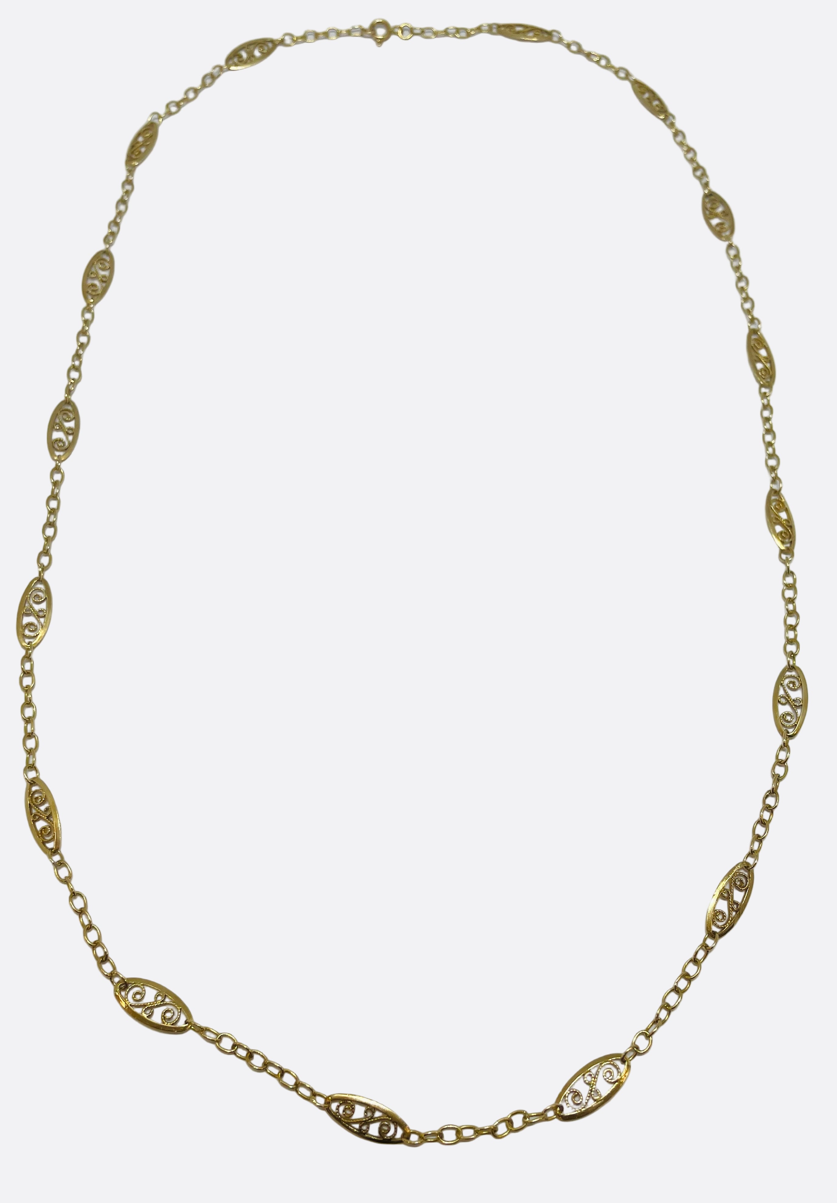 Collier matinée en or jaune 750/1000 (18 carats), maille filigrane ovale, équipé d’un fermoir anneau ressort et poinçonné 750. Avec ses 11,80 g et sa longueur de 68,5 cm, il offre une belle présence élégante. En état comme neuf, c’est un collier lumineux et raffiné, prêt à porter.