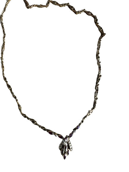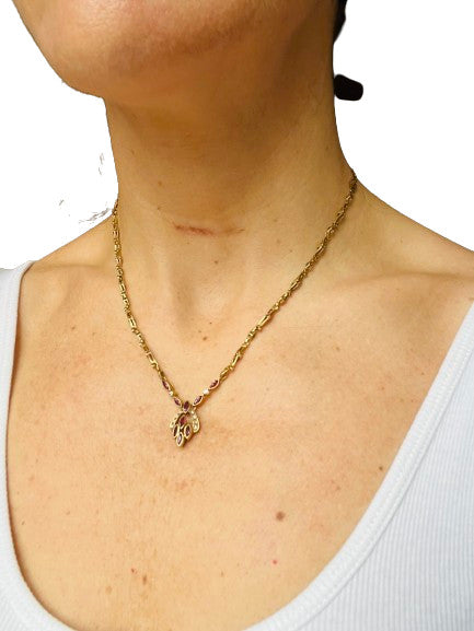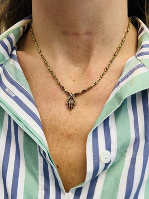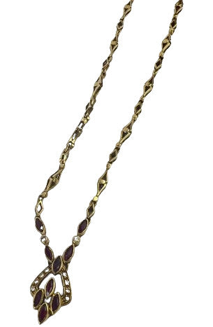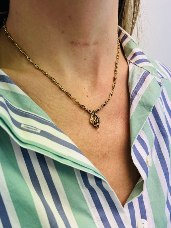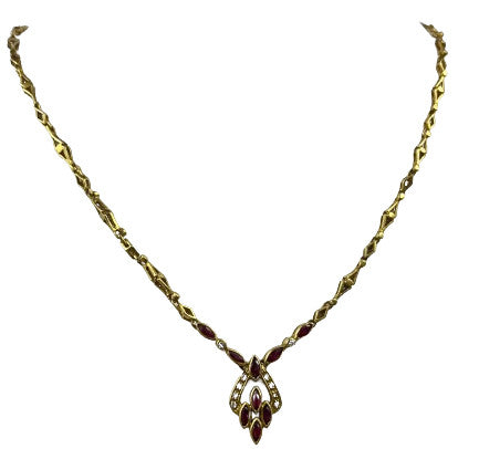 Collier en or jaune 18 carats (750/1000) à maillons losangiques ajourés, centré d'un motif rehaussé de rubis navette et de diamants