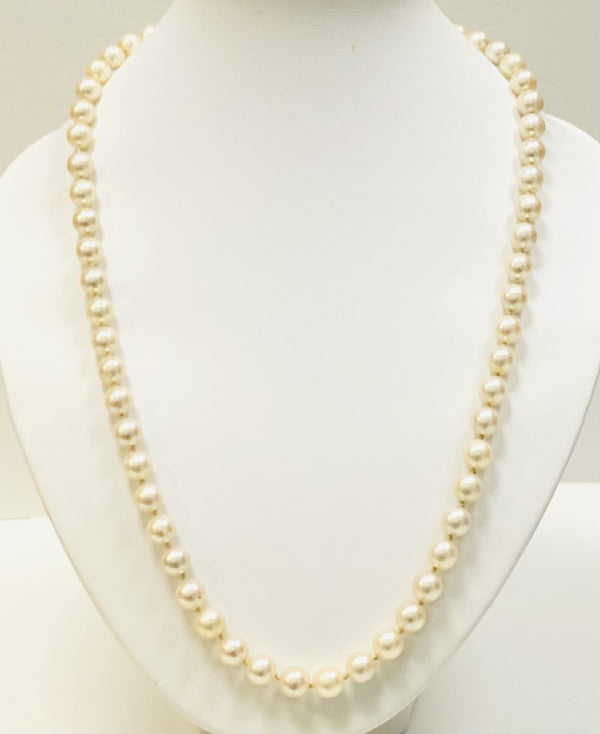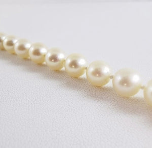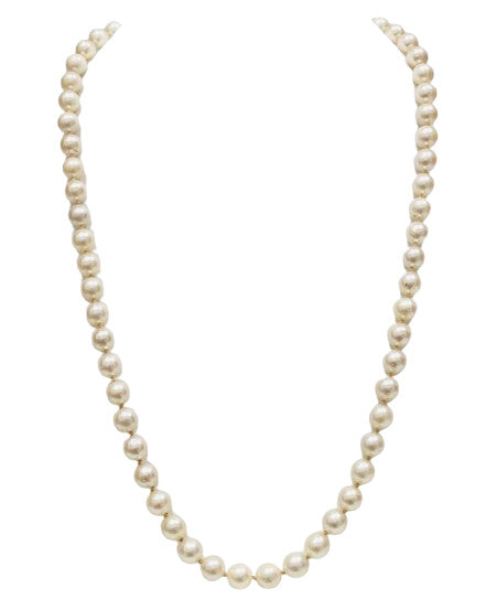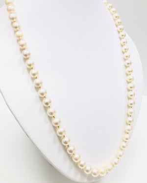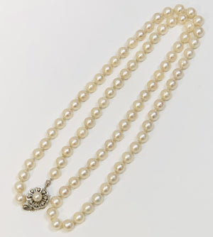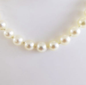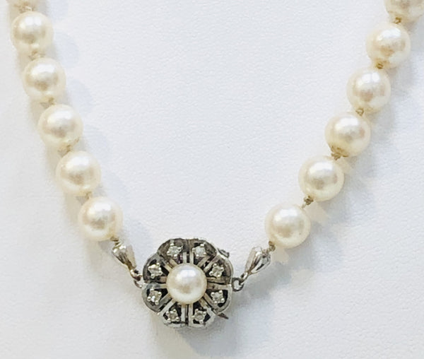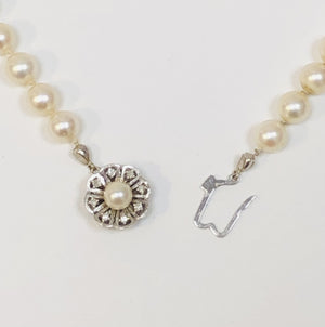 Collier de Perles de Culture de Ø 7 mm environ.Le collier de perles est un classique de la bijouterie, à porter lors de grands événements il rehausse une tenue. Ce collier comporte des perles de Culture de qualité qui ont un bel éclat pour un rendu magnifique.Fermoir en forme de fleur en or Blanc 585/1000 Poids orné d’une perle et 8 diamants x 0,01 carat