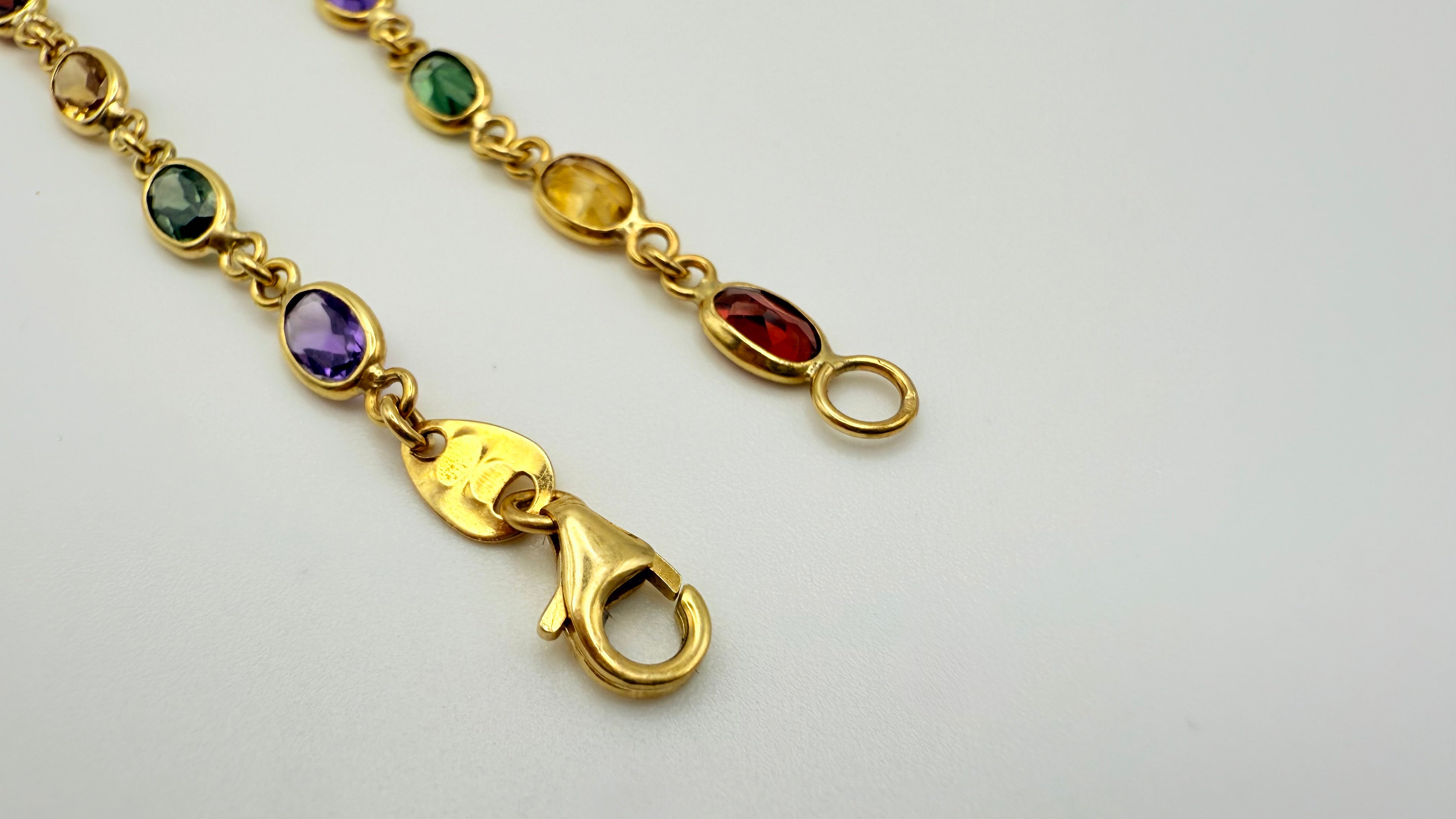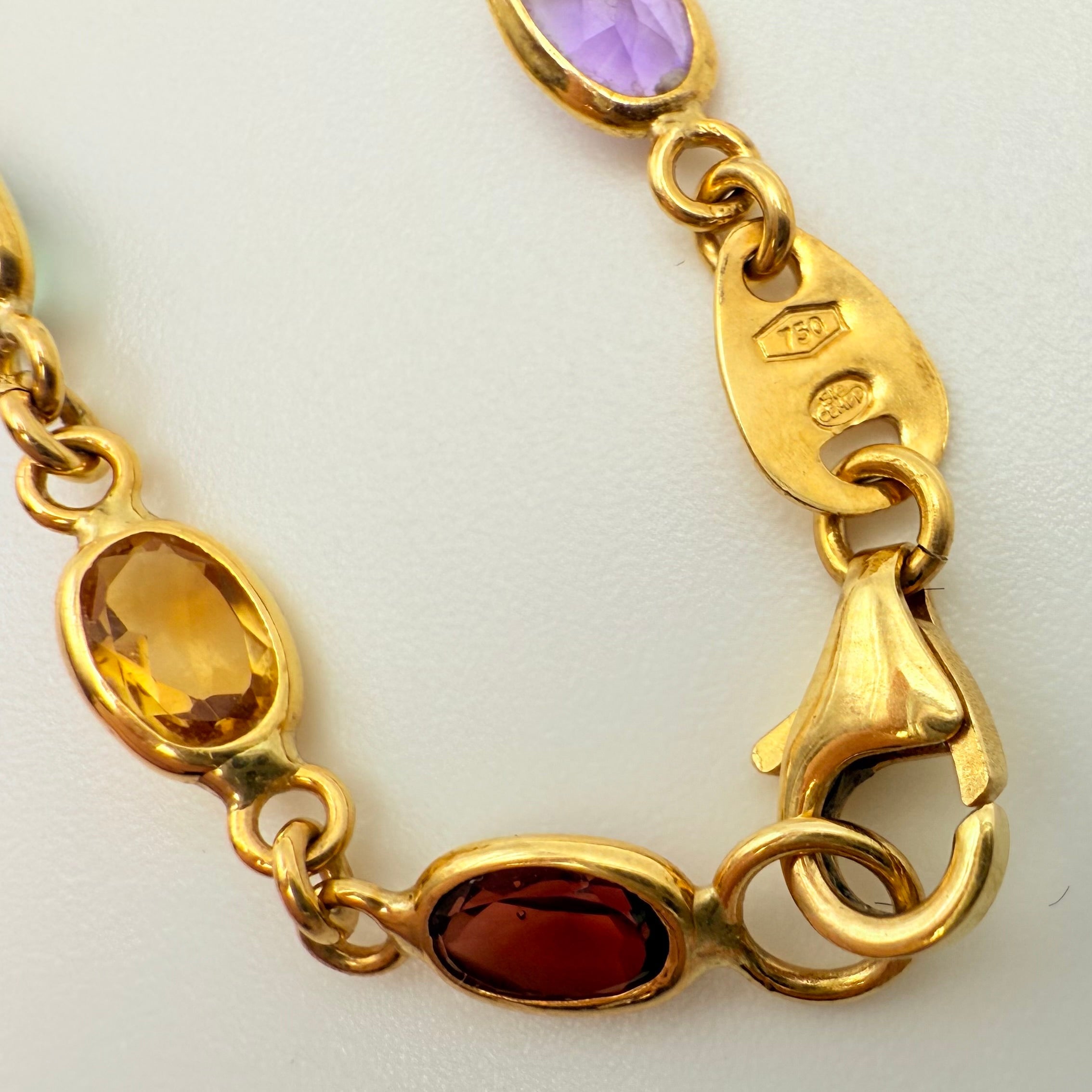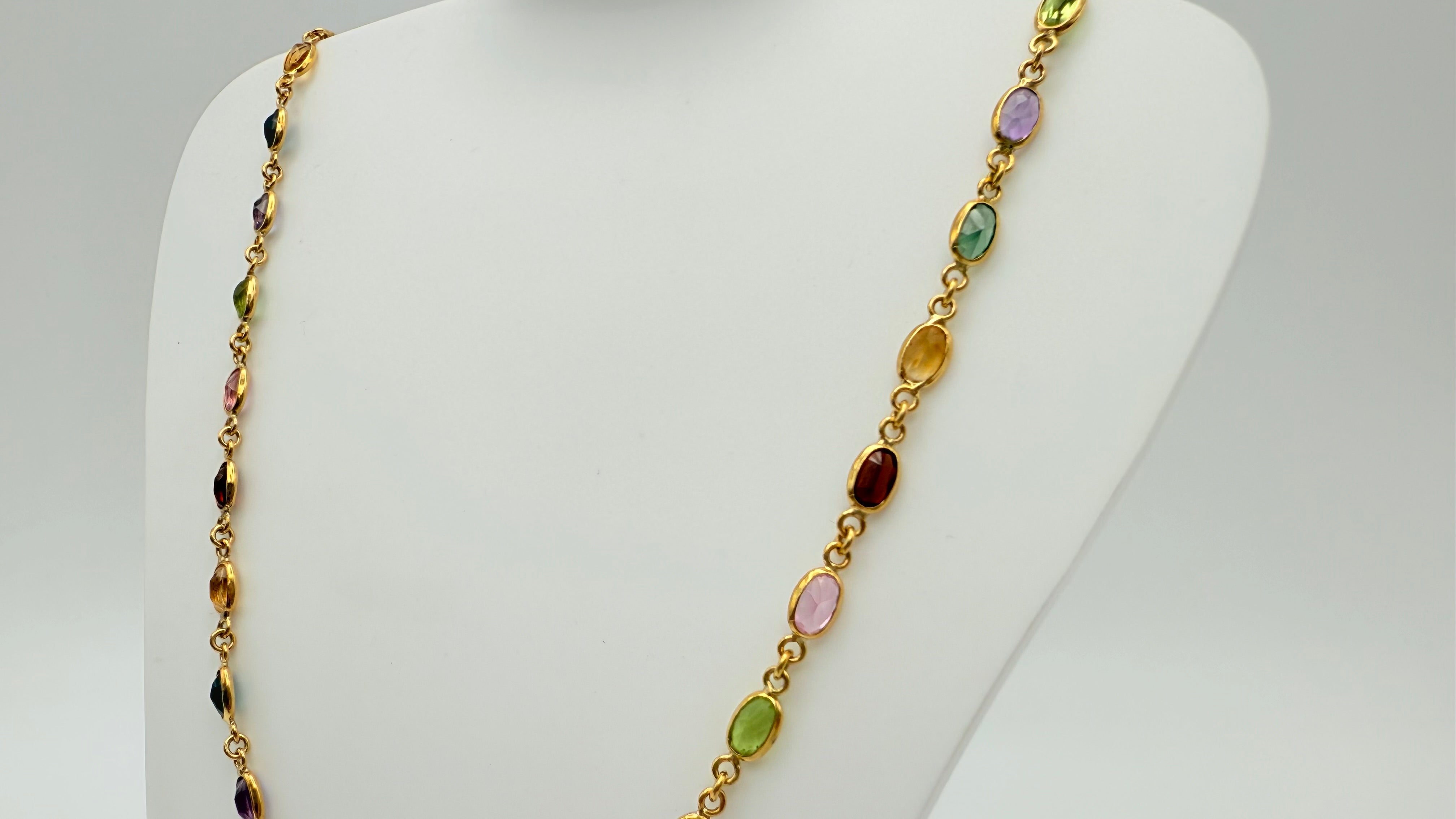 Collier princesse en or jaune 18 carats, maille fantaisie. Orné de pierres diverses, il mesure 43 cm pour un poids de 10 g. En excellent état, comme neuf.