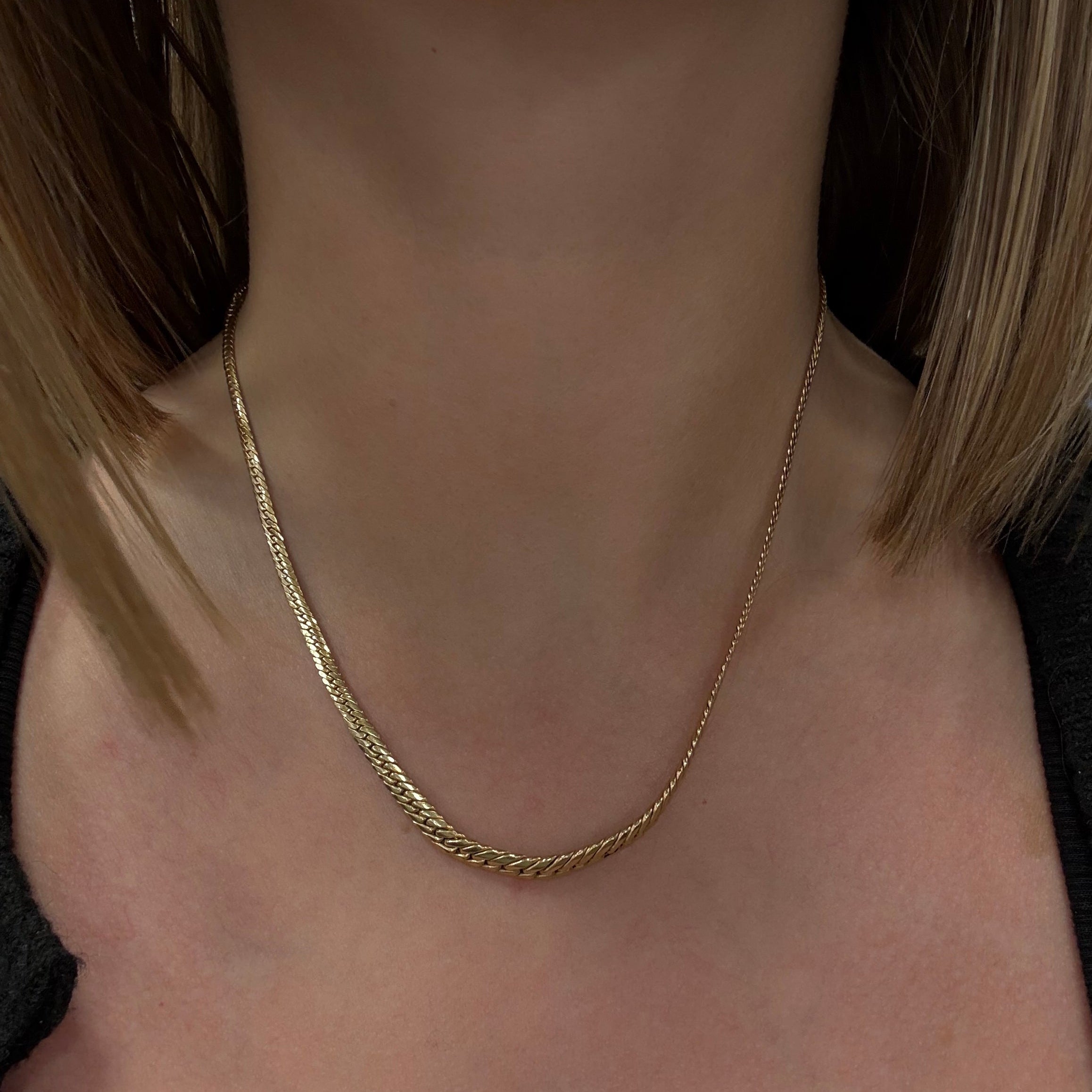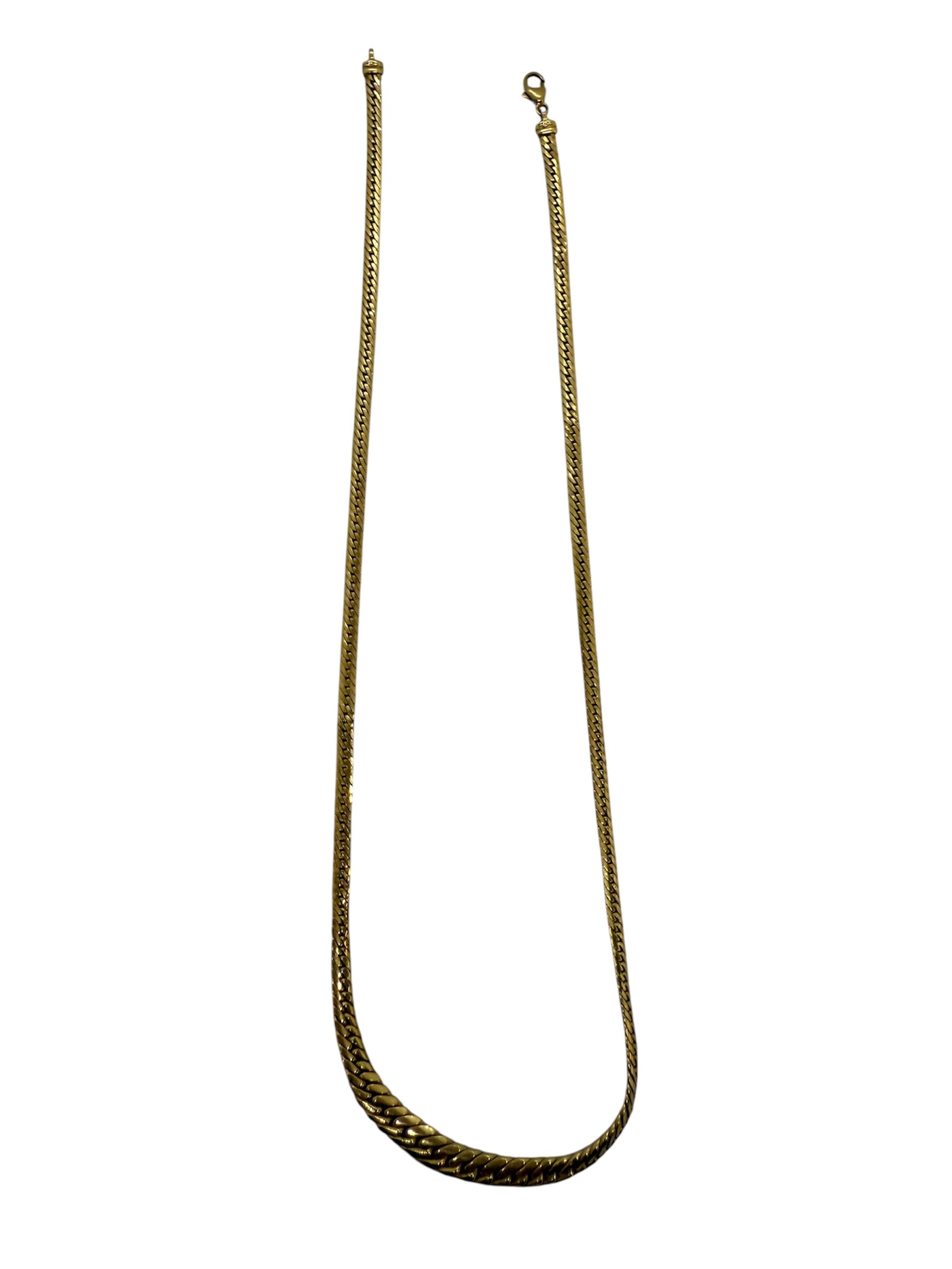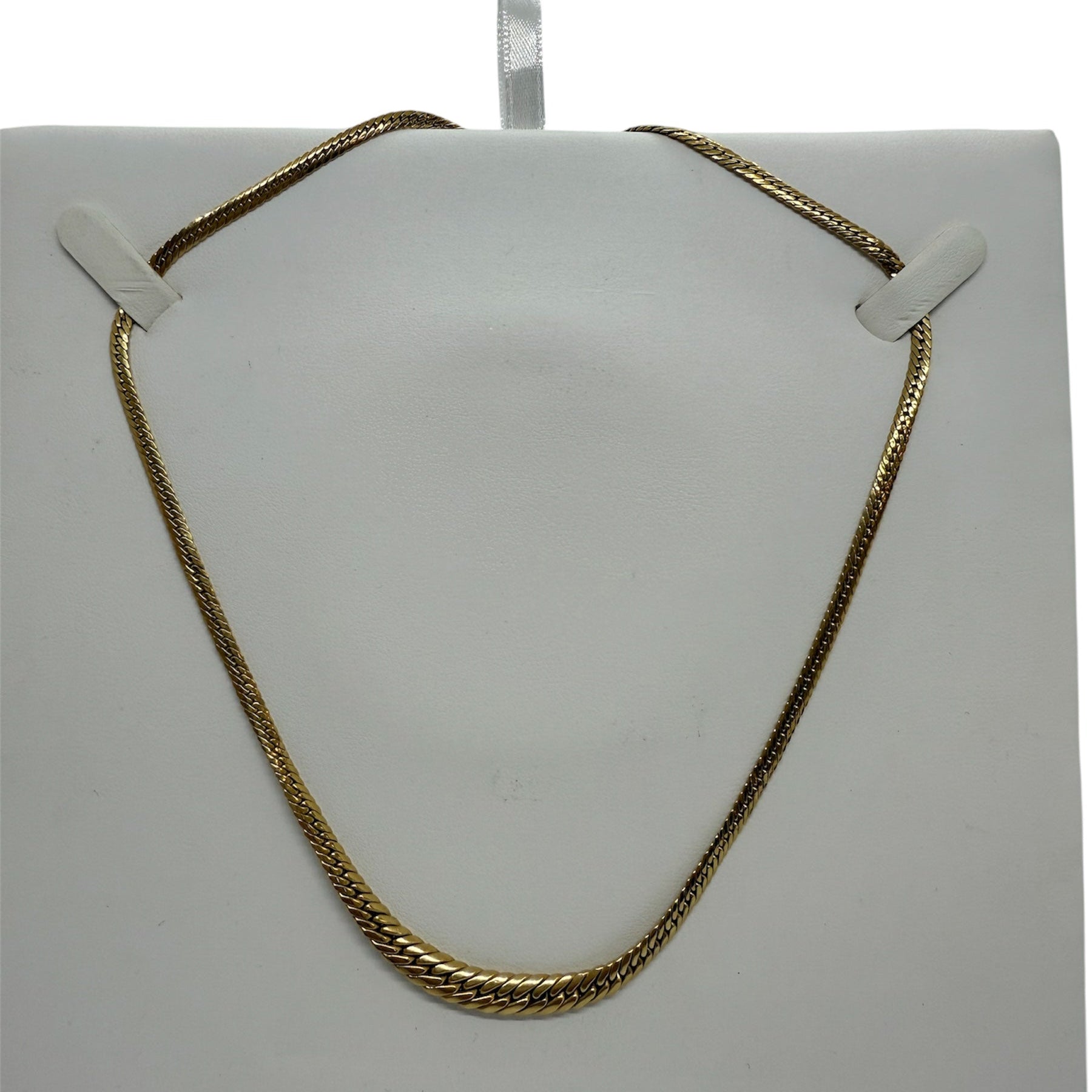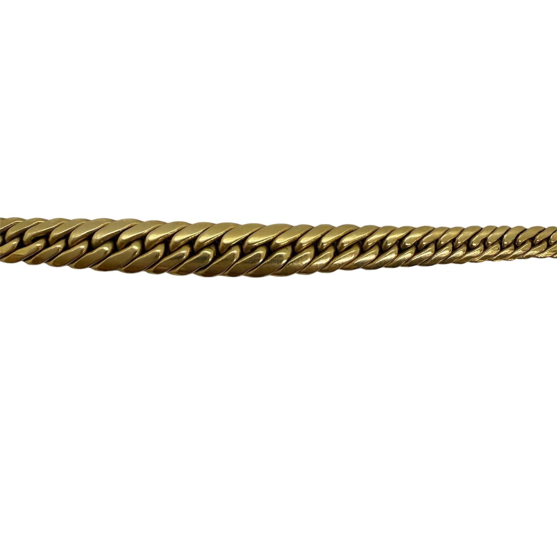 Collier de type princesse en or jaune 18 carats (750/1000), sans poinçon, doté d’une maille anglaise élégante. Il mesure 20 cm de long, 5 mm de large et 1 mm d’épaisseur. Fermé par un mousqueton, ce modèle ne comporte aucune pierre. L’ensemble est présenté en très bon état général.