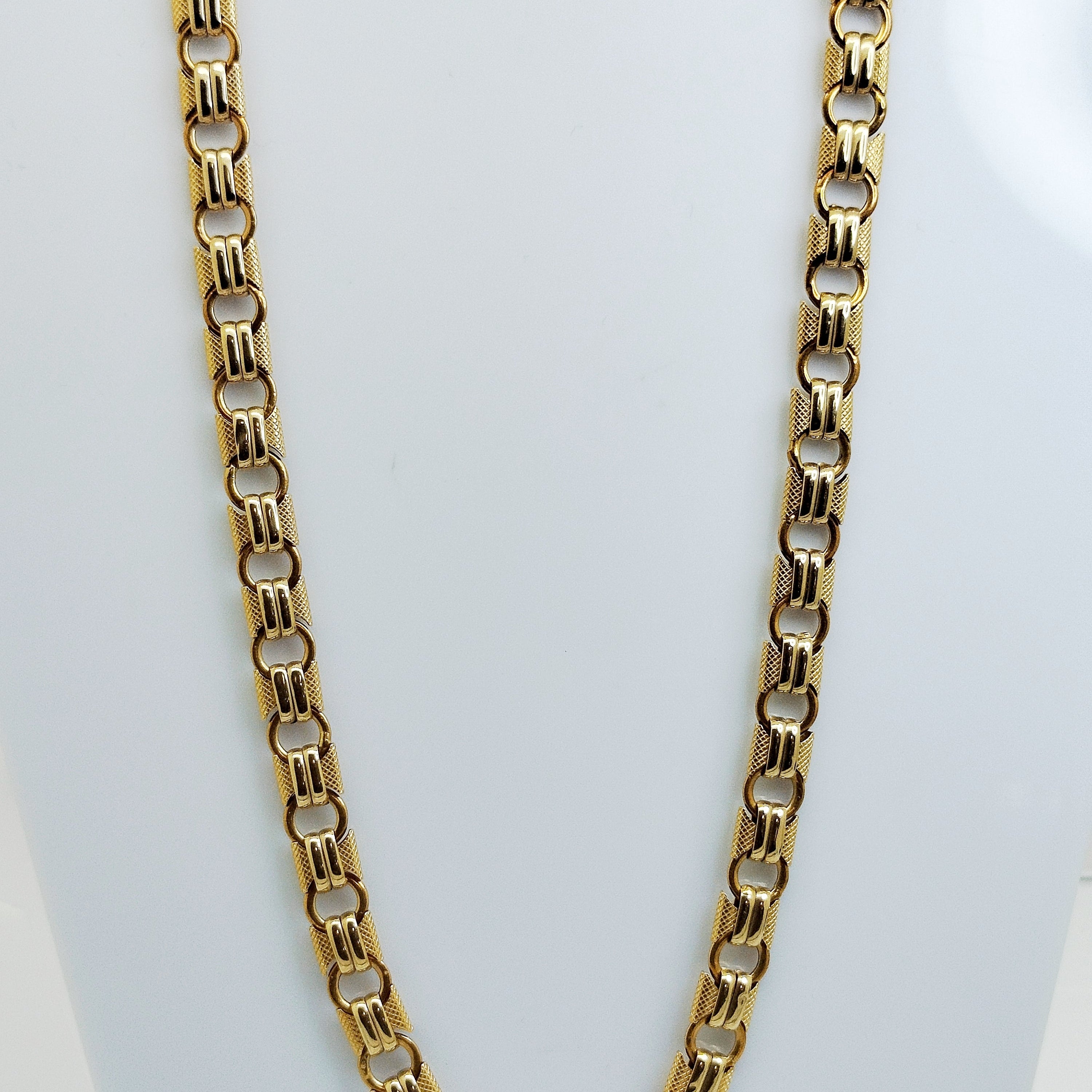 Collier princesse maille fantaisie en or jaune 18 carats, poinçon 750, fermoir bouée. Longueur 44,5 cm, largeur 1 cm, épaisseur 0,2 cm, poids 21,73 g, sans pierres, en très bon état.