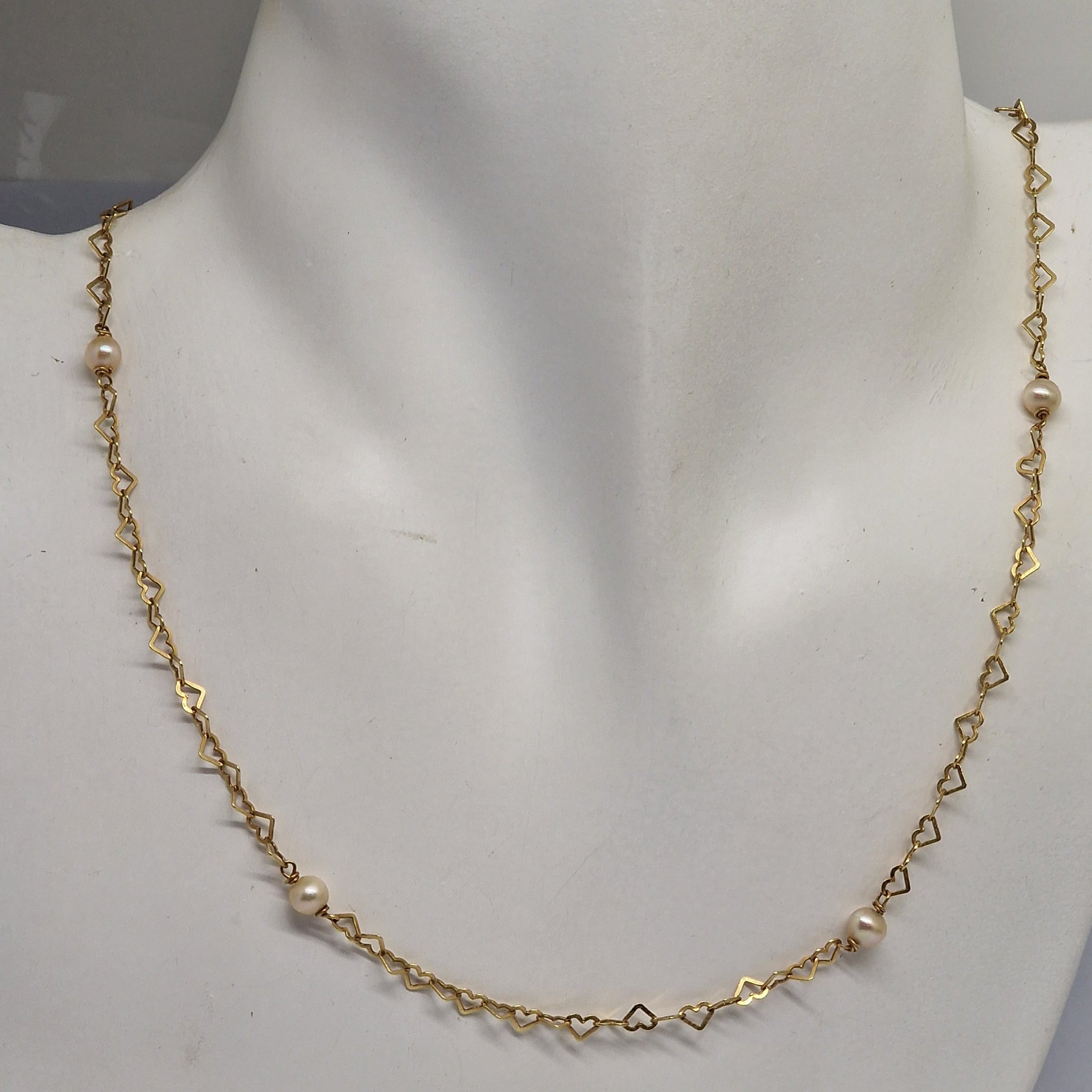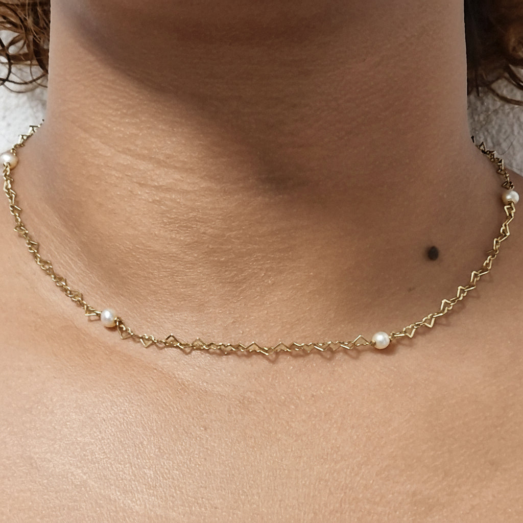 Charmant et raffiné, ce collier maille fantaisie en or jaune 18 carats est sublimé par de délicates perles, offrant une harmonie parfaite entre éclat et douceur. Long de 42,2 cm et muni d’un fermoir à anneau ressort, il combine élégance et confort. En bon état, ce bijou de 4,03 g apporte une touche de sophistication intemporelle à toute tenue.
