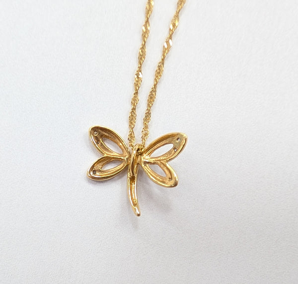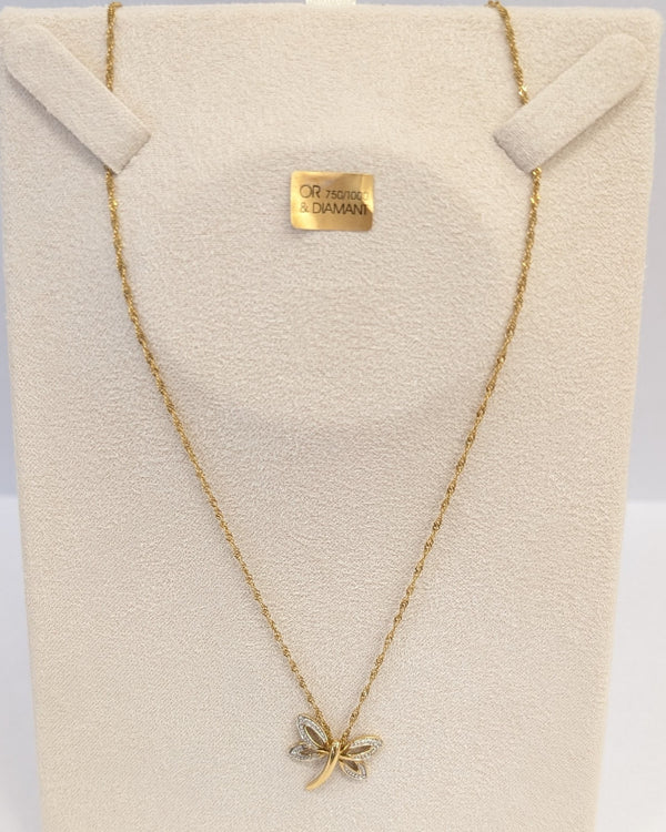 Collier de type Princesse en or jaune 750/1000 (18 carats), composé d'une chaîne torsadée avec fermoir à anneau ressort, poinçonné 750. La chaîne mesure 50 cm et est accompagnée d’un pendentif de 1,2 cm, serti de 4 diamants de 0,01 carat chacun. Le tout pèse 2,63 g et se présente en très bon état.