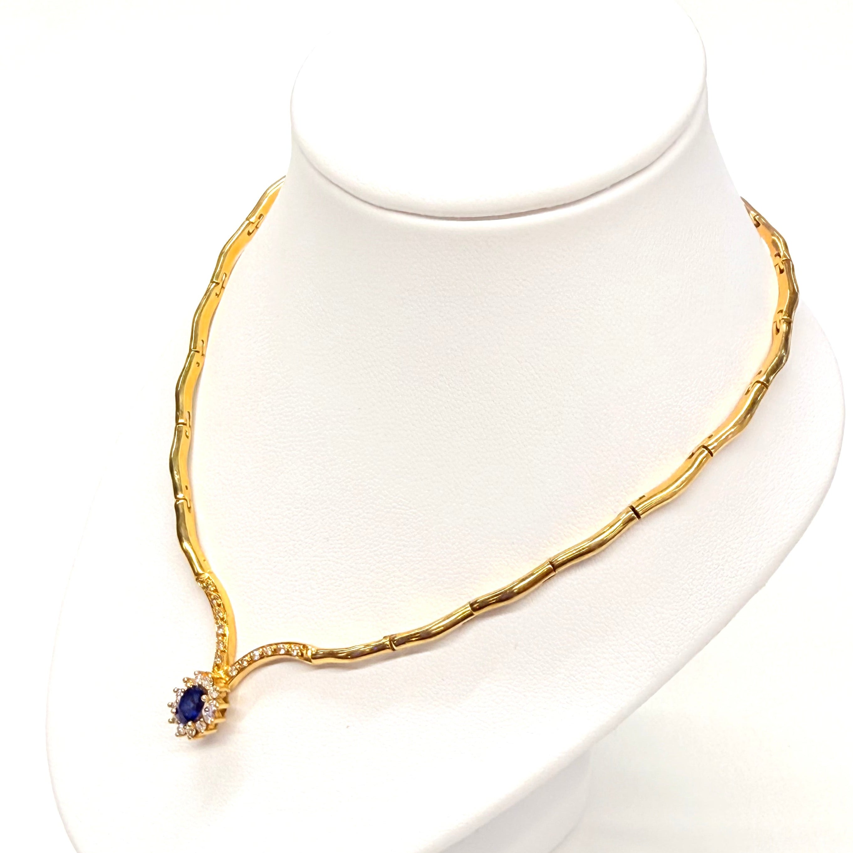 Ras du cou raffiné en or jaune 750/1000, conçu avec une maille câble articulé élégante et lumineuse. Sertie de 24 éclats de diamants et d’un saphir de 0,6 x 0,4 cm, cette pièce allie éclat et sophistication.