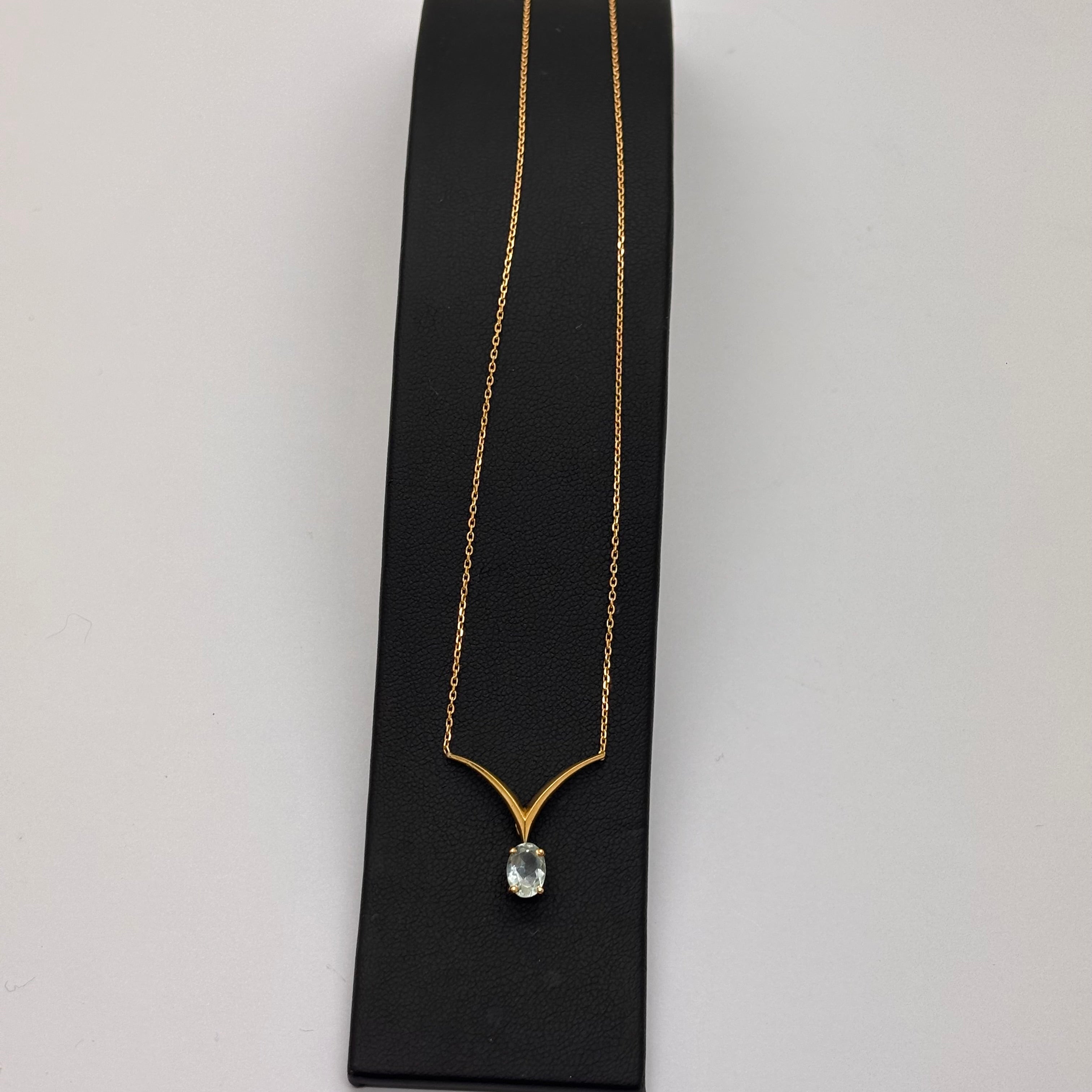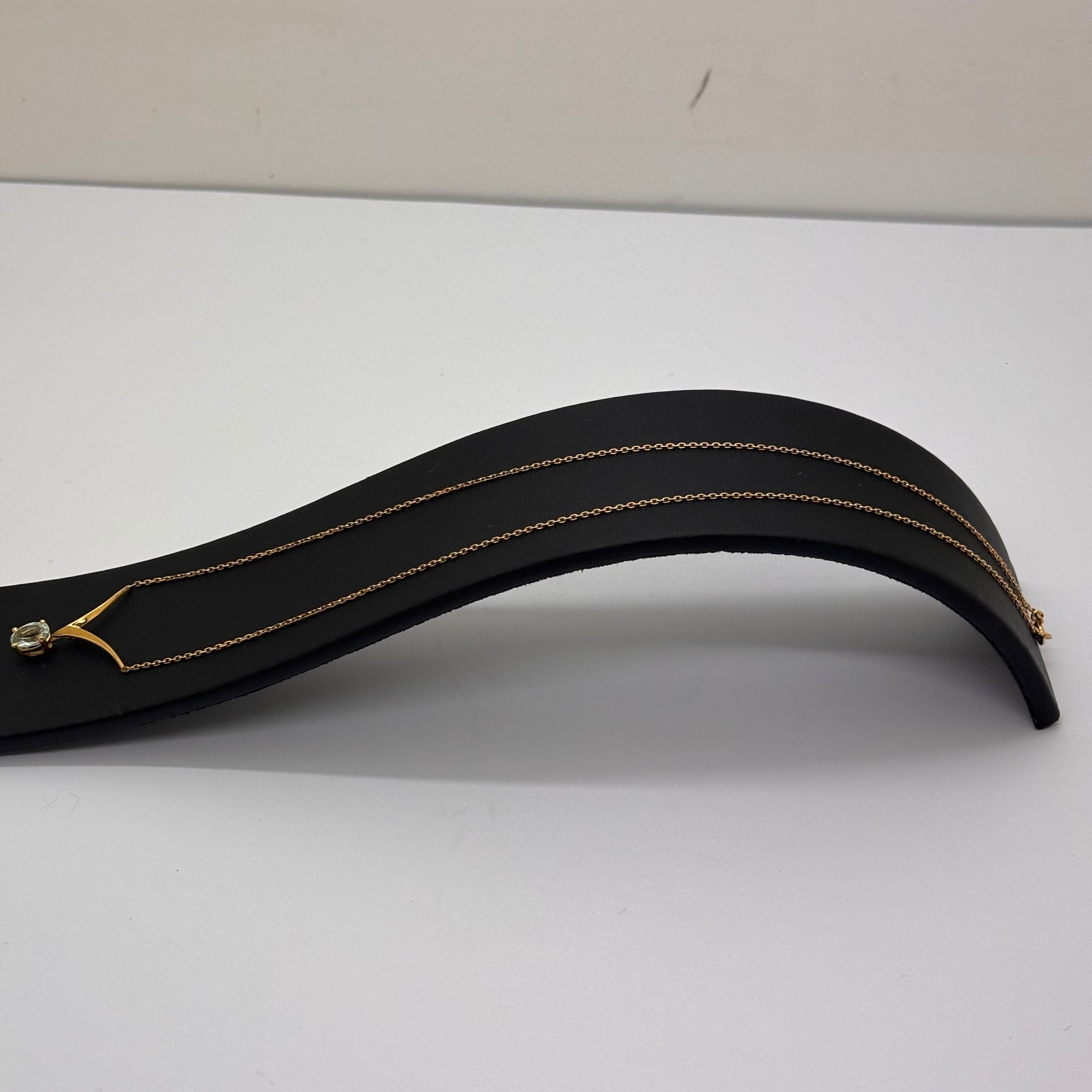 Collier ras du cou en or jaune 18 carats (750/1000), doté d’une maille forçat et d’un fermoir à mousqueton, pèse 2.83 grammes, mesure 40.5 CM de long avec une largeur et une épaisseur de 1 MM, est serti d'une aigue marine et se présente en bon état.