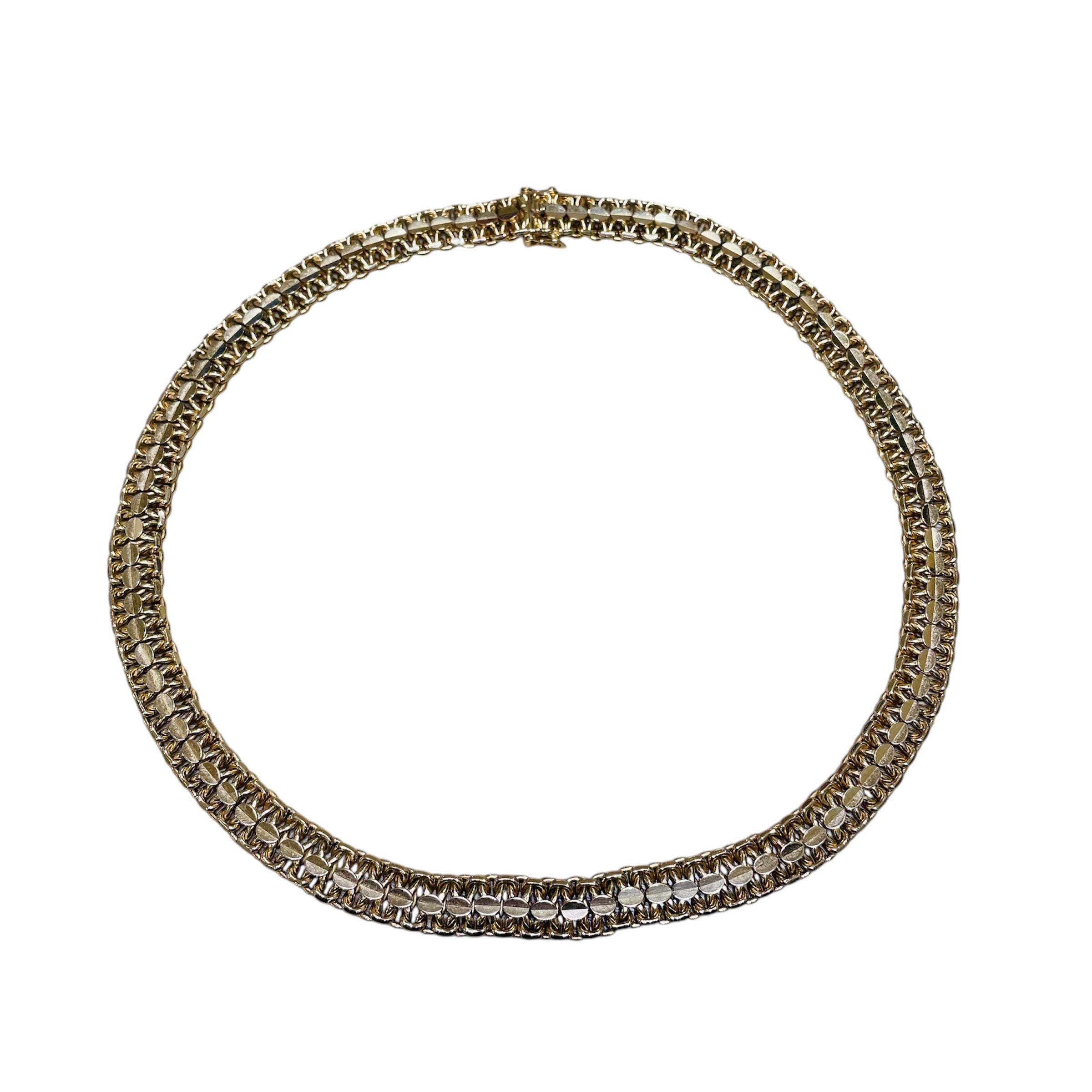 Collier ras du cou en or jaune 18 carats (750/1000), maille tressée royale, avec fermoir à cliquet. Poinçonné tête d’aigle. Poids : 33,31 g, longueur : 45 cm, largeur : 1 cm, épaisseur : 2 cm. Sans pierres. Bon état