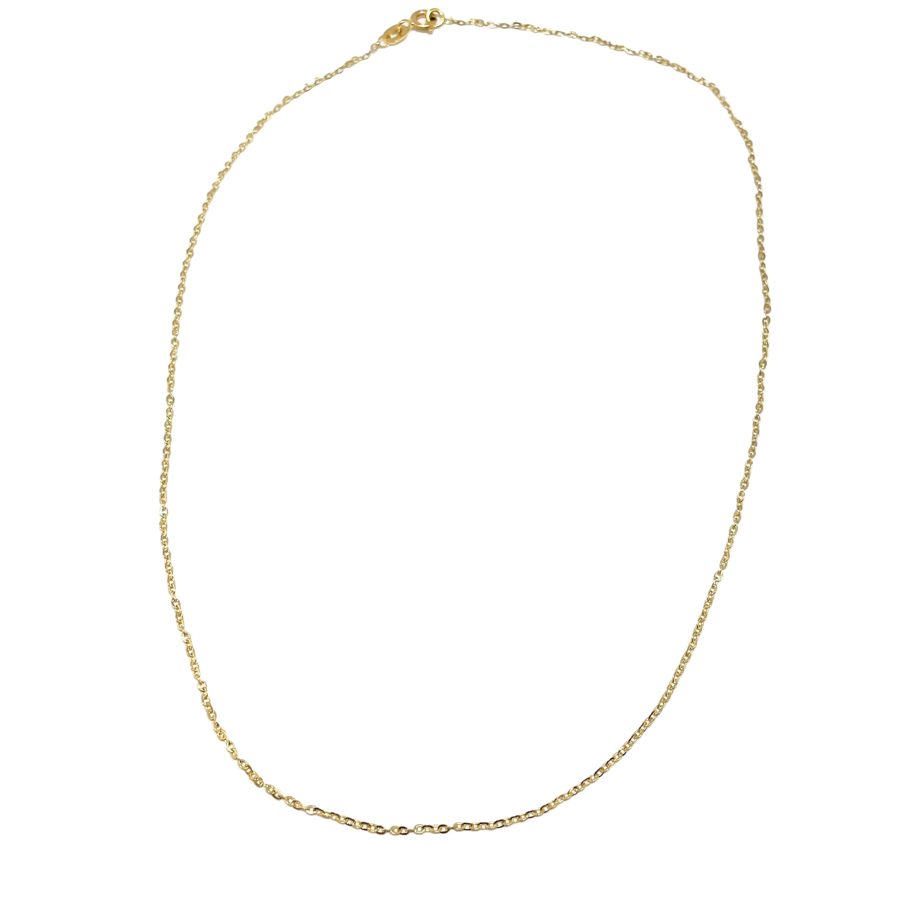Collier ras du cou en maille forçat, réalisé en or jaune 750/1000 (18 carats) et poinçonné 750, affichant un poids de 0,97 g. Il mesure 40 cm de longueur, pour une largeur de 10 cm et une épaisseur de 1 mm, et dispose d’un fermoir anneau ressort