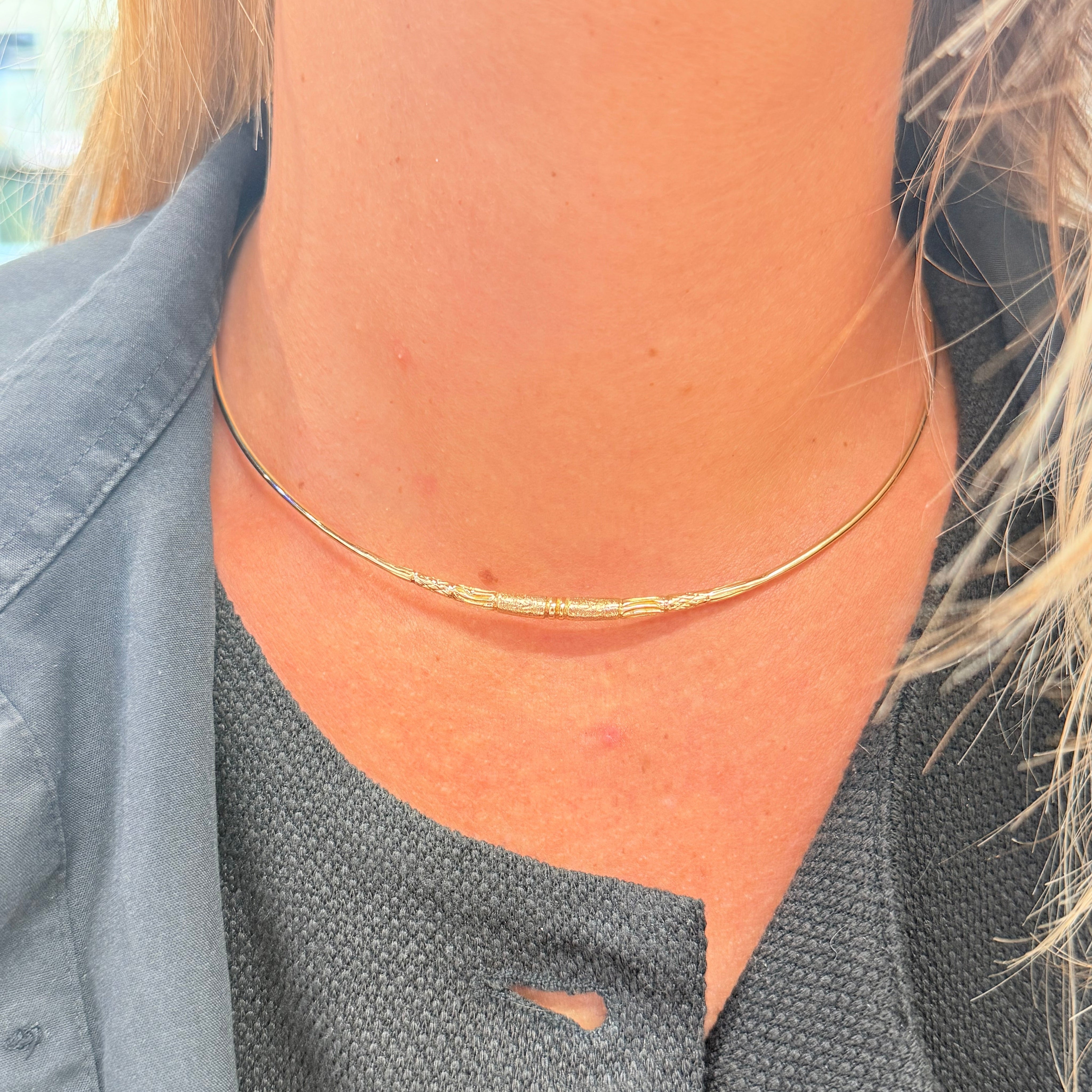 Collier ras du cou jonc en or jaune 18 carats (750/1000) avec fermoir crochet S. Poinçon tête d’aigle, poids 16,11 g, diamètre 12,5 cm, largeur 0,3 cm, en très bon état.
