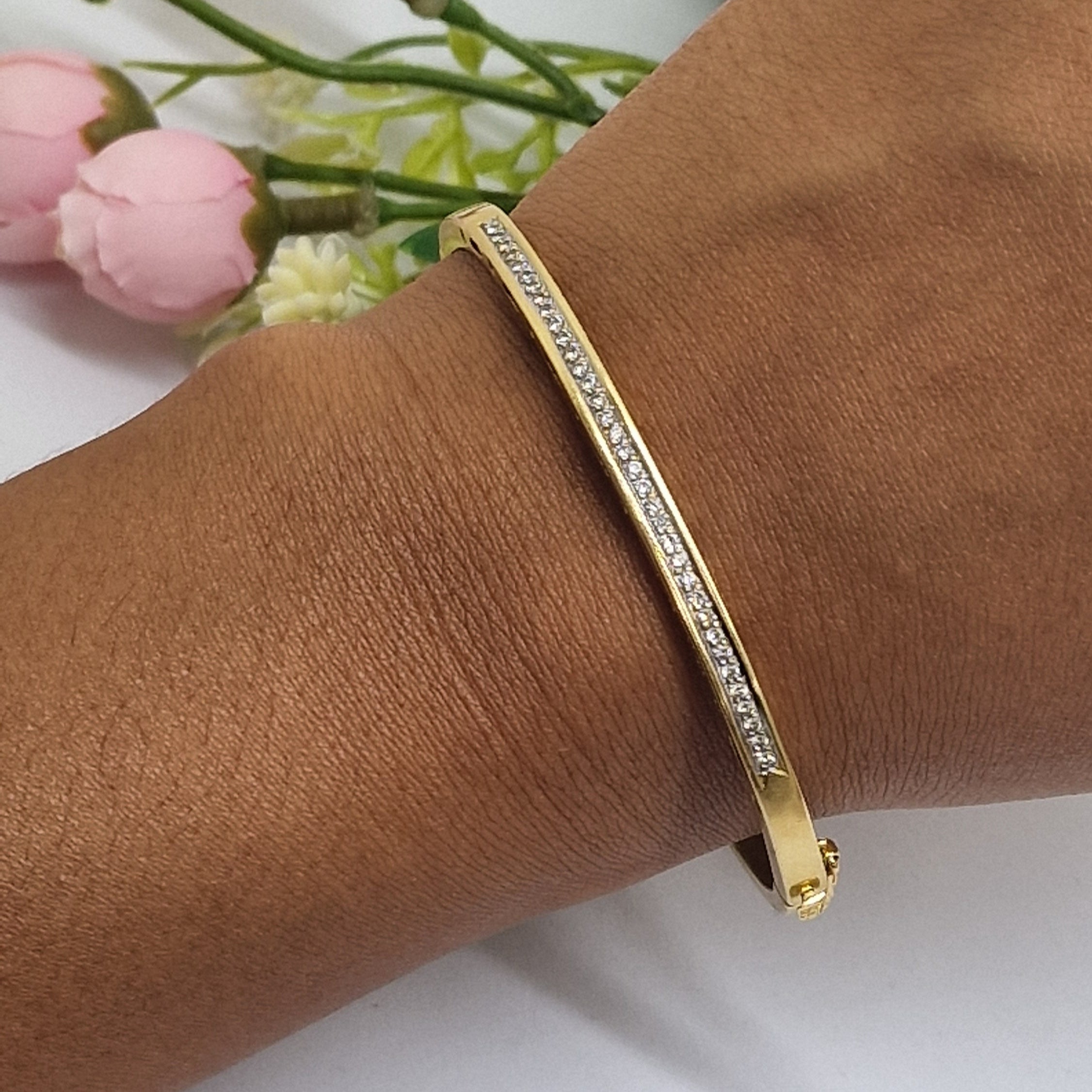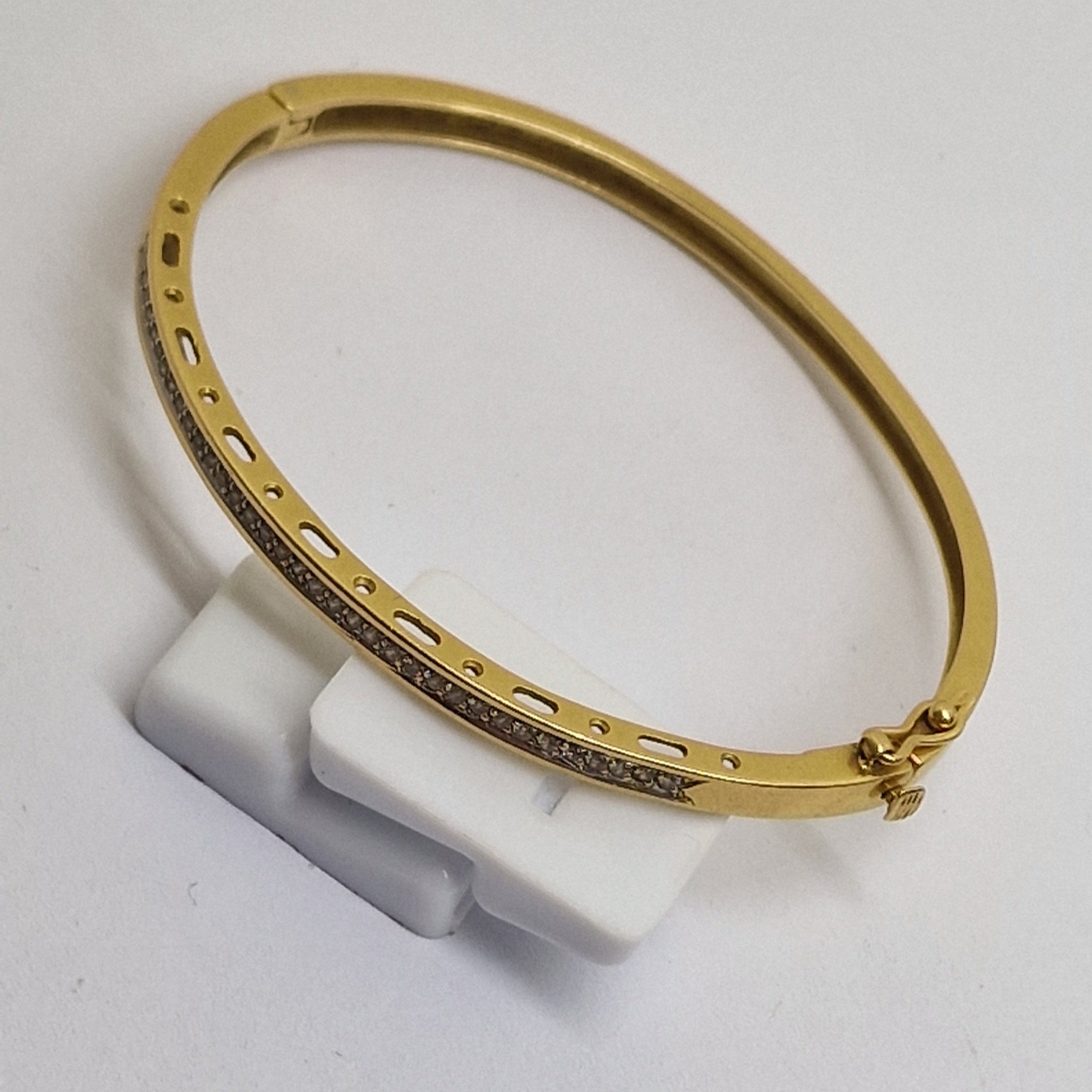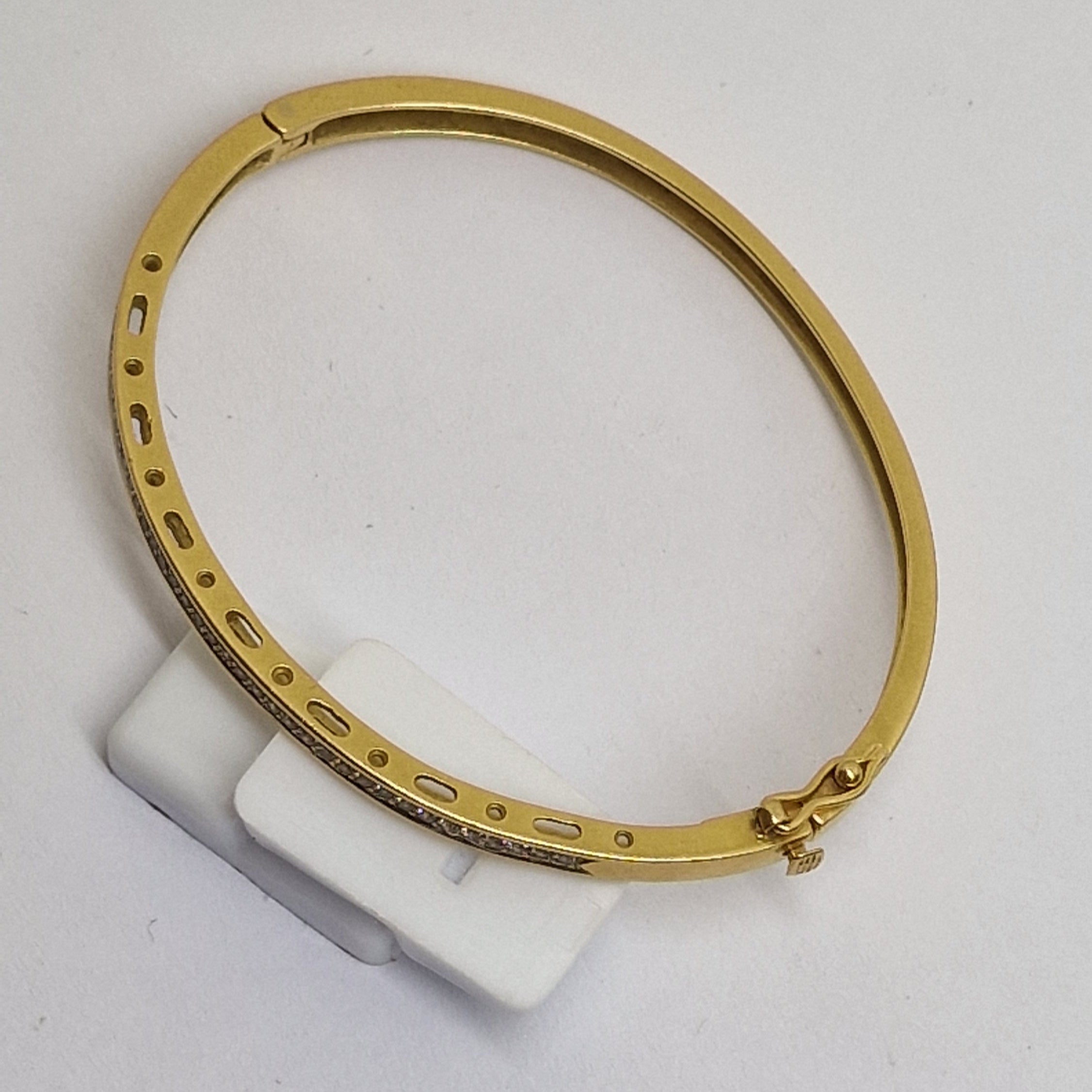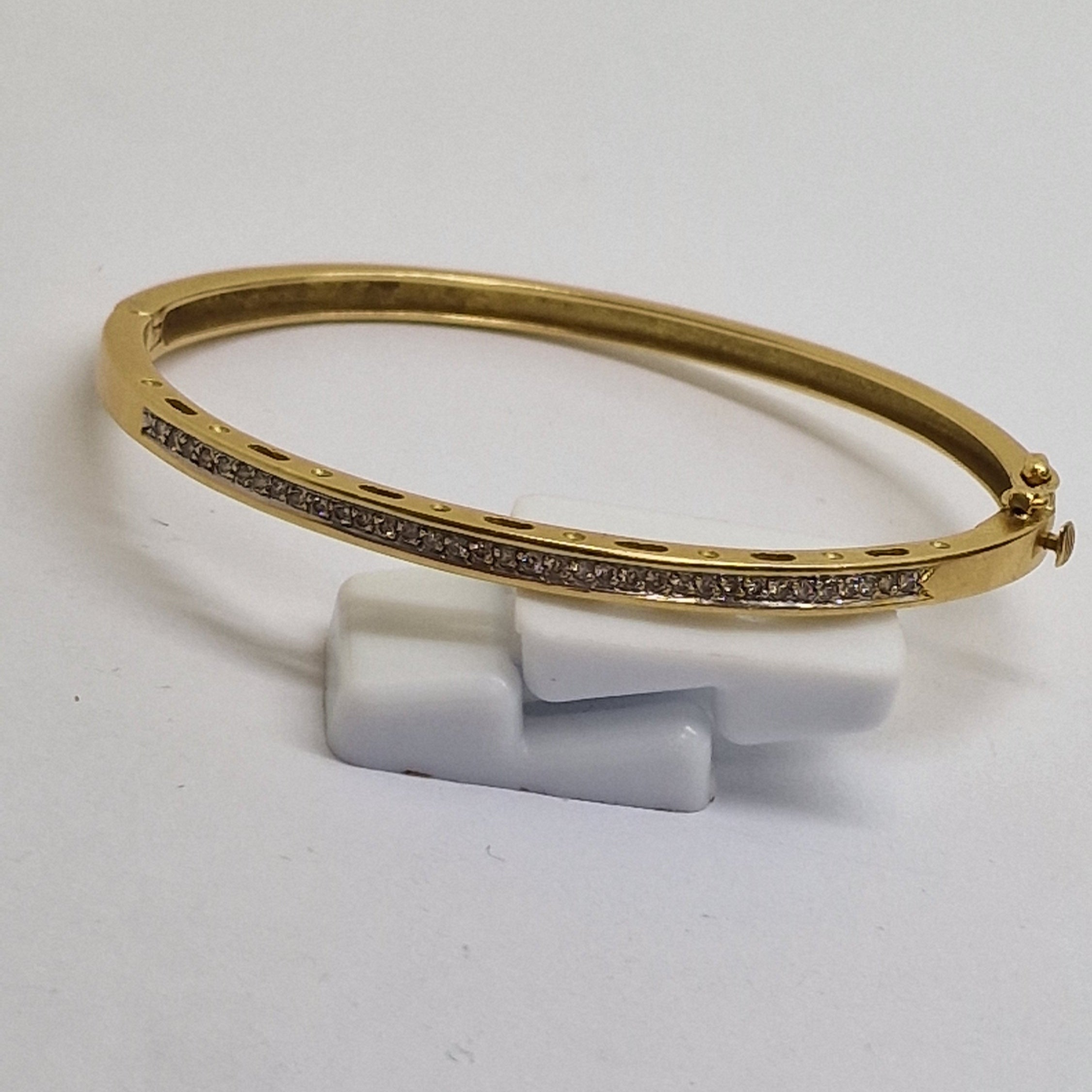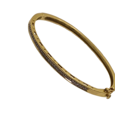 Bracelet de type jonc est réalisé en or jaune 18 carats (titrage 750/1000), avec poinçon tête d’aigle. Il présente une maille rigide, mesurant 5,2 cm sur 6,5 cm, avec une épaisseur de 4 mm, pour un poids de 14,72 grammes. Équipé d’un fermoir à cliquet, il est orné de diamants et se trouve en bon état.