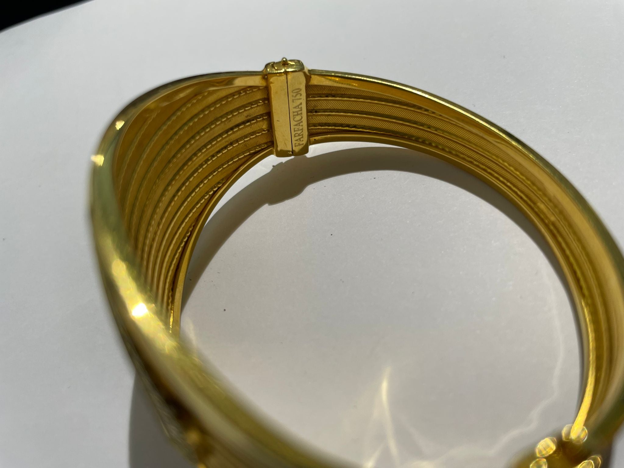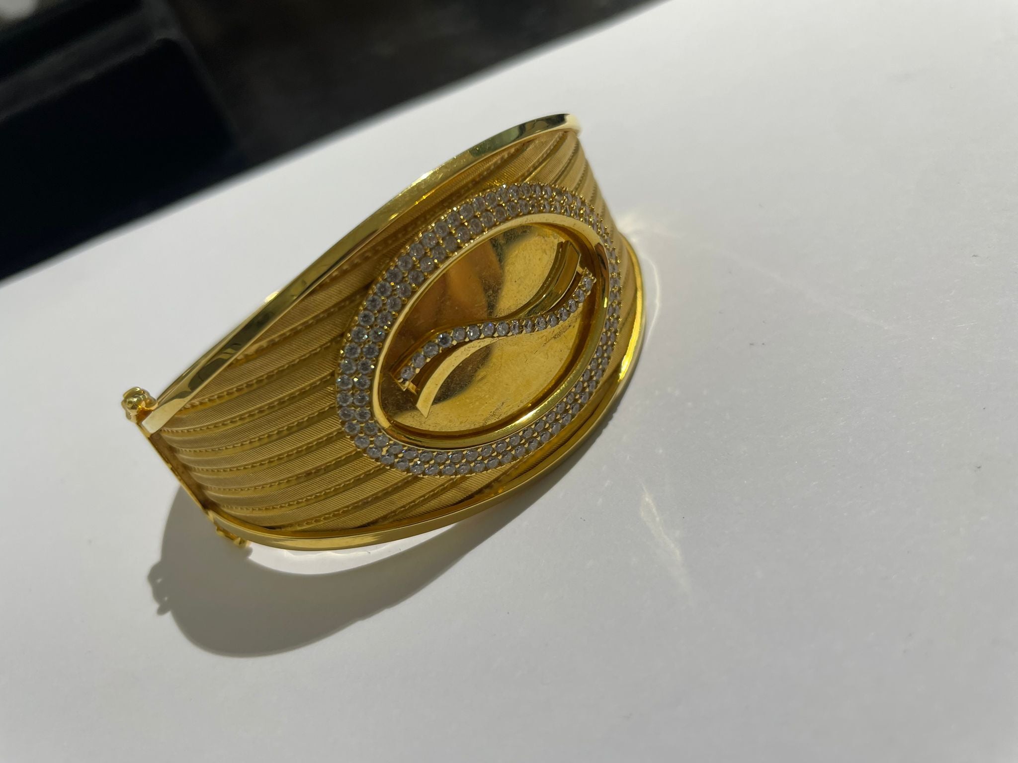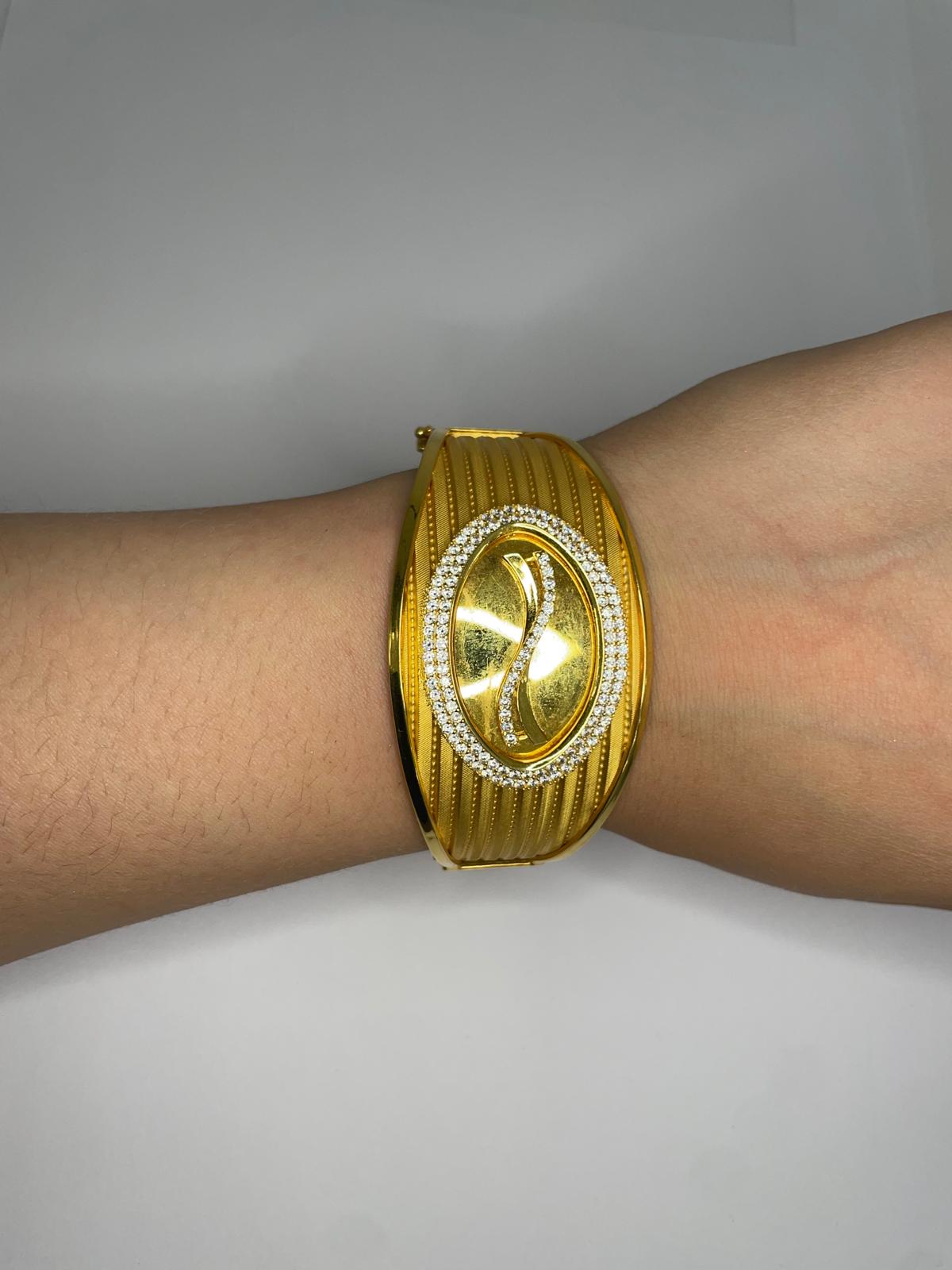 Bracelet jonc en or jaune 18 carats (750/1000), sans maille, doté d’un fermoir à cliquet discret. Ce modèle, sans poinçon, affiche un poids de 31 grammes et intègre des oxydes de zirconium en guise d’ornement. Ses dimensions sont de 6,5 cm de long, 5,5 cm de large et 0,3 cm d’épaisseur. État : Bon.
