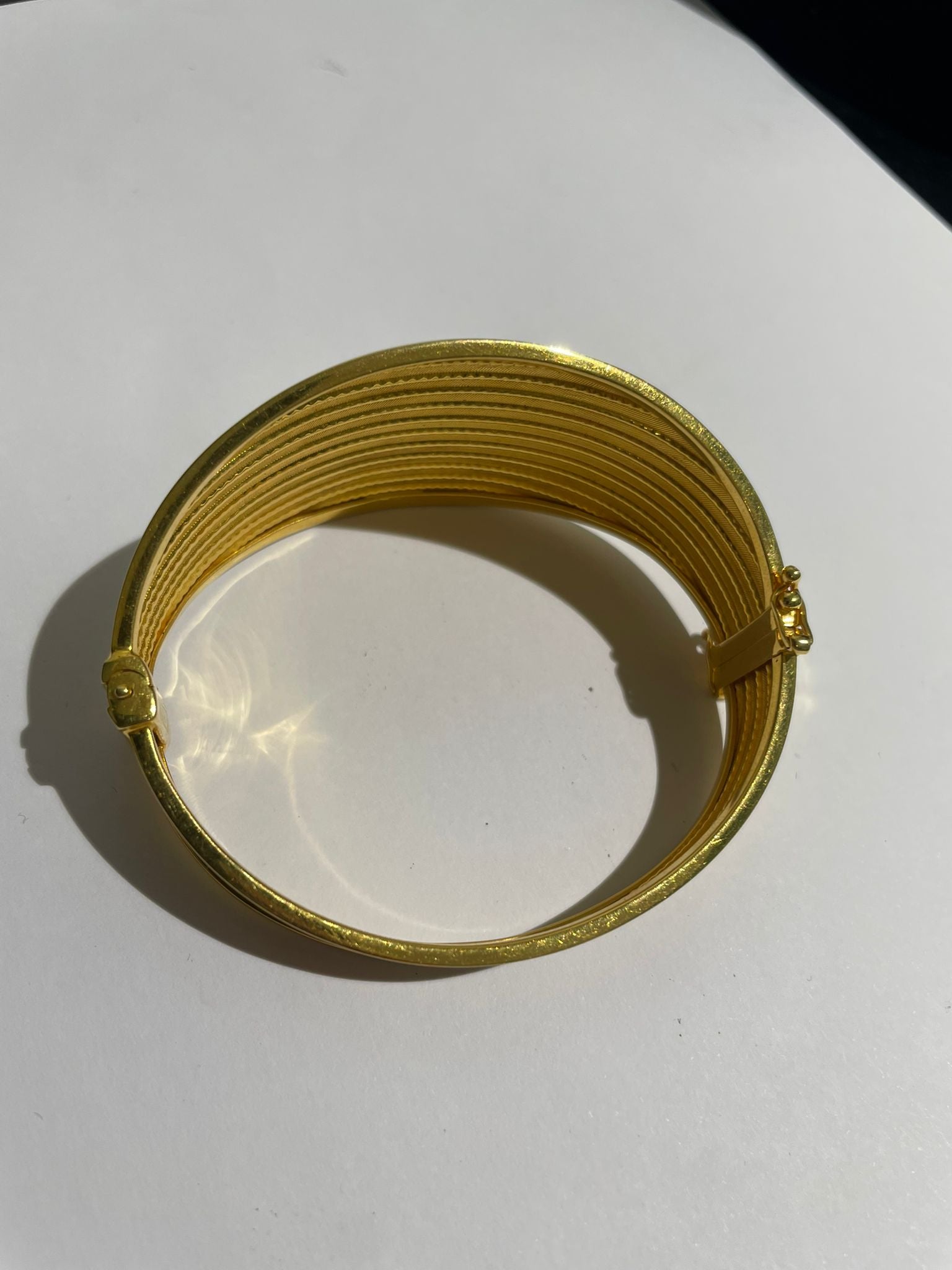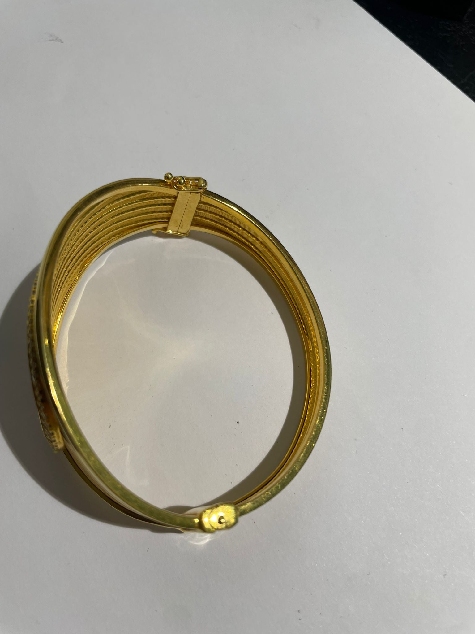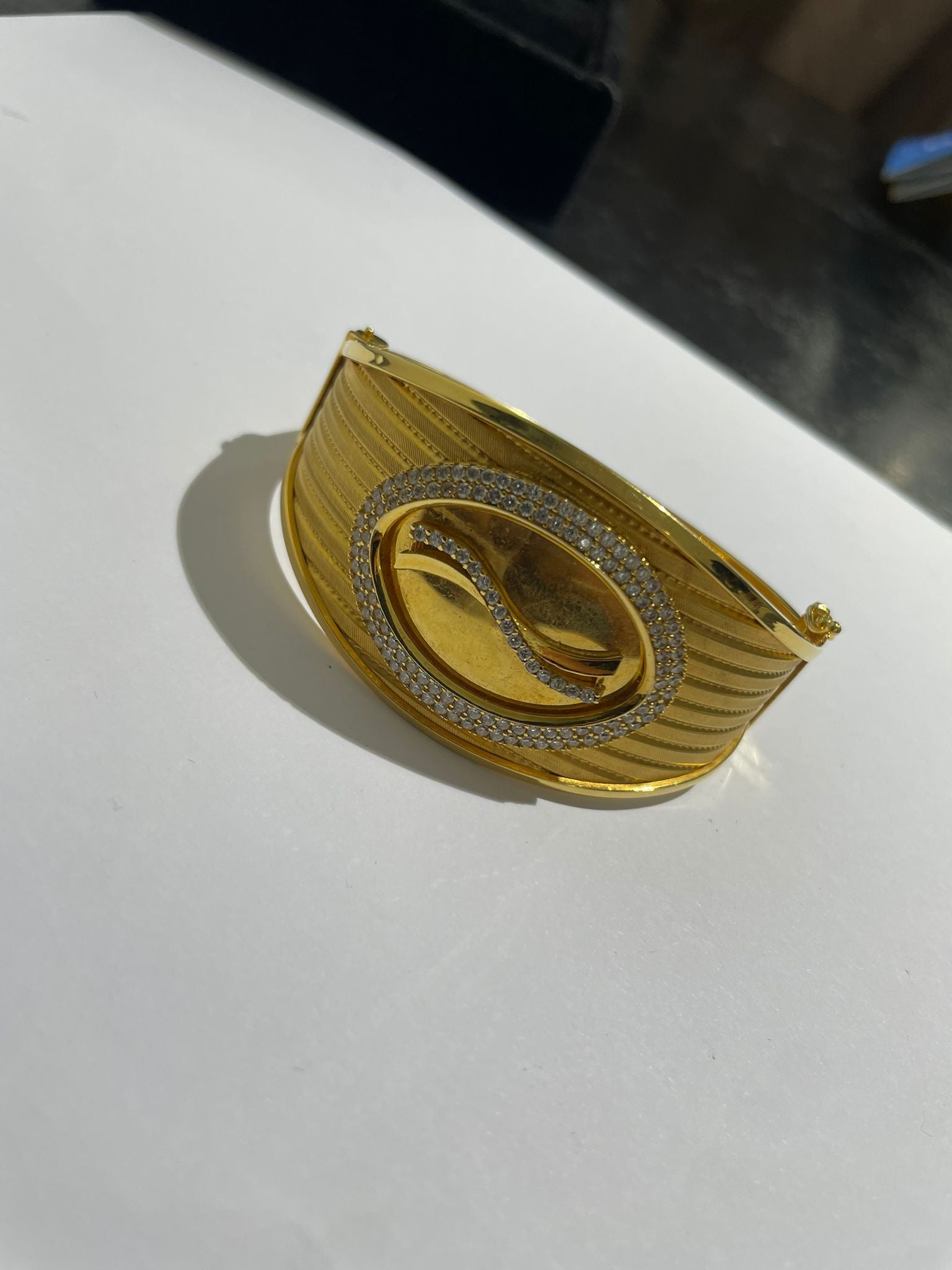 Bracelet jonc en or jaune 18 carats (750/1000), sans maille, doté d’un fermoir à cliquet discret. Ce modèle, sans poinçon, affiche un poids de 31 grammes et intègre des oxydes de zirconium en guise d’ornement. Ses dimensions sont de 6,5 cm de long, 5,5 cm de large et 0,3 cm d’épaisseur. État : Bon.
