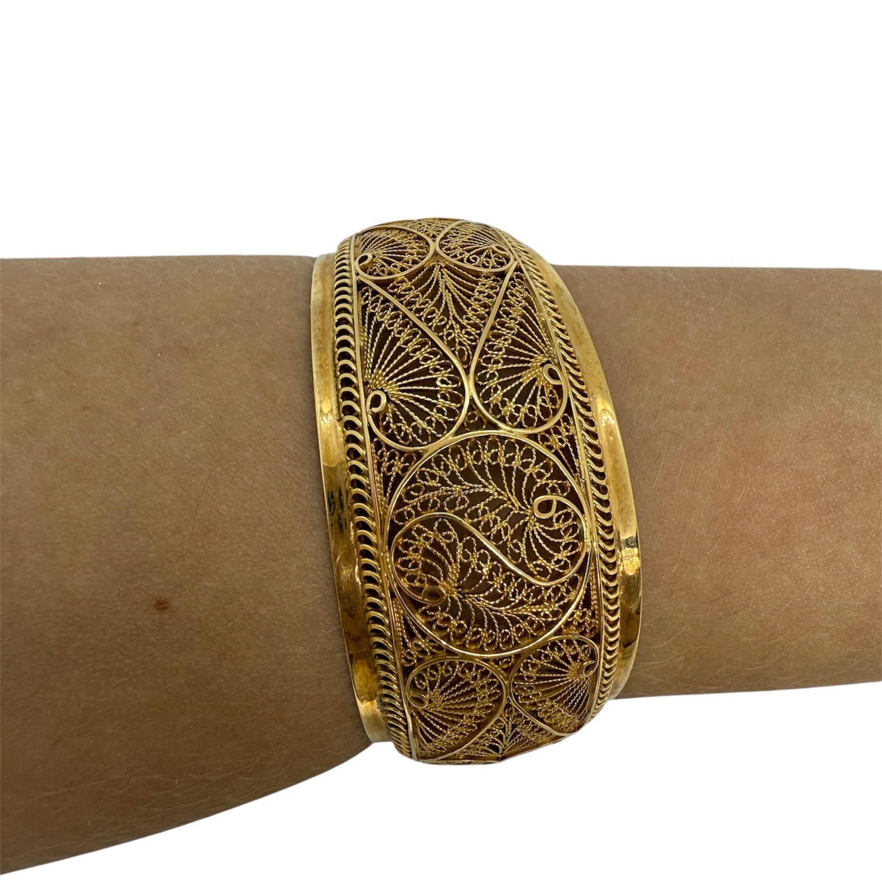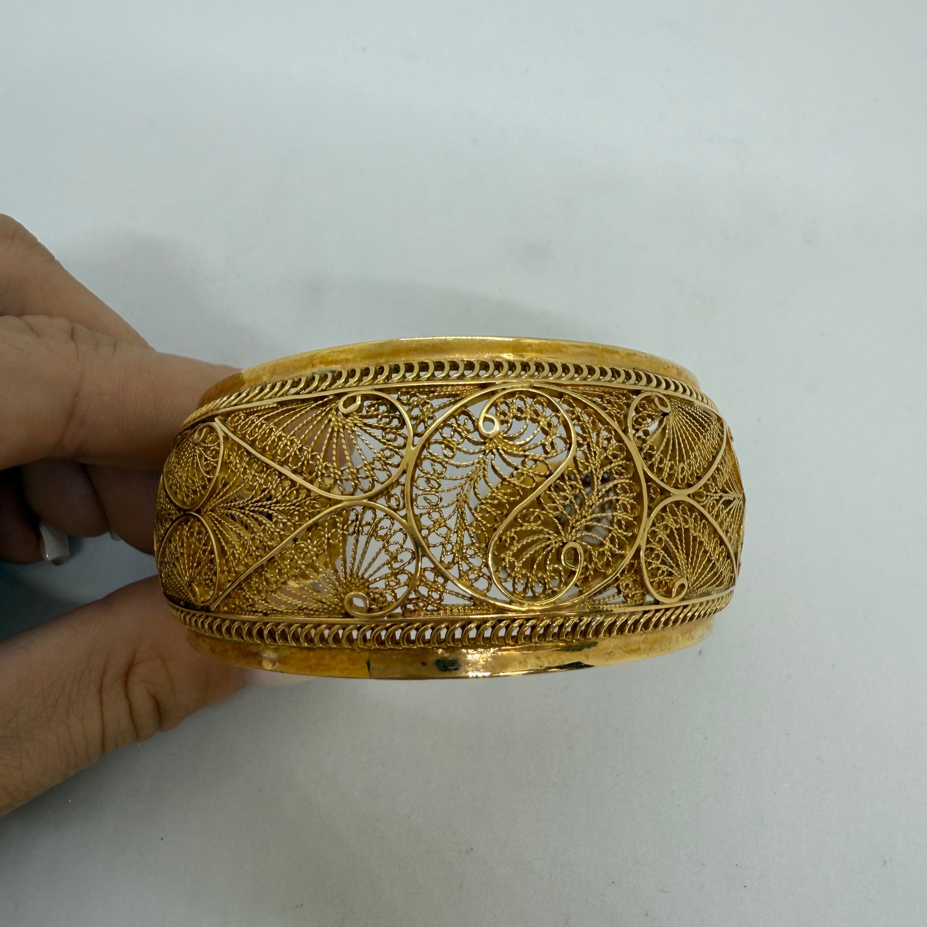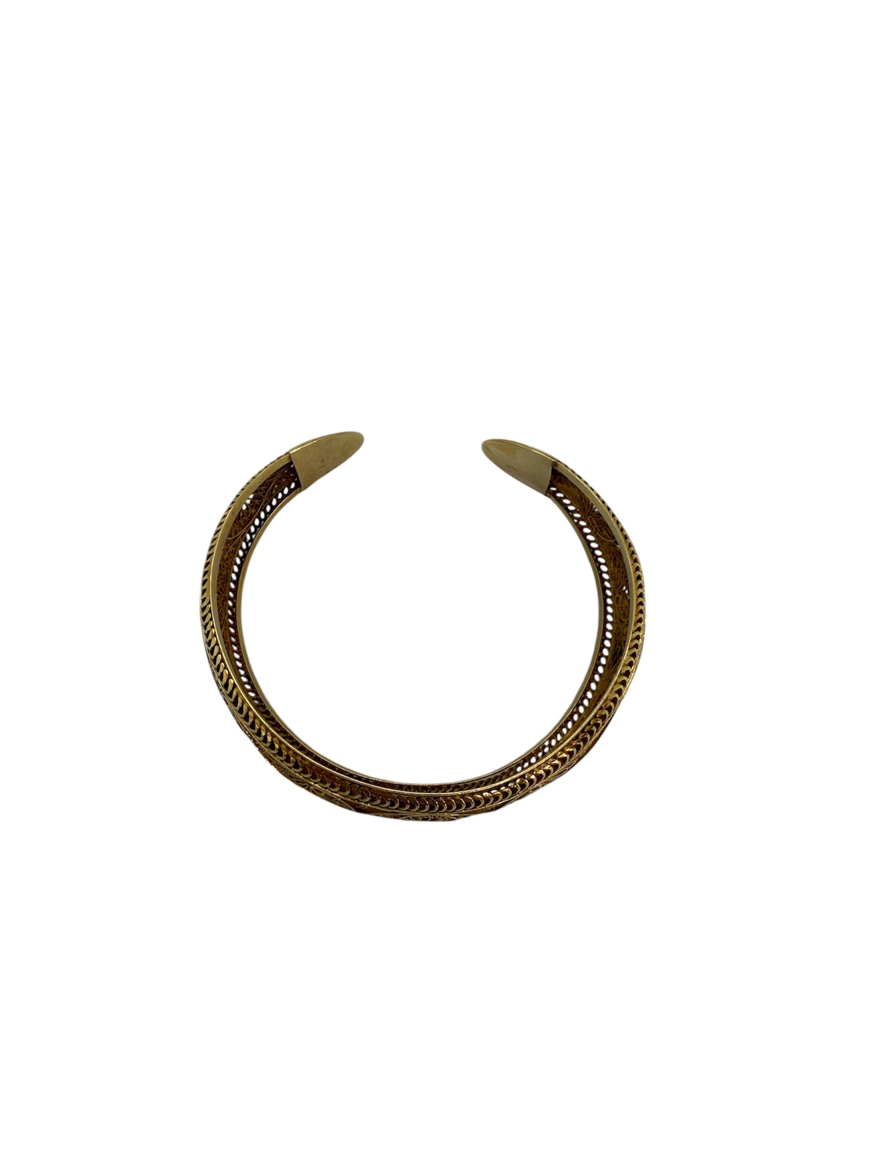 Bracelet jonc en or jaune 18 carats (750/1000), sans poinçon, arborant une élégante maille dentelle. Il mesure 6 cm de diamètre, avec une largeur de 3 cm et une épaisseur de 2 mm, pour un poids total de 30,86 grammes. Ce modèle rigide sans fermoir se distingue par son design ajouré et raffiné. Il est proposé en très bon état général.