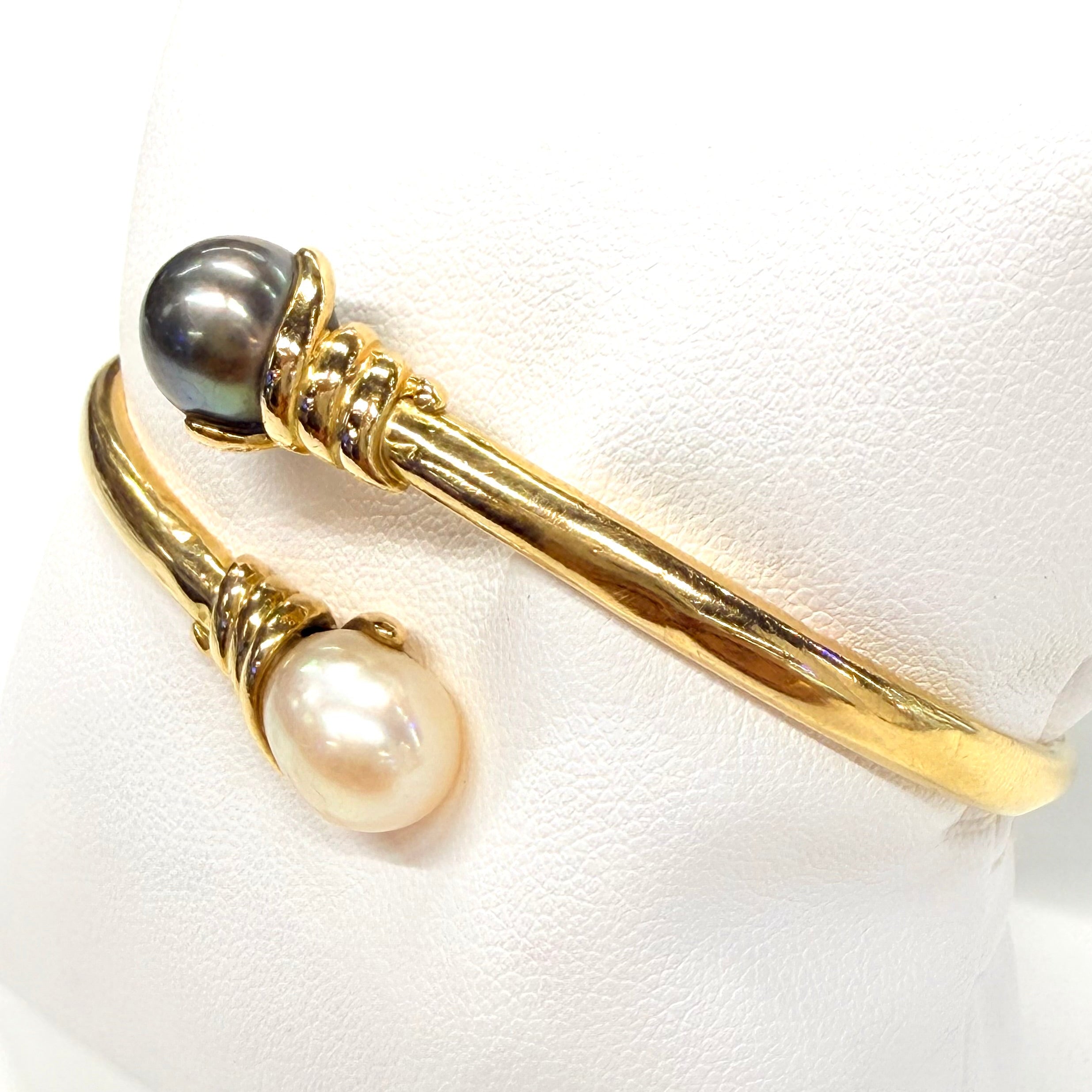 Jonc ouvert en or jaune 750/1000, orné de deux perles : une perle d’eau douce et une perle de Tahiti, chacune de 0,9 cm. Avec un poids de 11,76 g, un diamètre de 6 cm, une largeur de 0,4 cm et une épaisseur de 0,3 cm, il offre un porté élégant et confortable.
