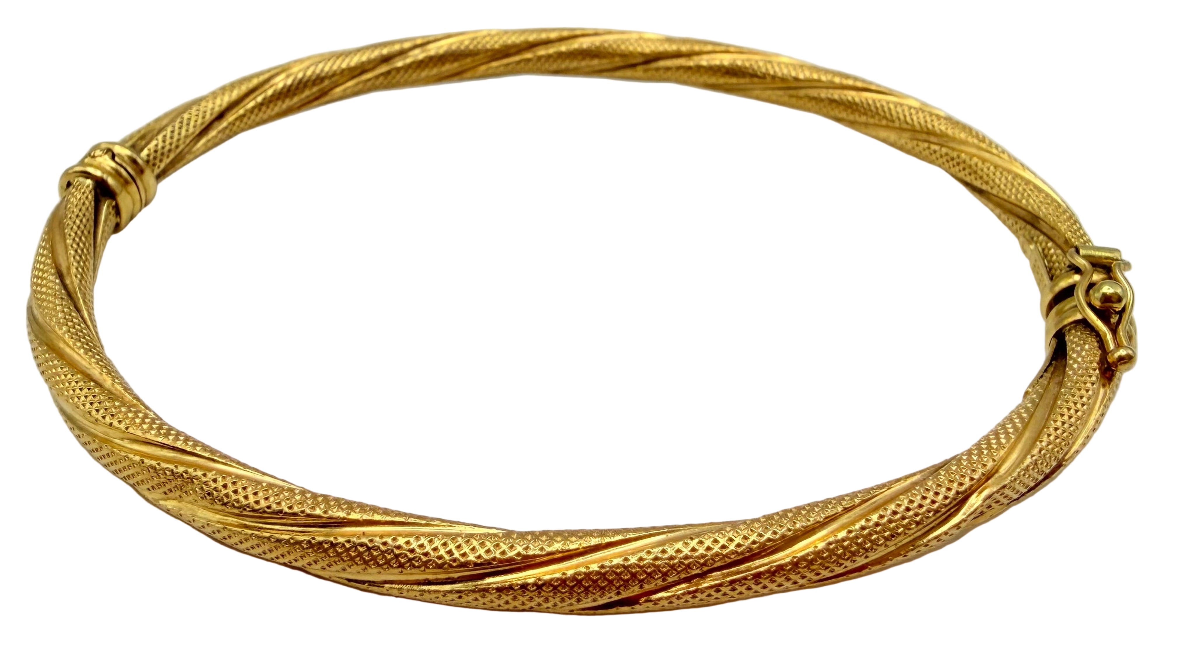Bracelet jonc en or jaune 18 carats, poinçon 750, d’un poids de 7,38 g, mesurant 5 × 6,5 cm avec une épaisseur de 0,3 cm.