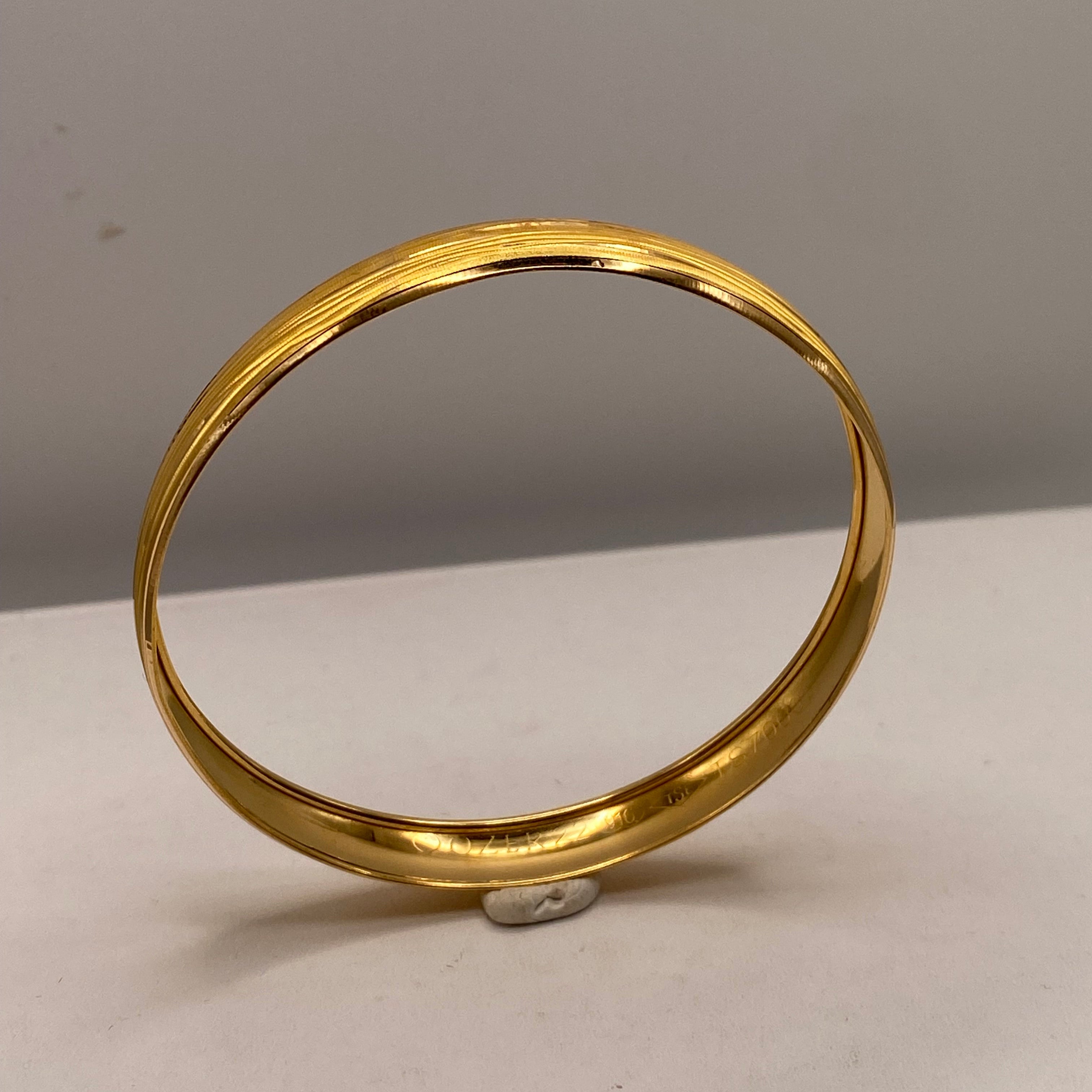 Bracelet jonc rigide en or jaune 22K  poinçonné "Ozer 22 916 TSE7000". Maille ciselée sans fermoir. Diamètre : 5 cm, largeur 1 cm, épaisseur de 1 à 2 mm. Poids : 10,89 g. Très bon état.