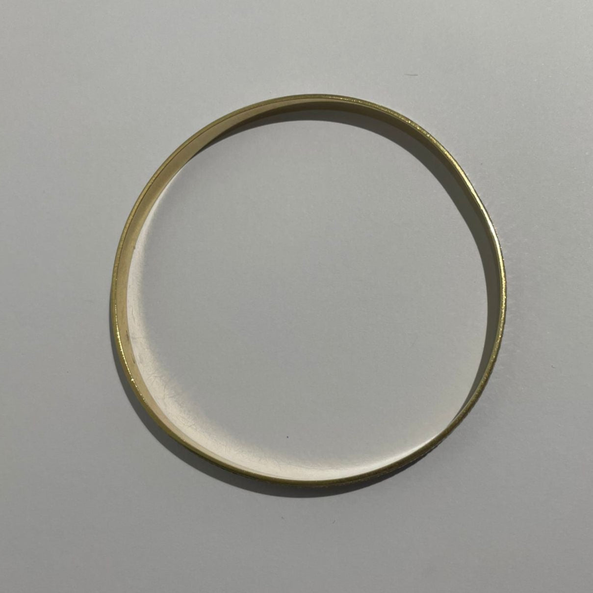 Bracelet jonc en or jaune 18 carats (750/1000), poinçonné 750, au design lisse. Il pèse 13,62 grammes et mesure 6,5 cm de diamètre avec une épaisseur de 0,1 cm. Il est orné d’un oxyde de zirconium et se ferme par un système à cliquet avec anneau ressort. Très bon état.