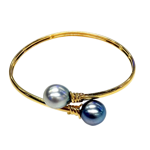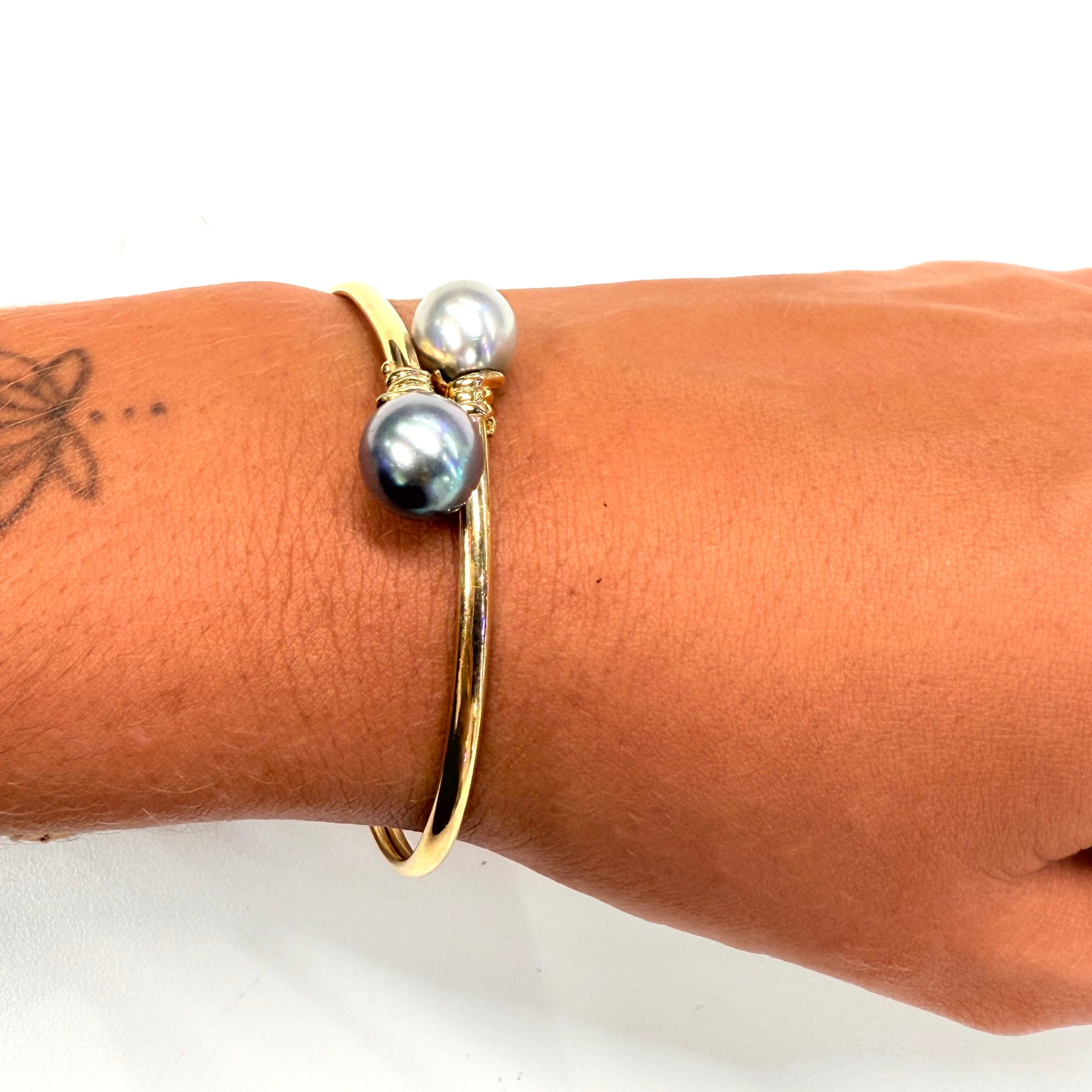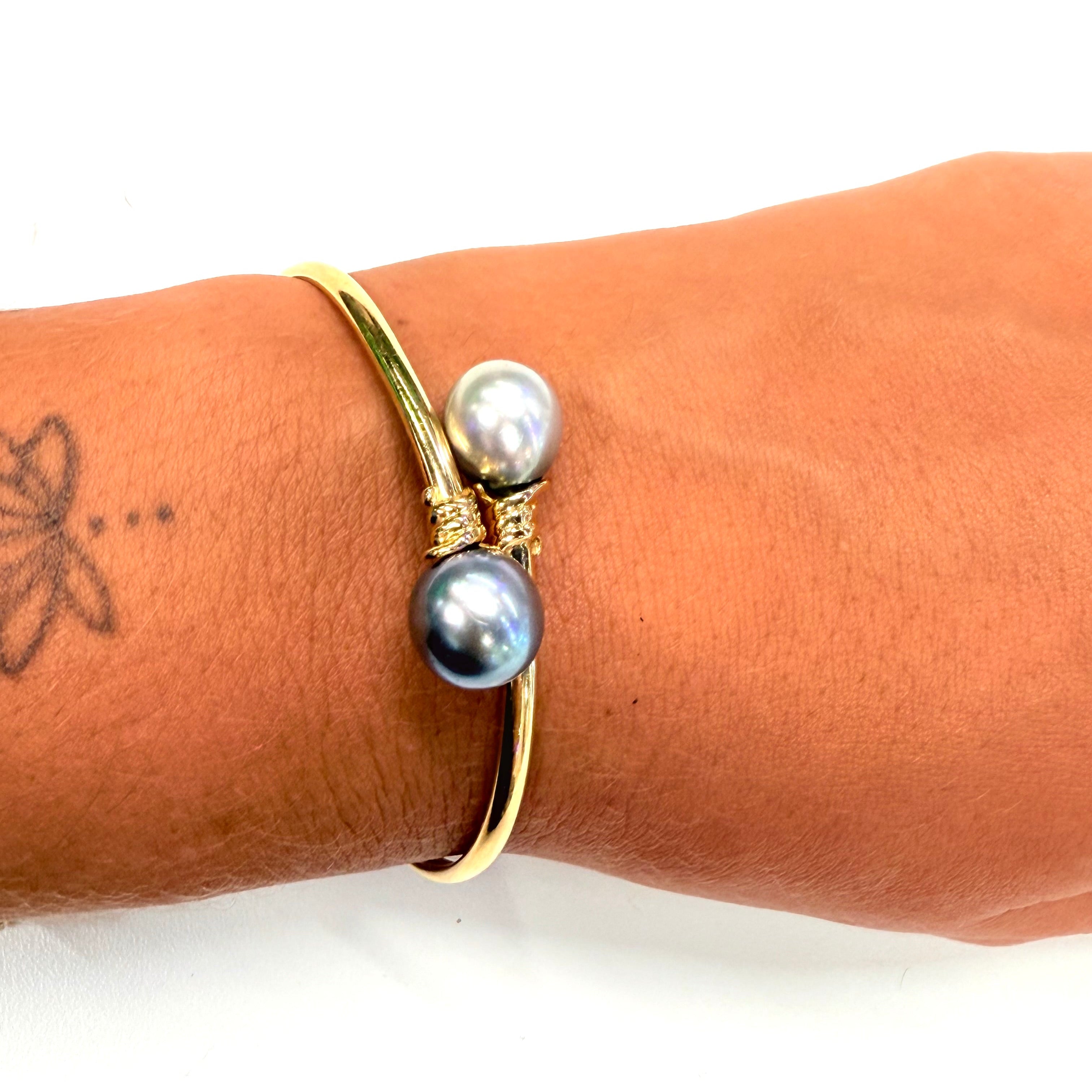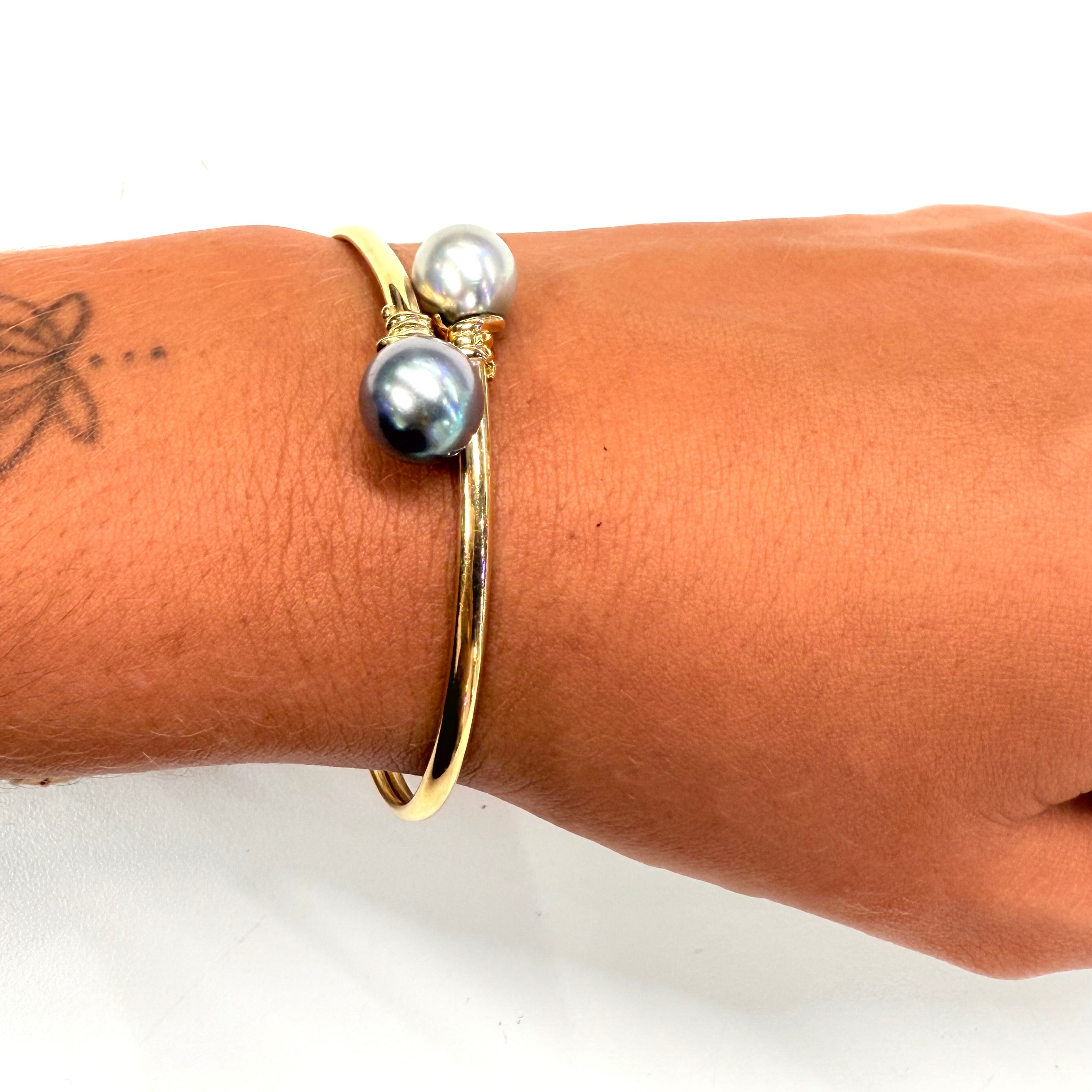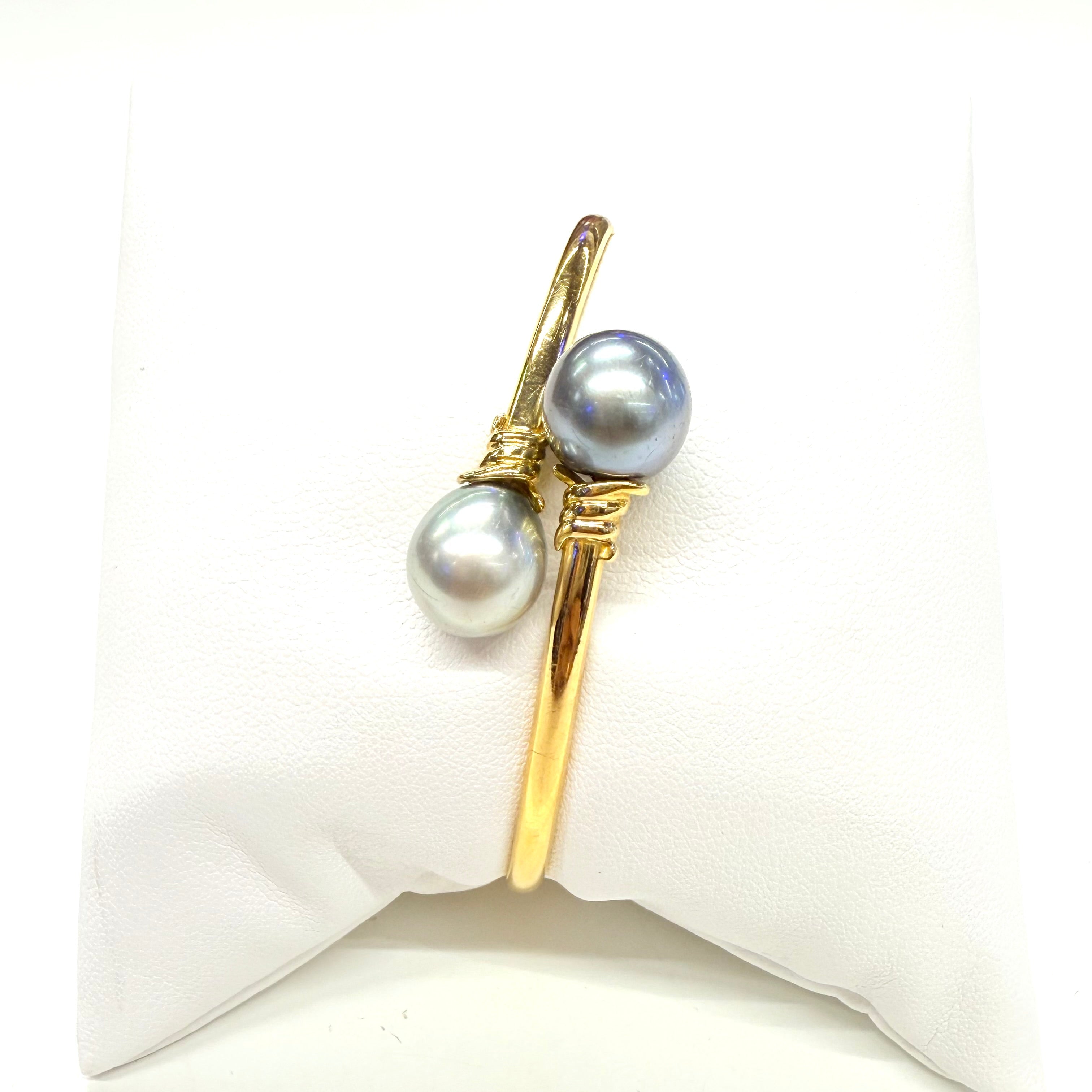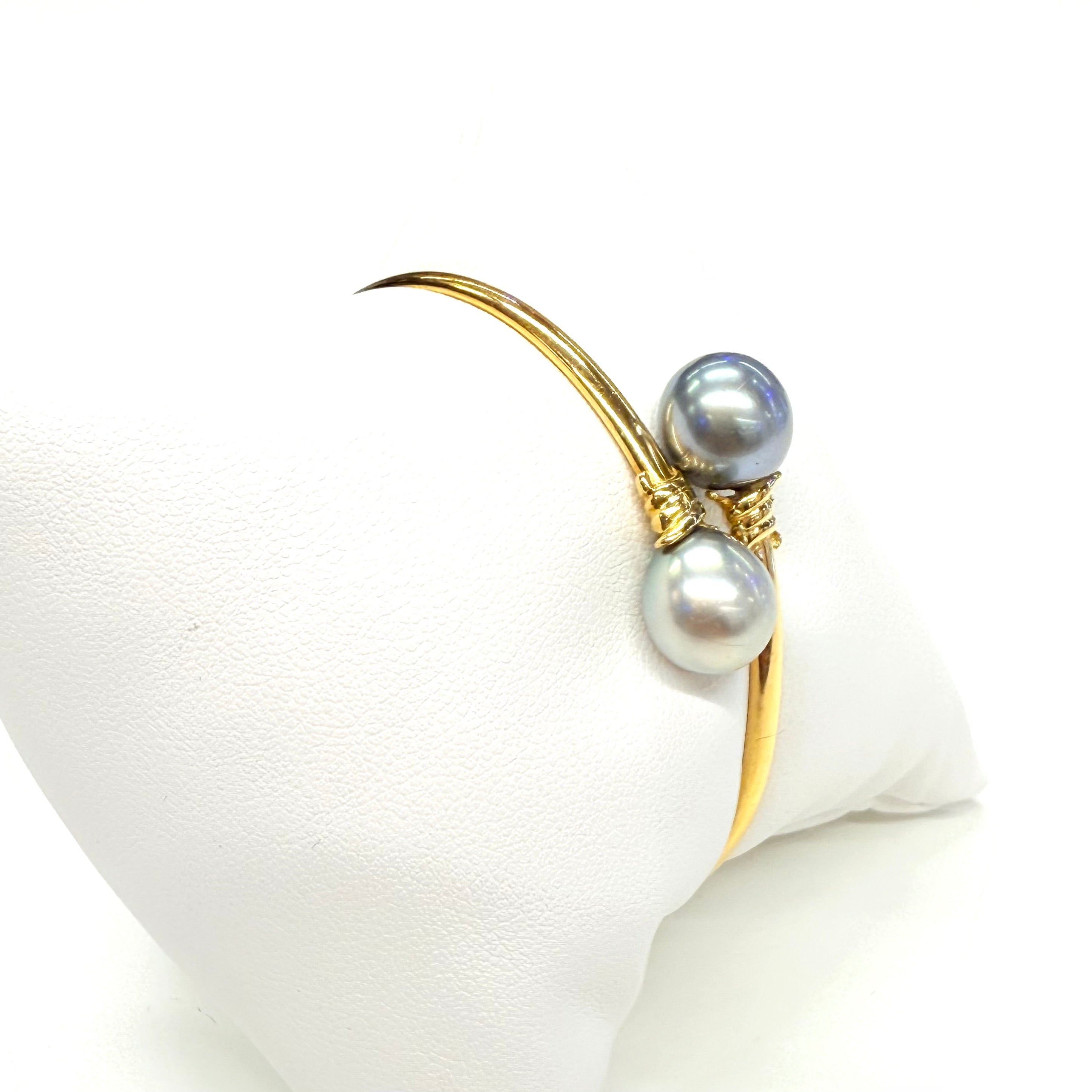 Bracelet jonc ouvert en or jaune 18K (750/1000) de 9,20 g, orné de deux perles de Tahiti de 0,9 cm. Élégant et intemporel, il est en très bon état et parfait pour sublimer votre style.