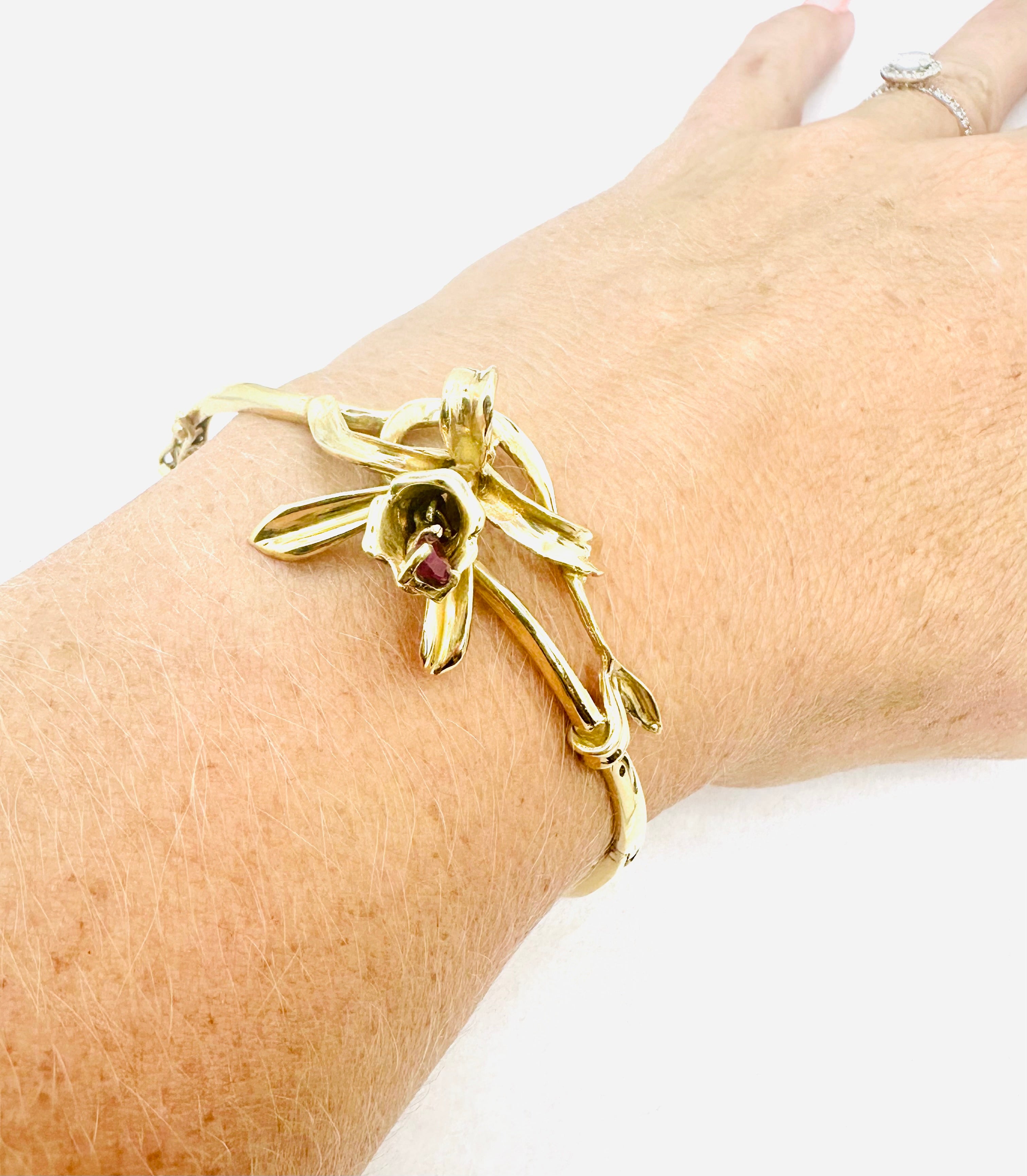 Ce superbe jonc Fleur de Vanille en or jaune 18K (750/1000) est un bijou élégant qui combine le raffinement de l'or jaune avec la splendeur des rubis. Avec un poids de 17g, une longueur de 6 cm et une largeur de 5 cm, il offre un confort et un style parfaits. Le fermoir à cliquet assure une fermeture sécurisée, tandis que la pierre rubis ajoute une touche de couleur et de brillance.