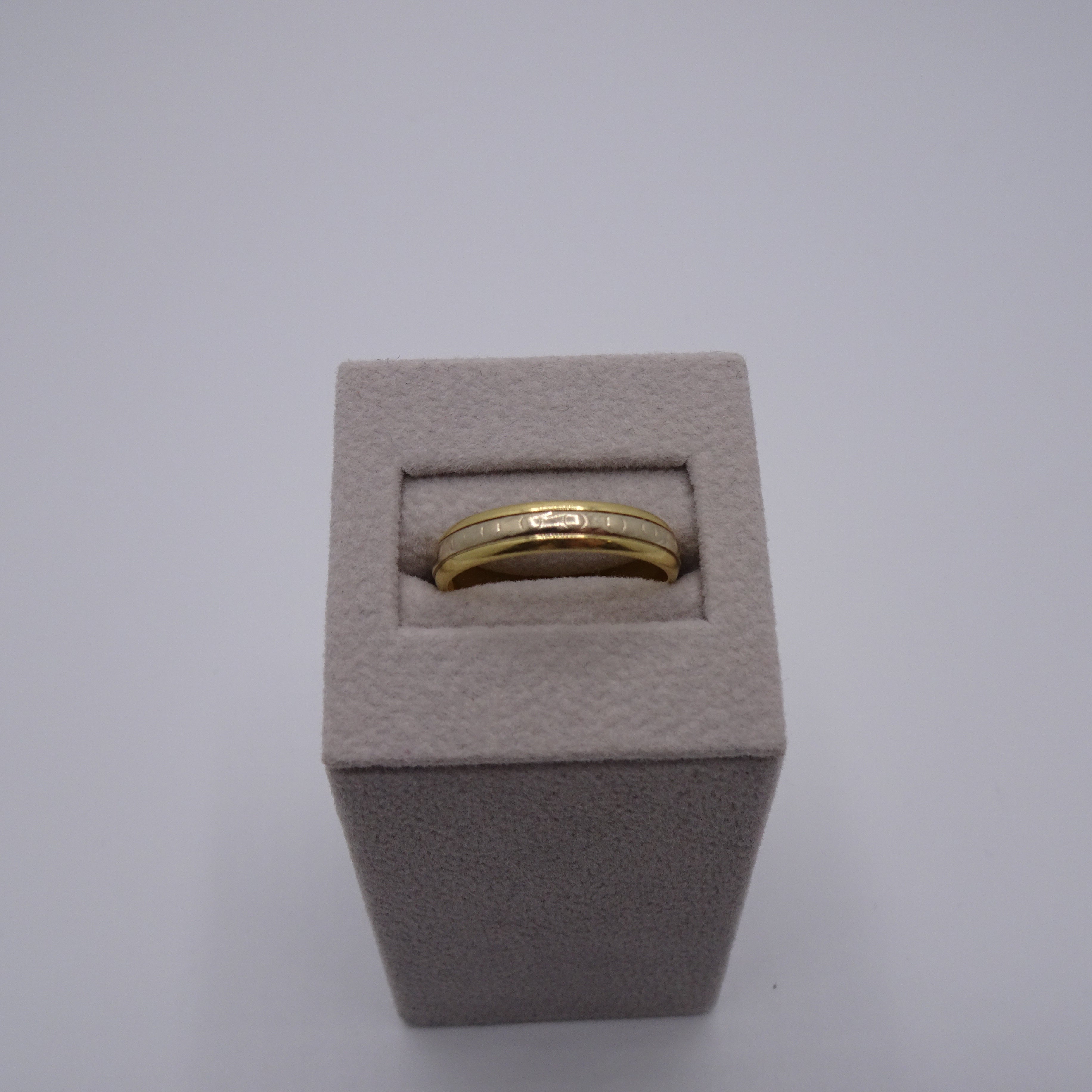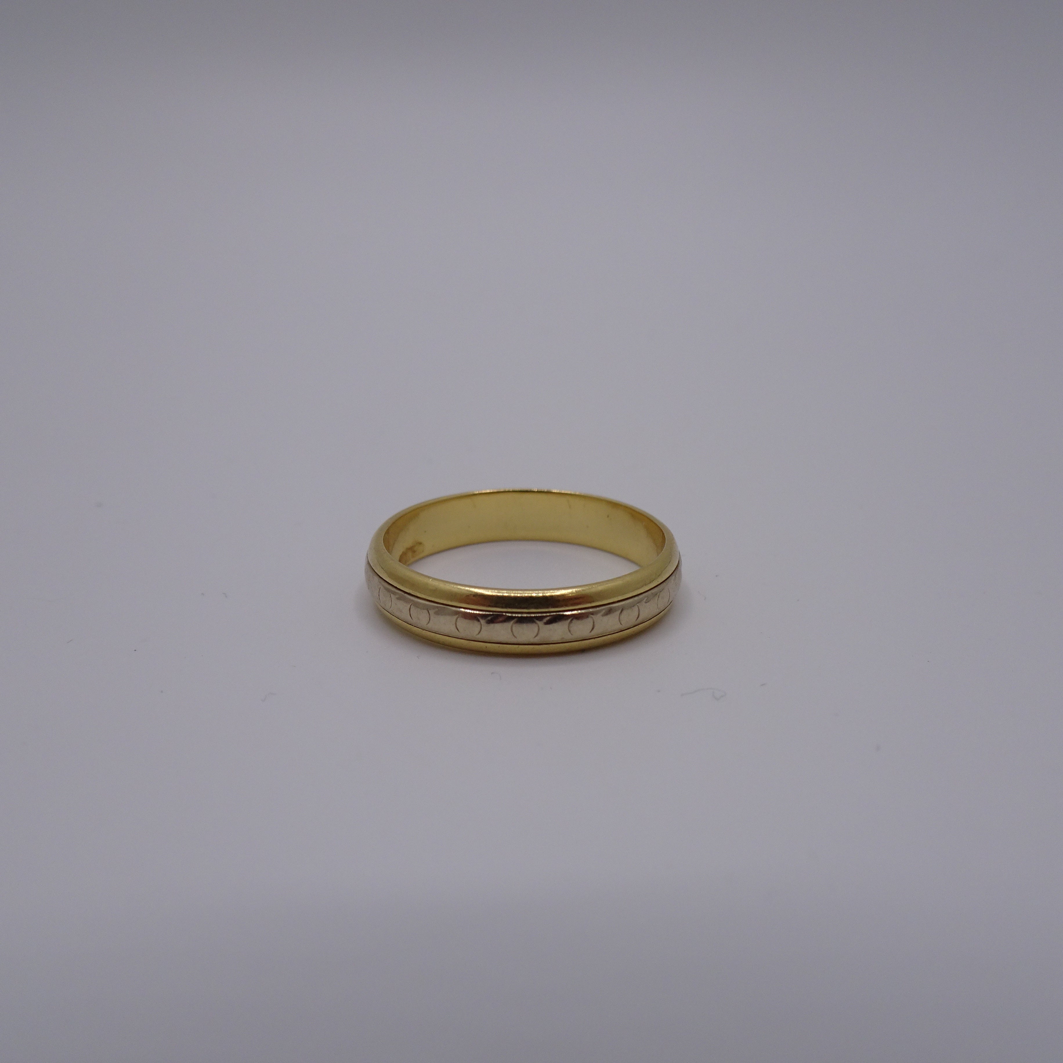Alliance en or jaune et or blanc 18 carats (750/1000), au design intemporel et raffiné. Elle pèse 3,65 g, est de taille 56 et porte le poinçon 18K. Ce modèle sans pierres se distingue par son élégance sobre et sa belle finition. L’alliance est en très bon état, idéale pour symboliser un engagement ou compléter une collection de bijoux classiques.
