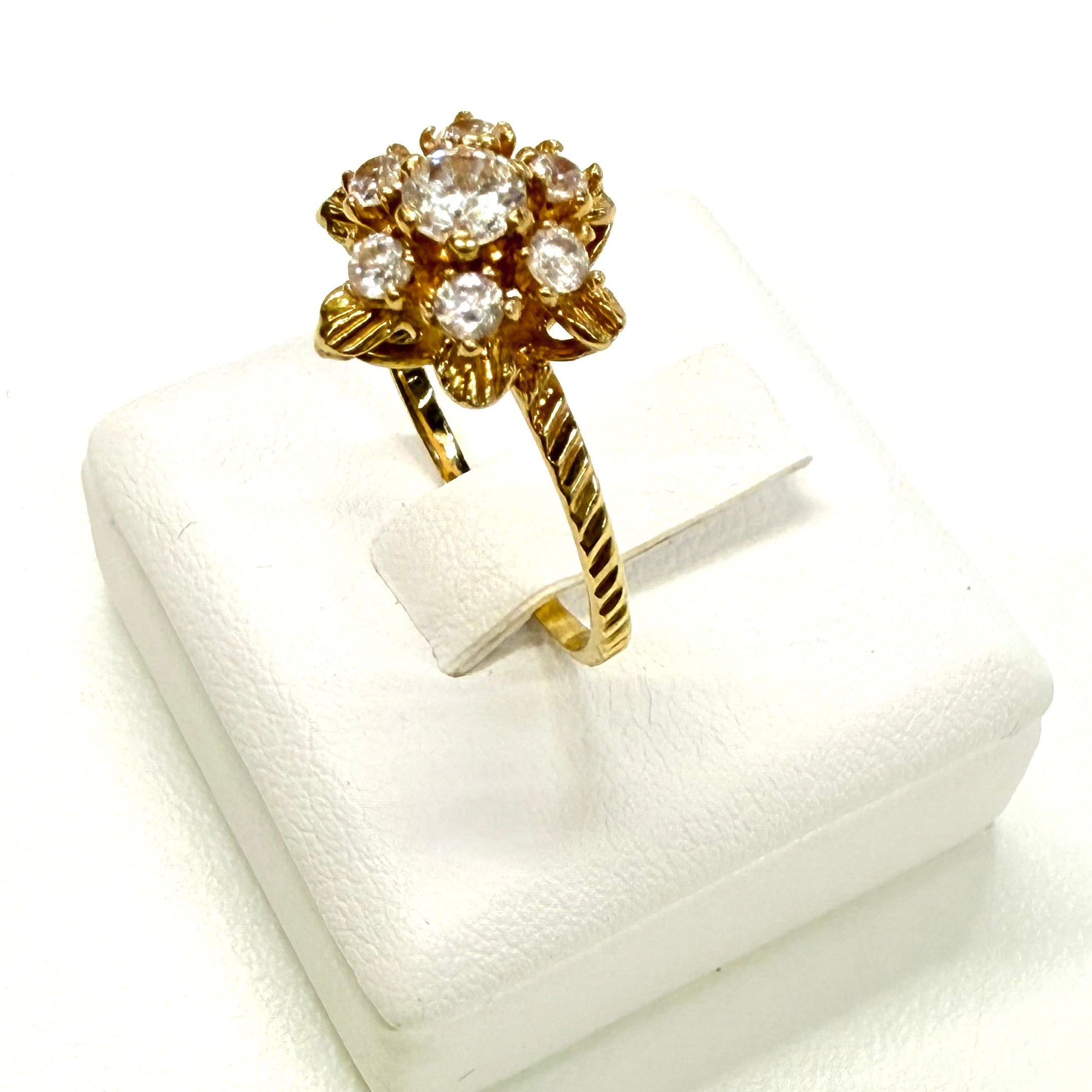 Bague chou en or jaune 750/1000, sertie de 7 oxydes de zirconium. Poids : 2,64 g – Taille : 56. Un bijou raffiné et lumineux en très bon état.
