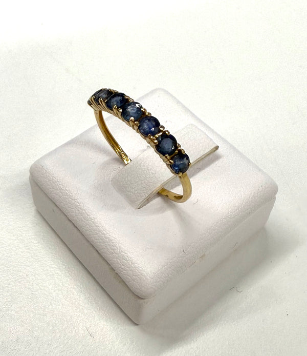 Bague demi-tour en or jaune 18 carats (750/1000), poinçonnée 750, d’un poids de 1,26 gramme et en taille 56. Elle est sertie de 7 saphirs de 0,3 cm chacun, offrant une touche de couleur élégante. Le bijou est en très bon état.