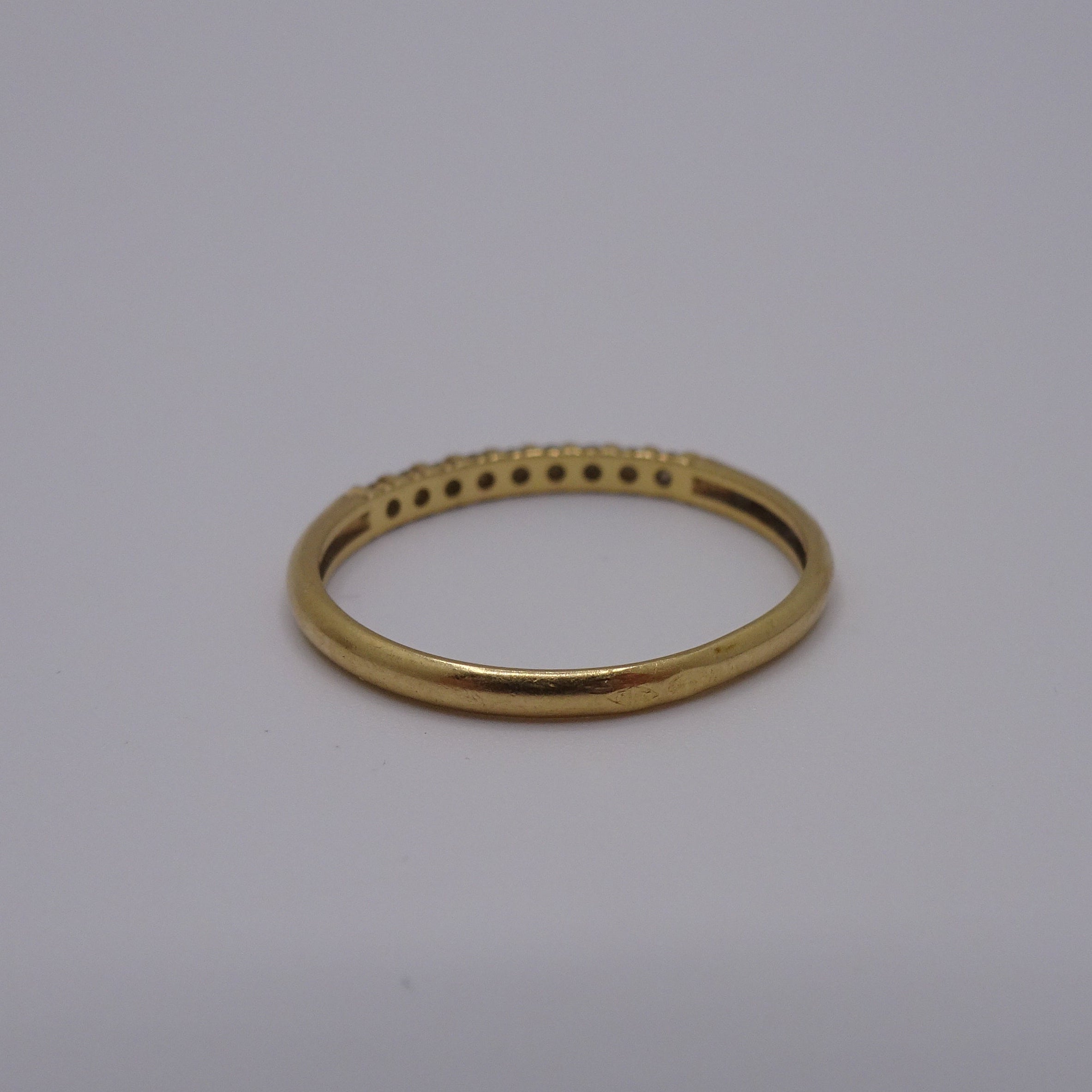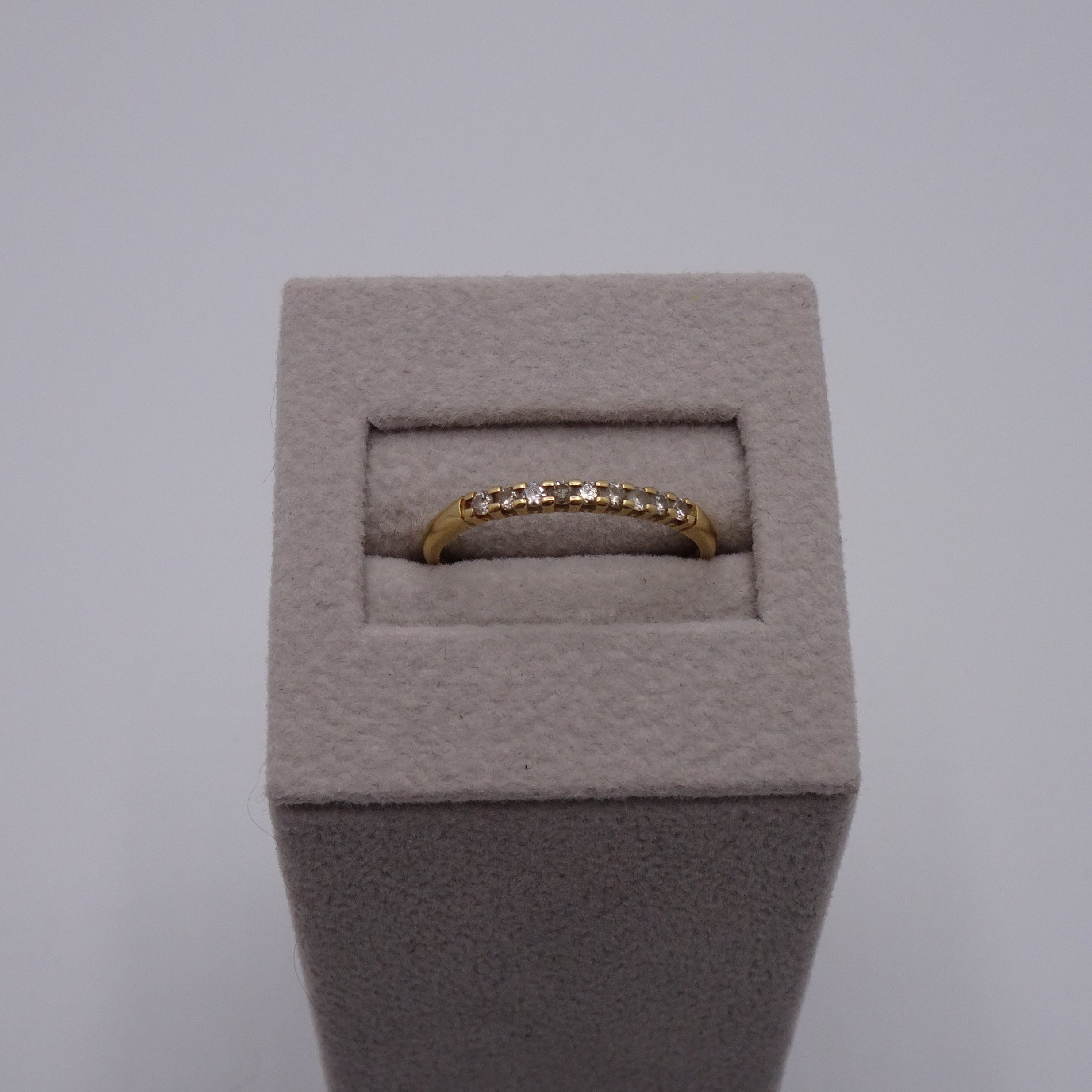 Bague demi-tour en or jaune 18 carats (poinçon tête d’aigle 750/1000), ornée de 9 diamants taille brillant. Elle pèse 0,94 gramme et est de taille 52. Ce bijou est en très bon état.