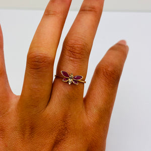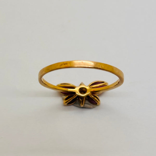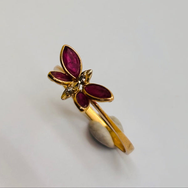 Elle est ornée de quatre rubis et deux petits diamants, offrant un joli contraste de brillance et de couleur. Avec une taille 57 et un poids de 1.73 grammes.