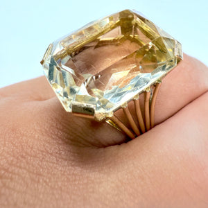 Bague empierrée en or jaune 18K (750/1000), poinçonnée tête d’aigle. Sertie d'une citrine éclatante (2,2 cm x 1,8 cm), cette pièce élégante pèse 11,47 g et est en très bon état. Taille 53.